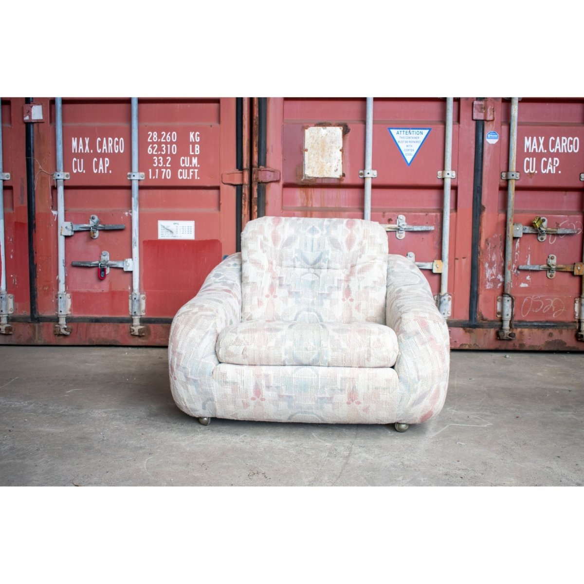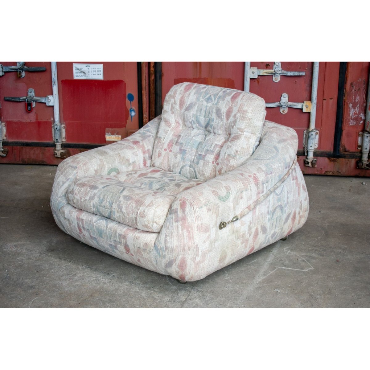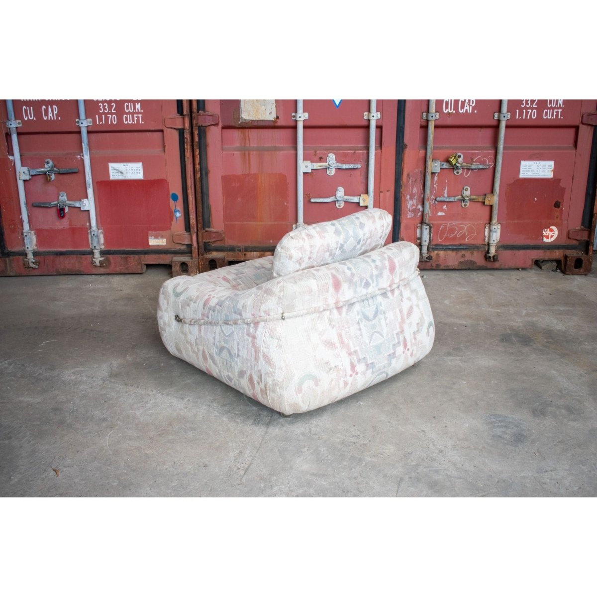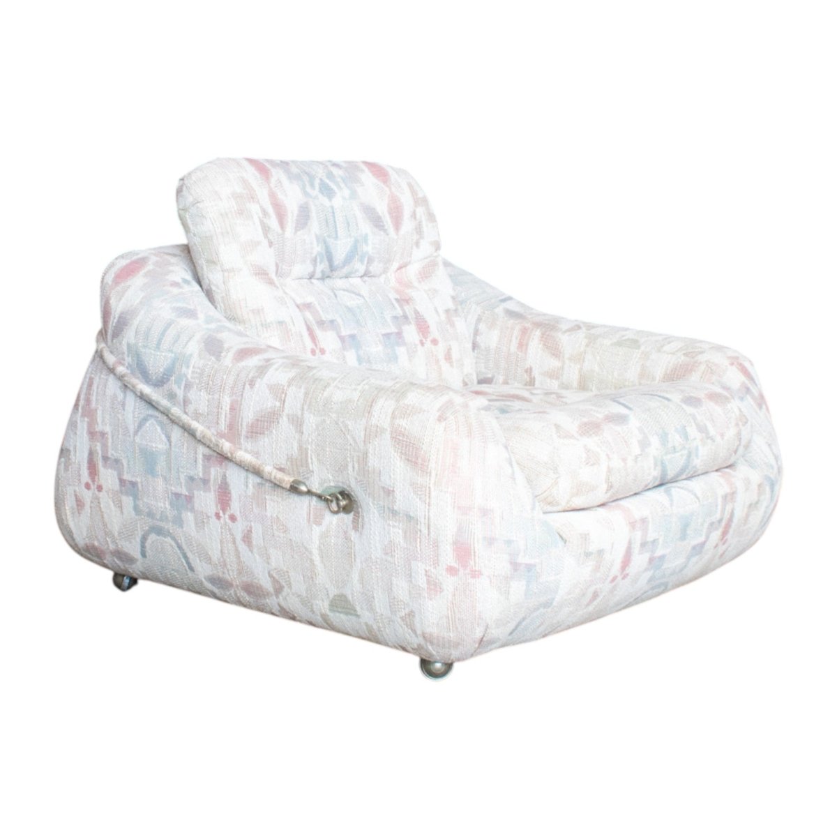 We imagine this chair may have started life in tanned leather — a 1960s lounge piece with club-room charm and sculptural proportions. Decades later, it was reupholstered in full pastel rebellion: a geometric swirl of pinks, blues, and beige that channels 1990s studio energy.