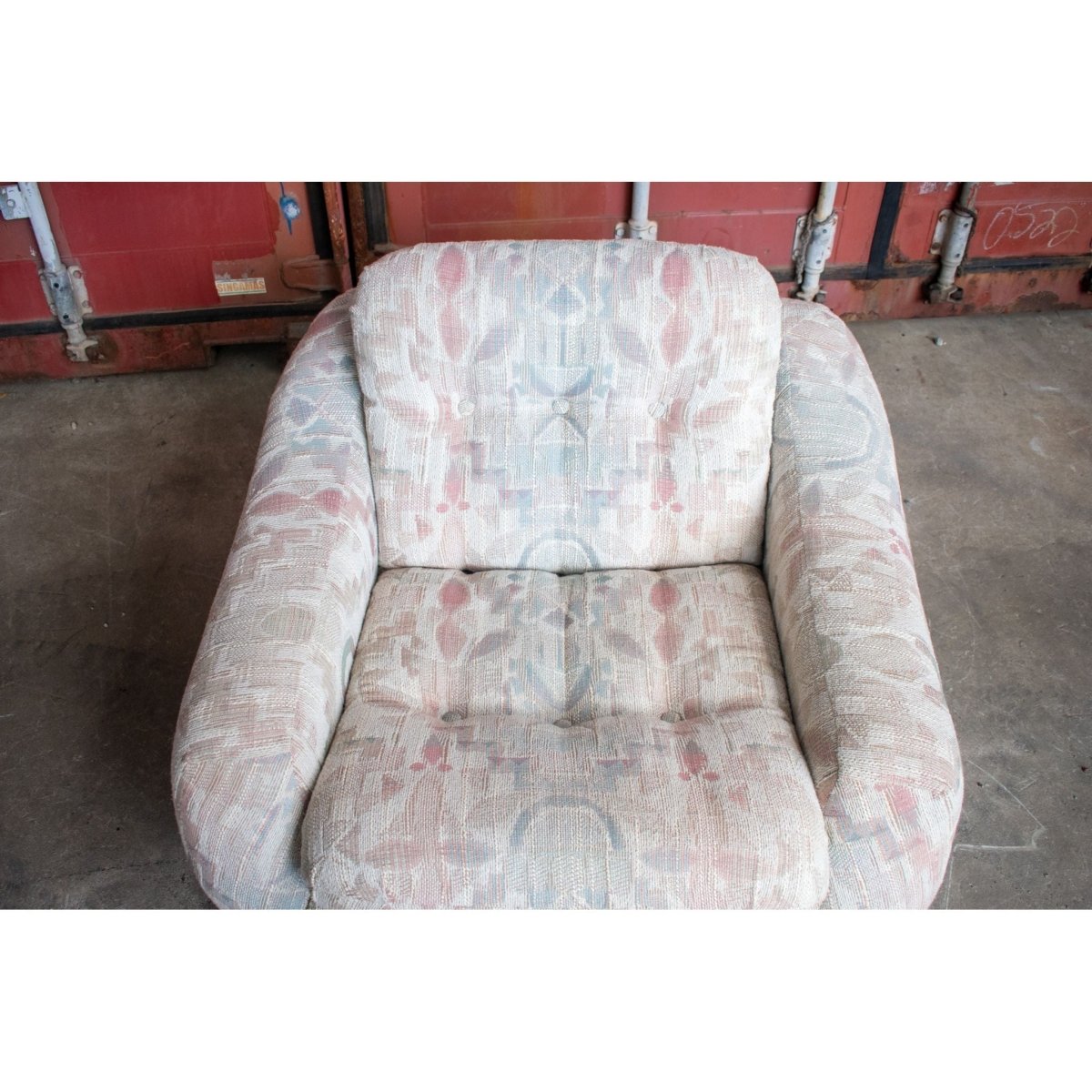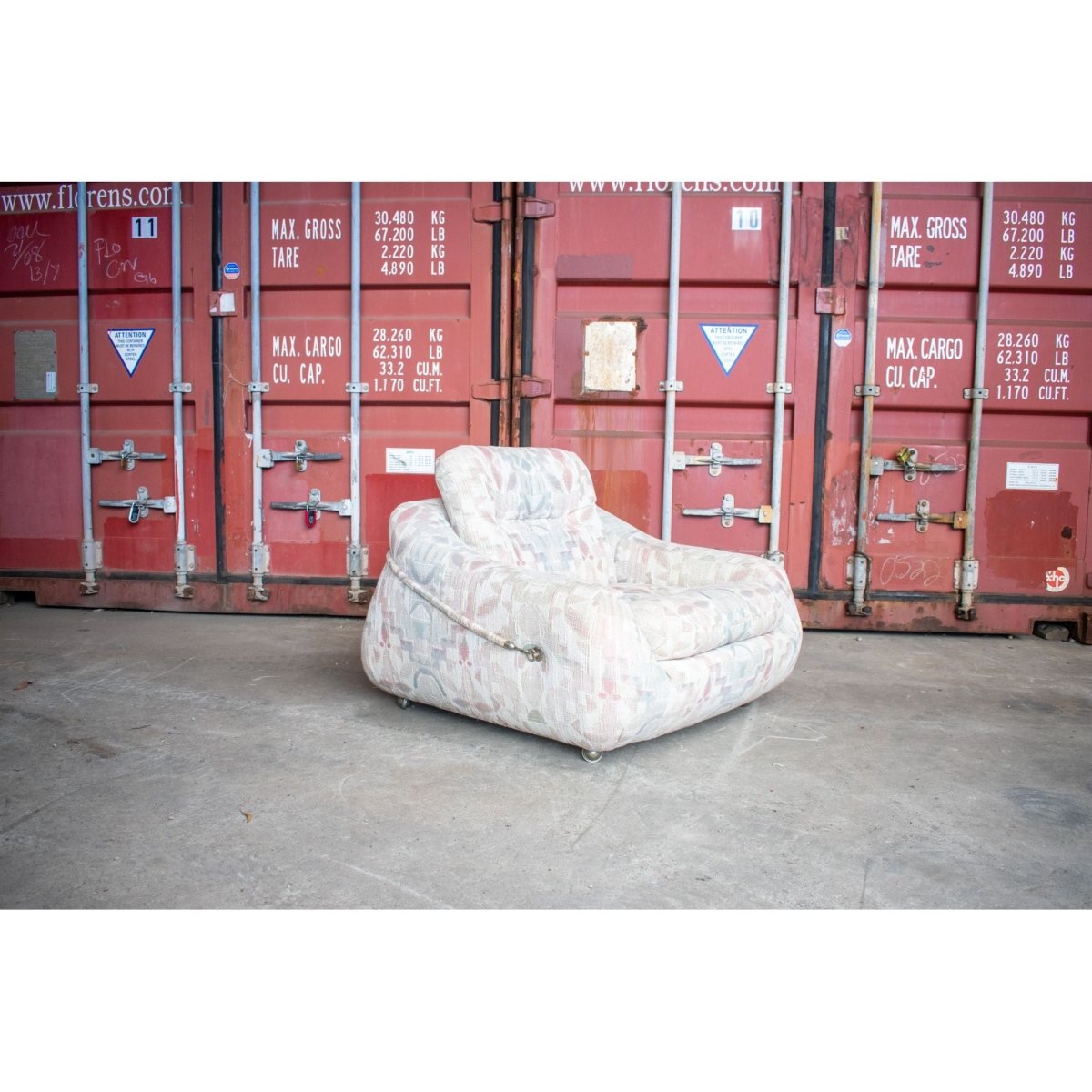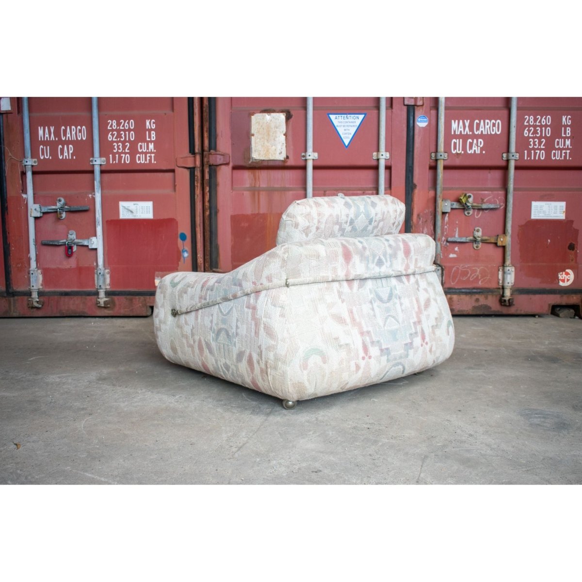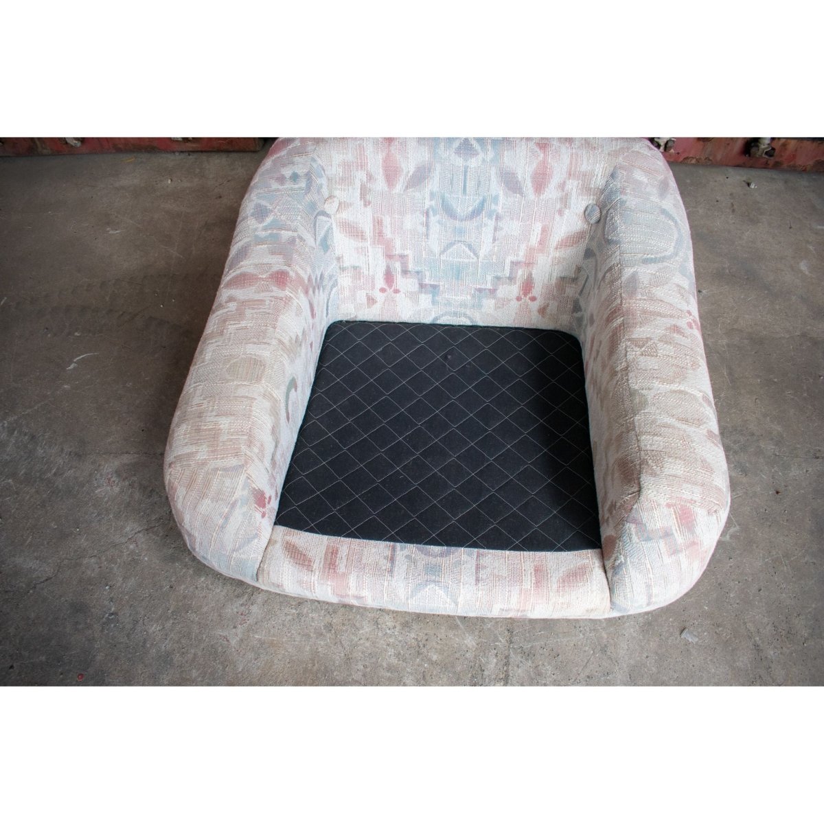We imagine this chair may have started life in tanned leather — a 1960s lounge piece with club-room charm and sculptural proportions. Decades later, it was reupholstered in full pastel rebellion: a geometric swirl of pinks, blues, and beige that channels 1990s studio energy.