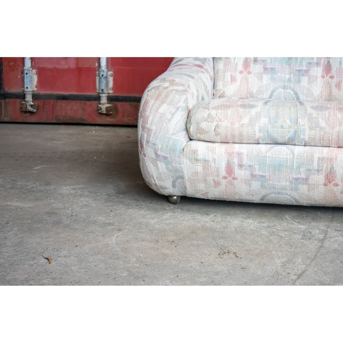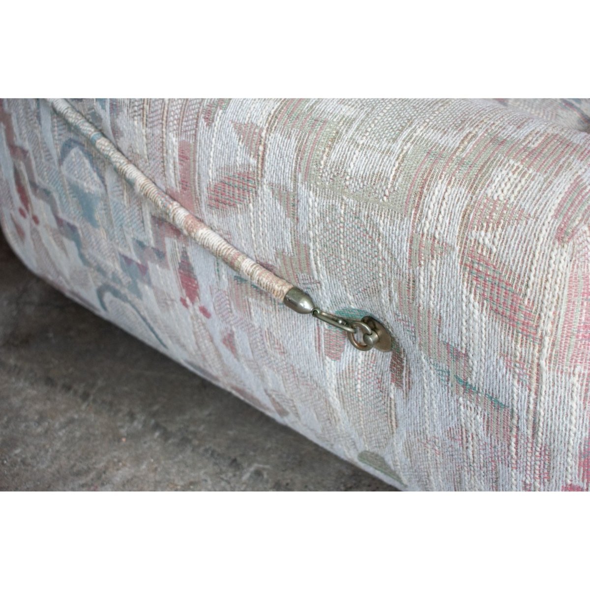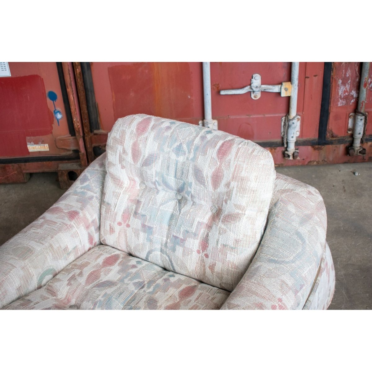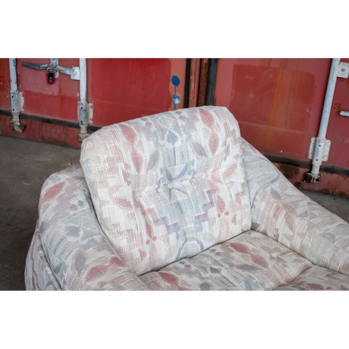 • Background: Mid-century Australian origin; reupholstered in pastel abstract fabric with piped edges and hook-secured cord detail