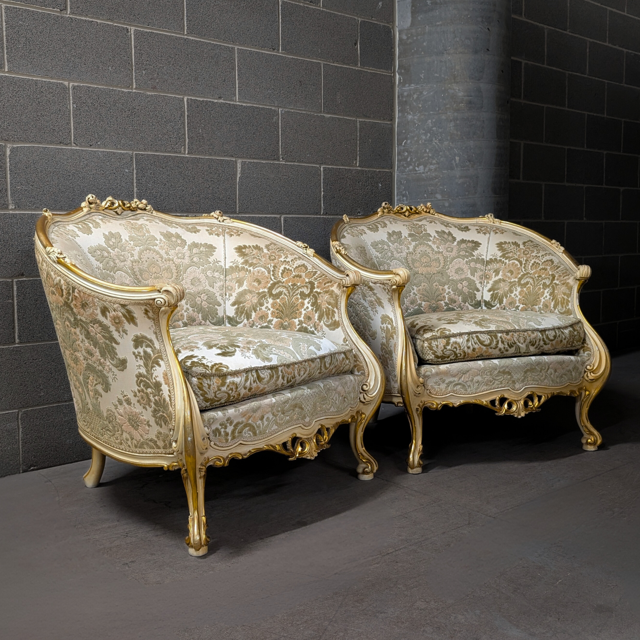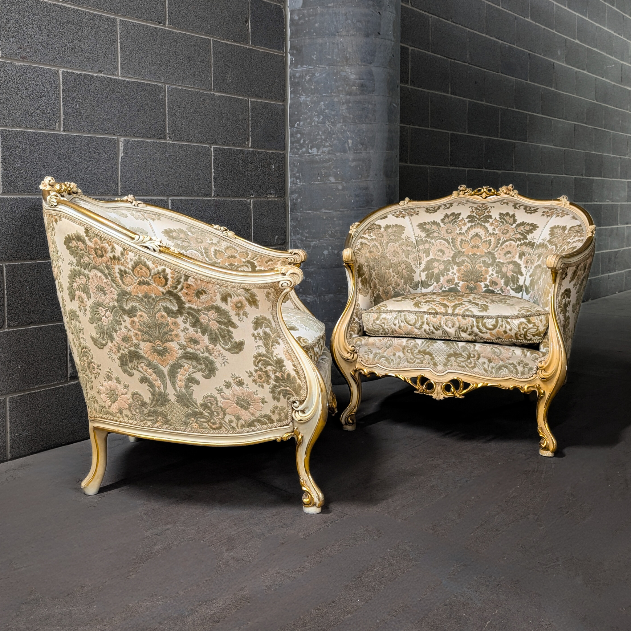Made in mid twentieth century France, the bergères follow the Louis XV Revival language shaped by curved frames, carved ornament and generous proportion. Original damask in greens and golds reflects the period style, while the gilt timber carries the warmth of hand finished work. The combination of sweep, scale and upholstery speaks to the French ateliers that produced these refined mid century interpretations of eighteenth century seating. This high quality Bergères pair deliver an old world richness with confidence.