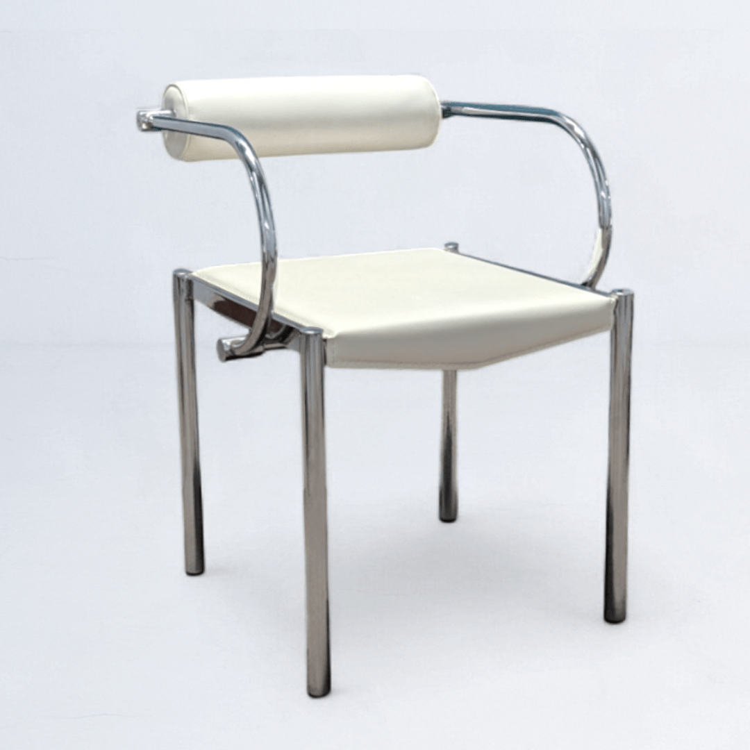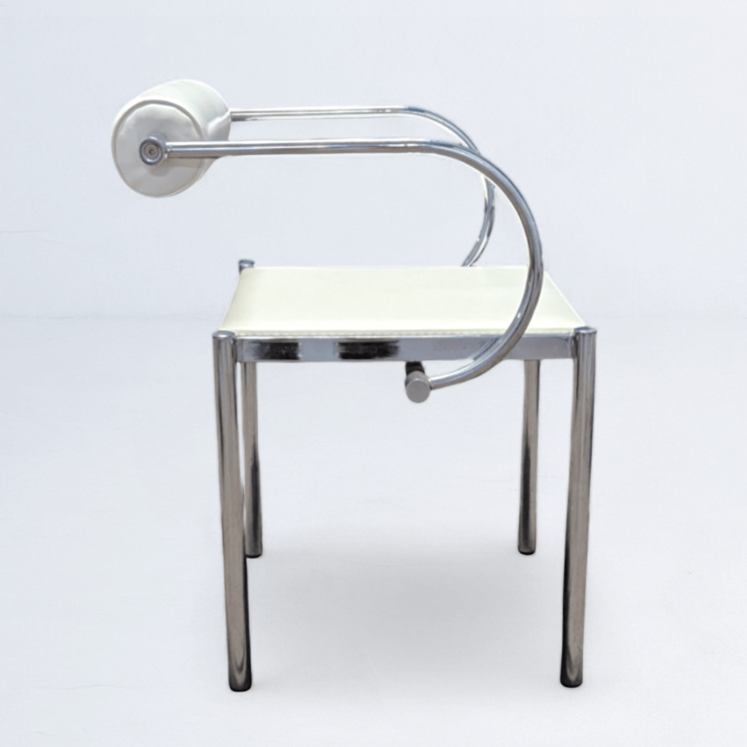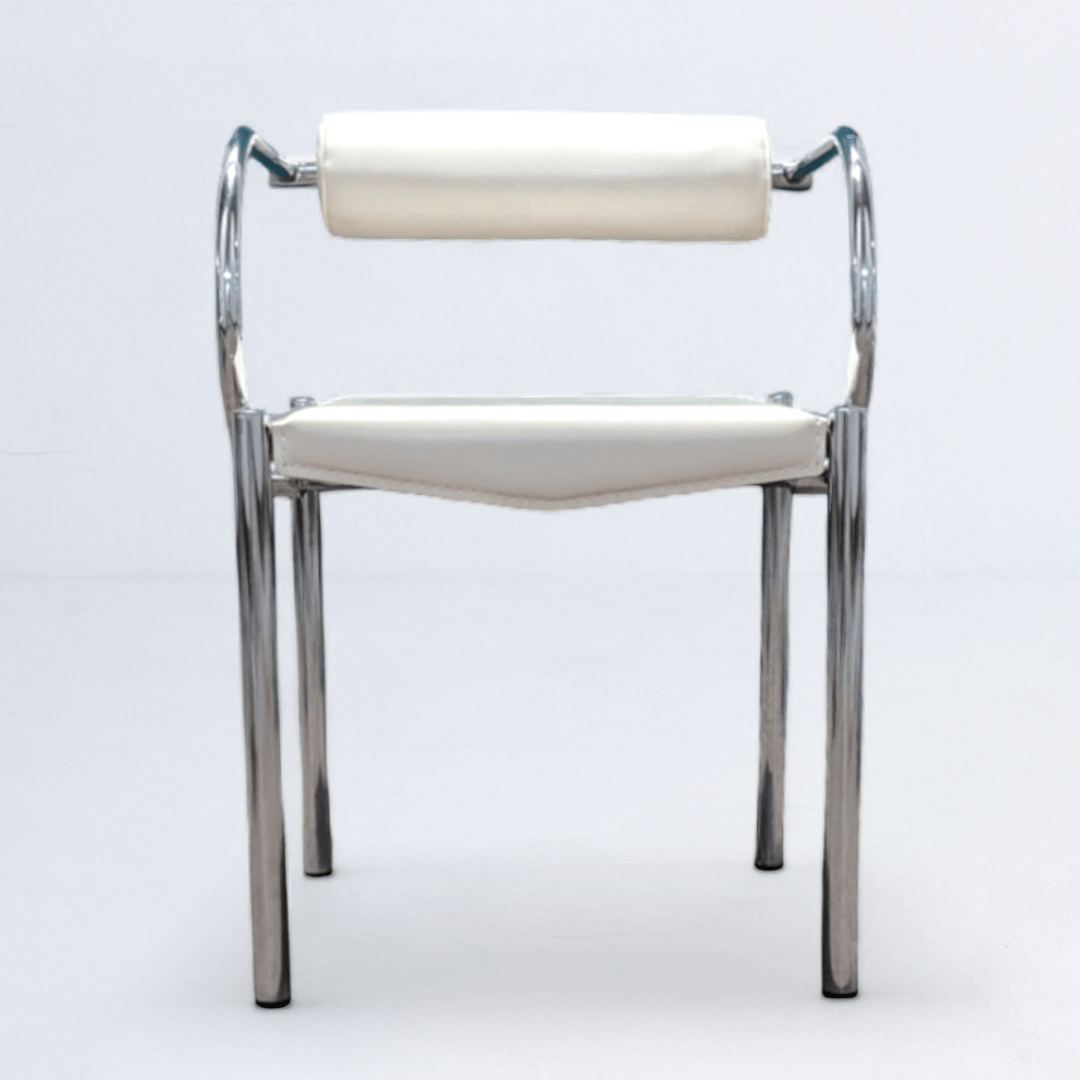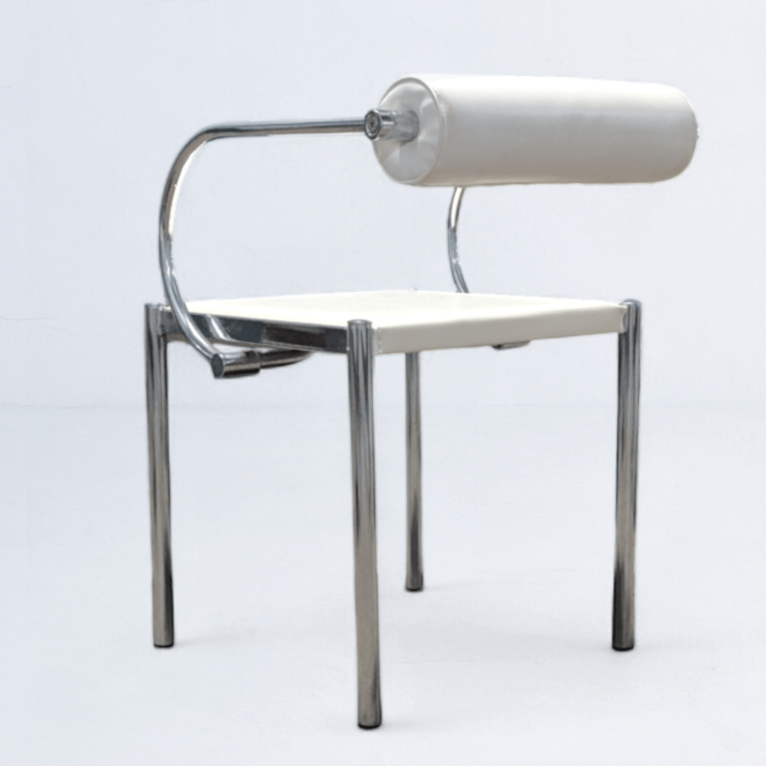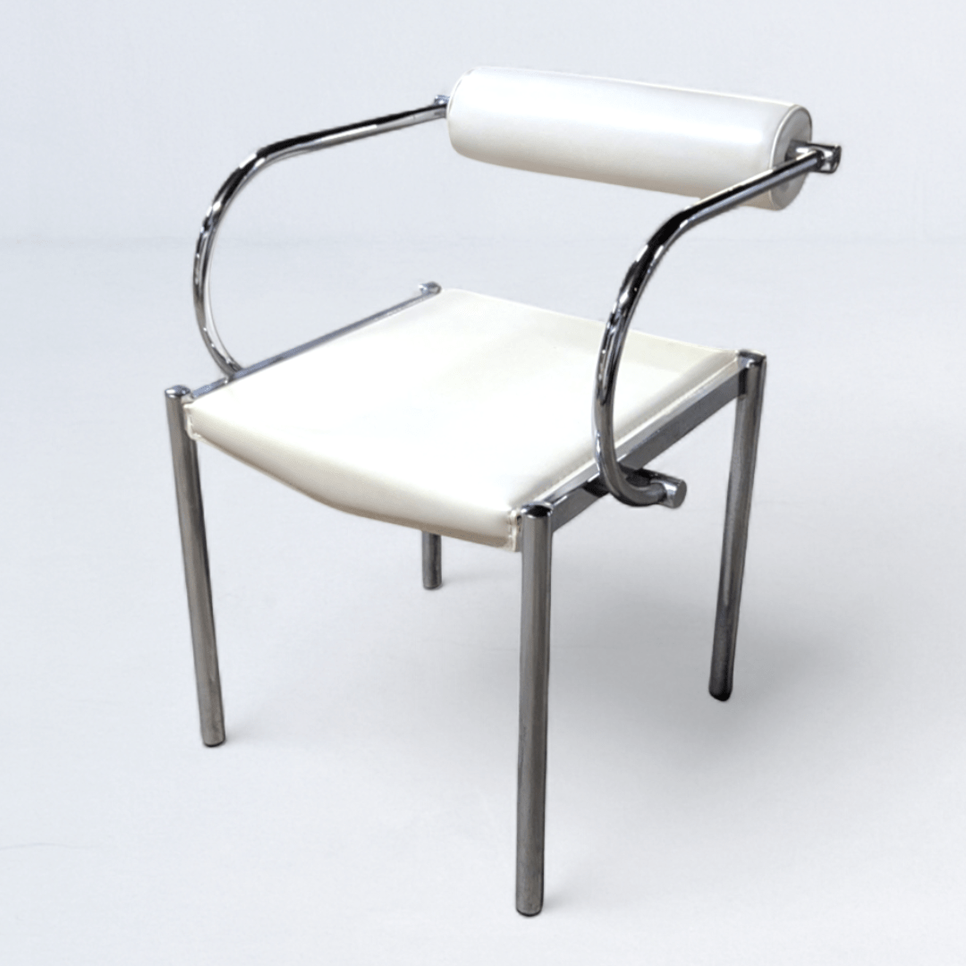 A rare accent chair combining white leather seats with cylindrical backrests in leatherette, carried by a tubular chrome frame. The design plays on contrast — soft curvature against linear steel — producing a piece that is both minimal and expressive.