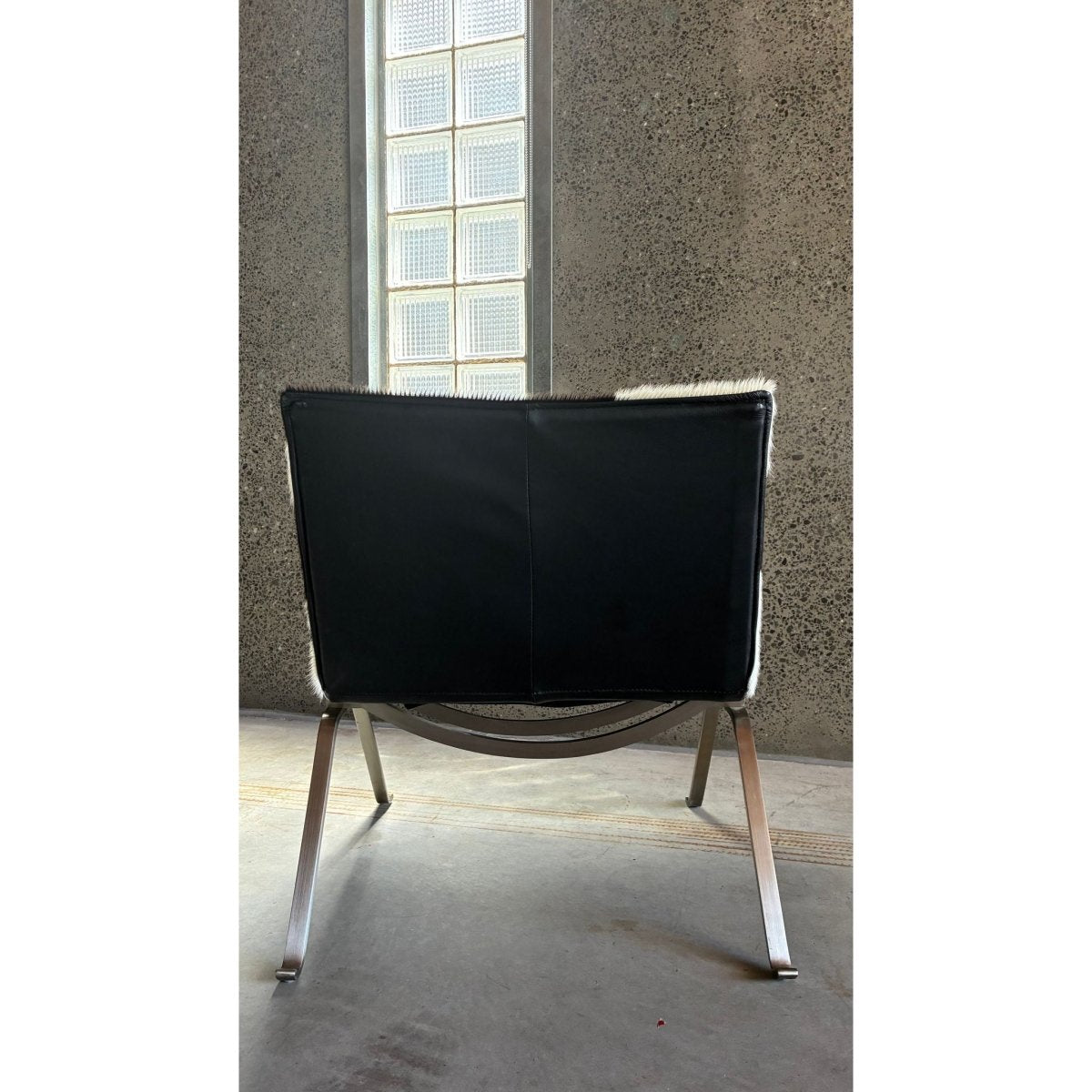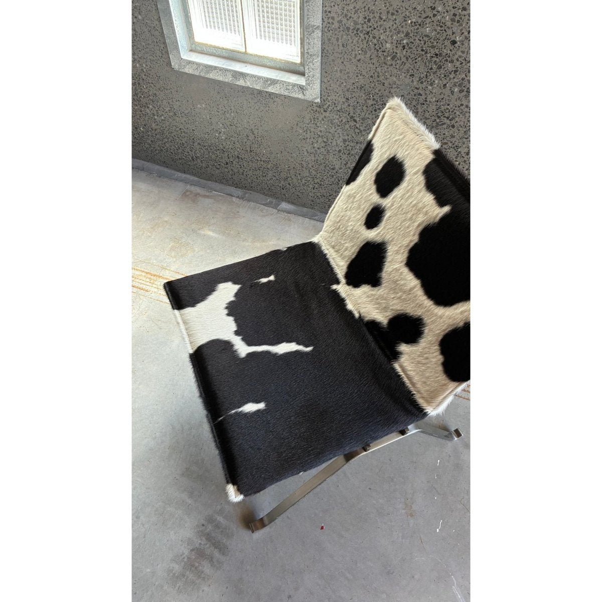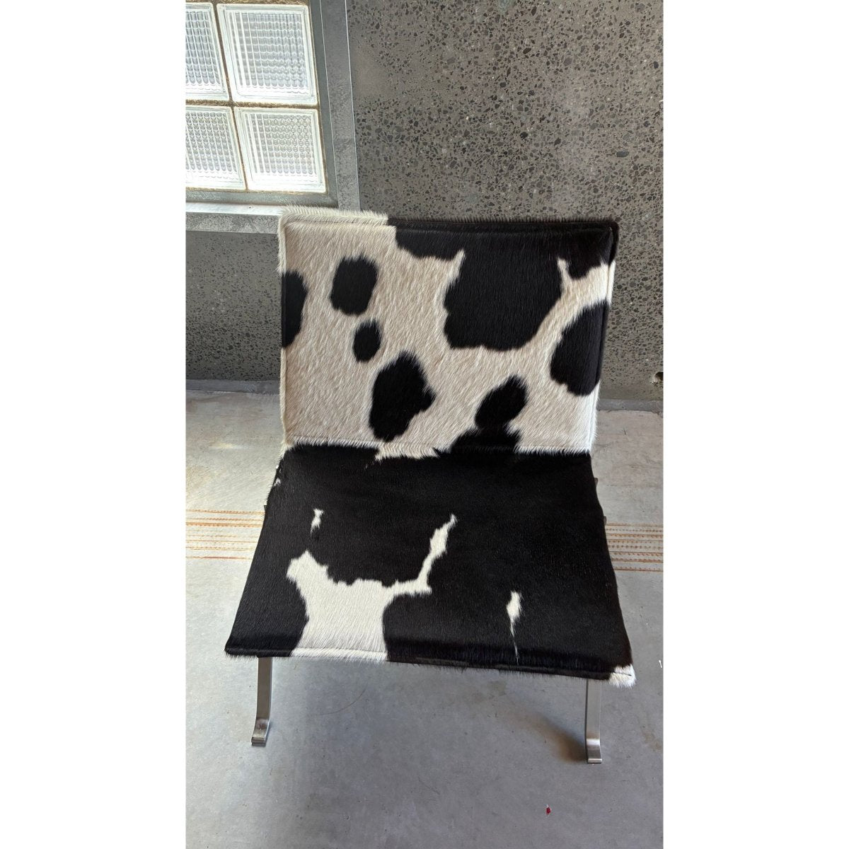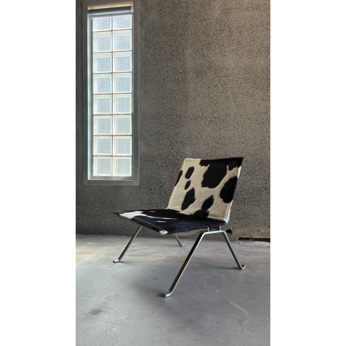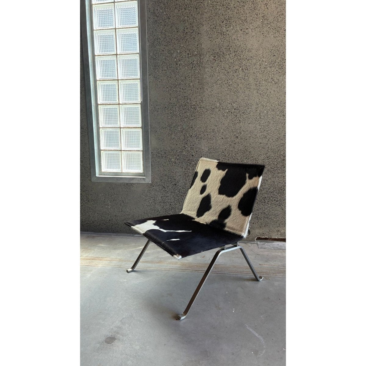 This piece reflects the hallmarks of the original: a disciplined, low-slung profile; a floating sling seat; and a structural clarity that places the brush steel frame at the heart of the design. Upholstered in genuine black and white cowhide, the chair introduces a tactile organic counterpoint to the precision of the metalwork.