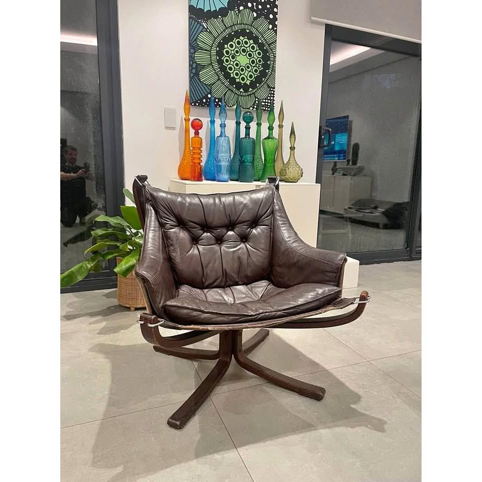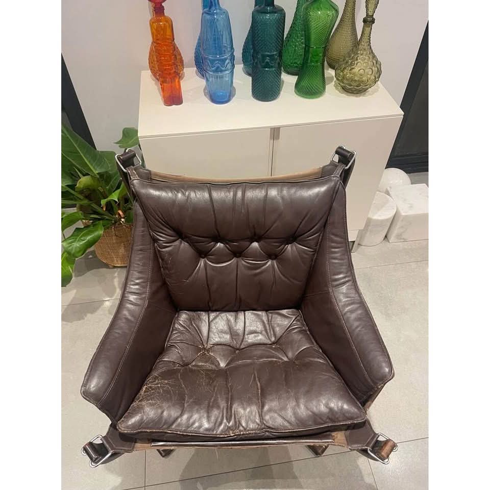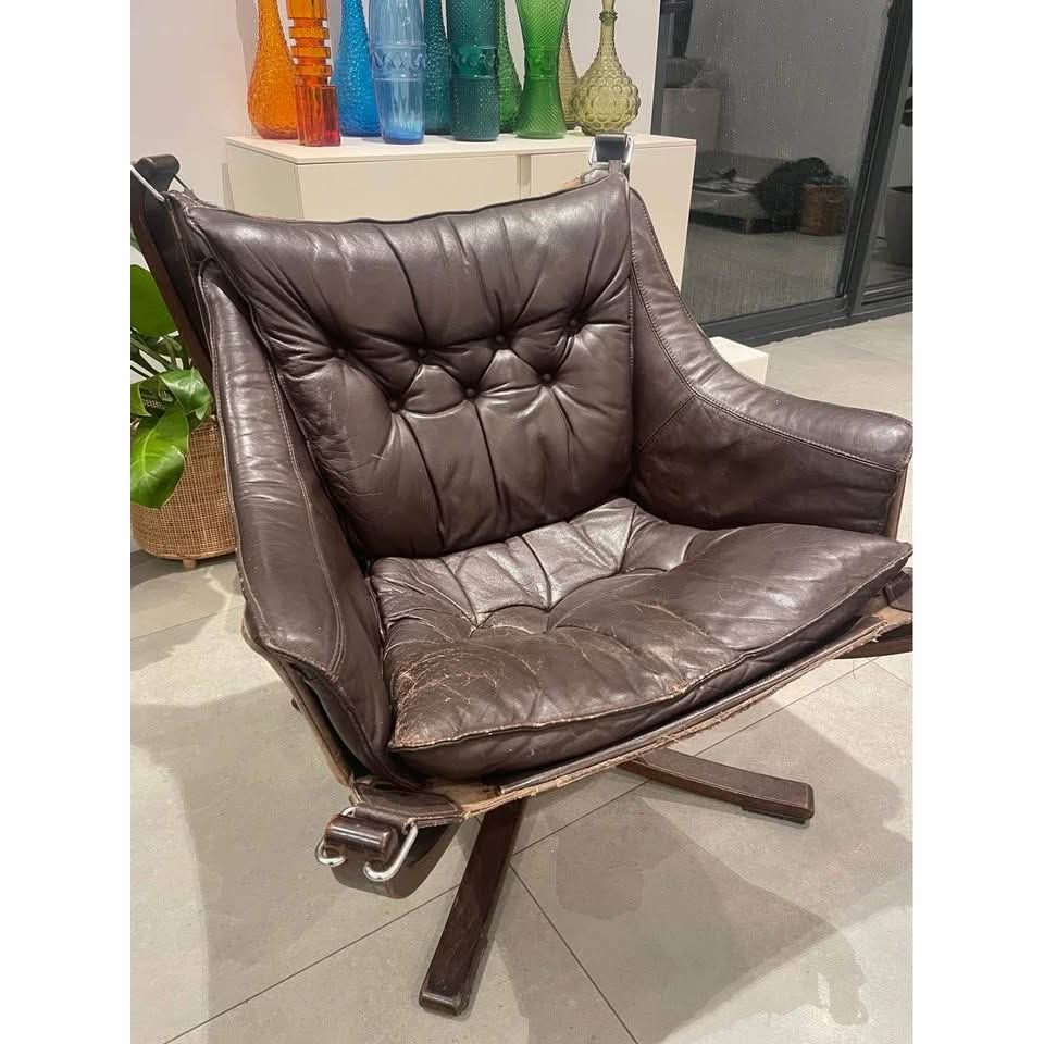 Original 1970s Falcon Chair by Sigurd Resell for Vatne Møbler, Norway. This iconic -century modern Scandinavian lounge chair features a sculptural bentwood frame and suspended leather sling seat.