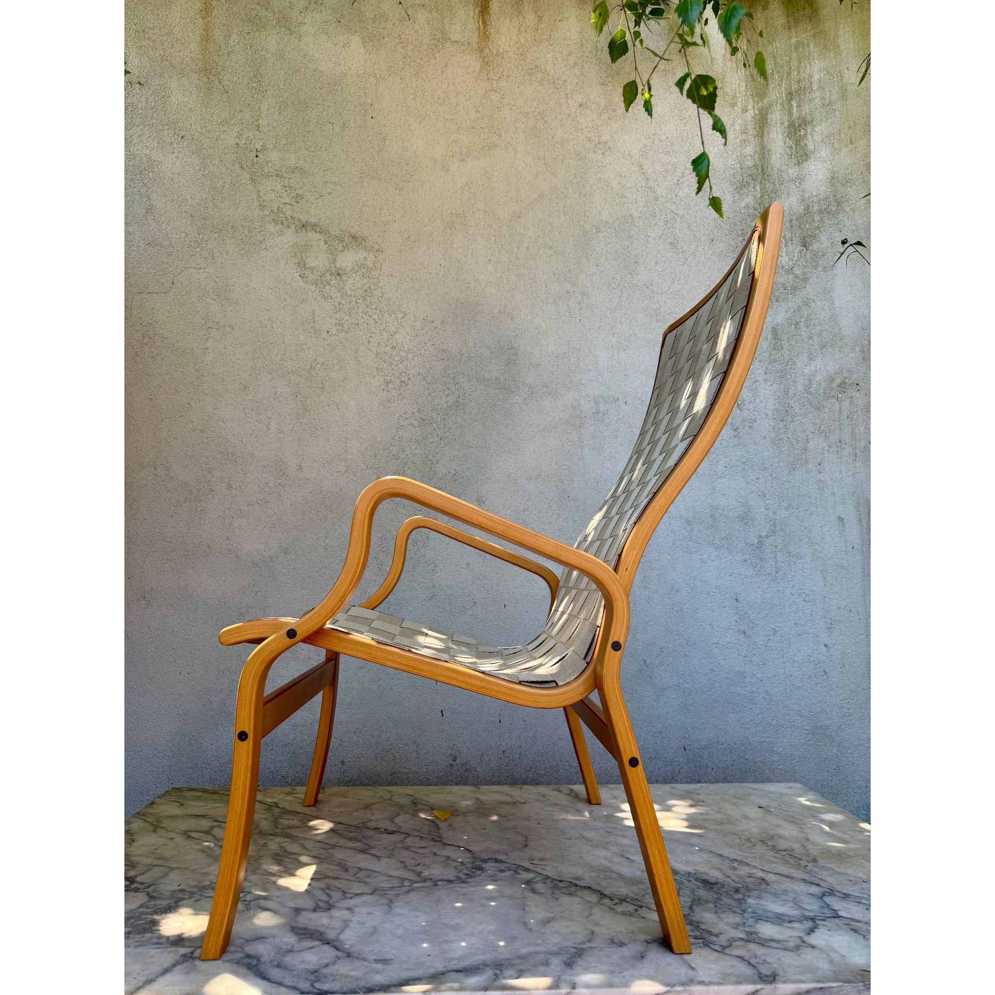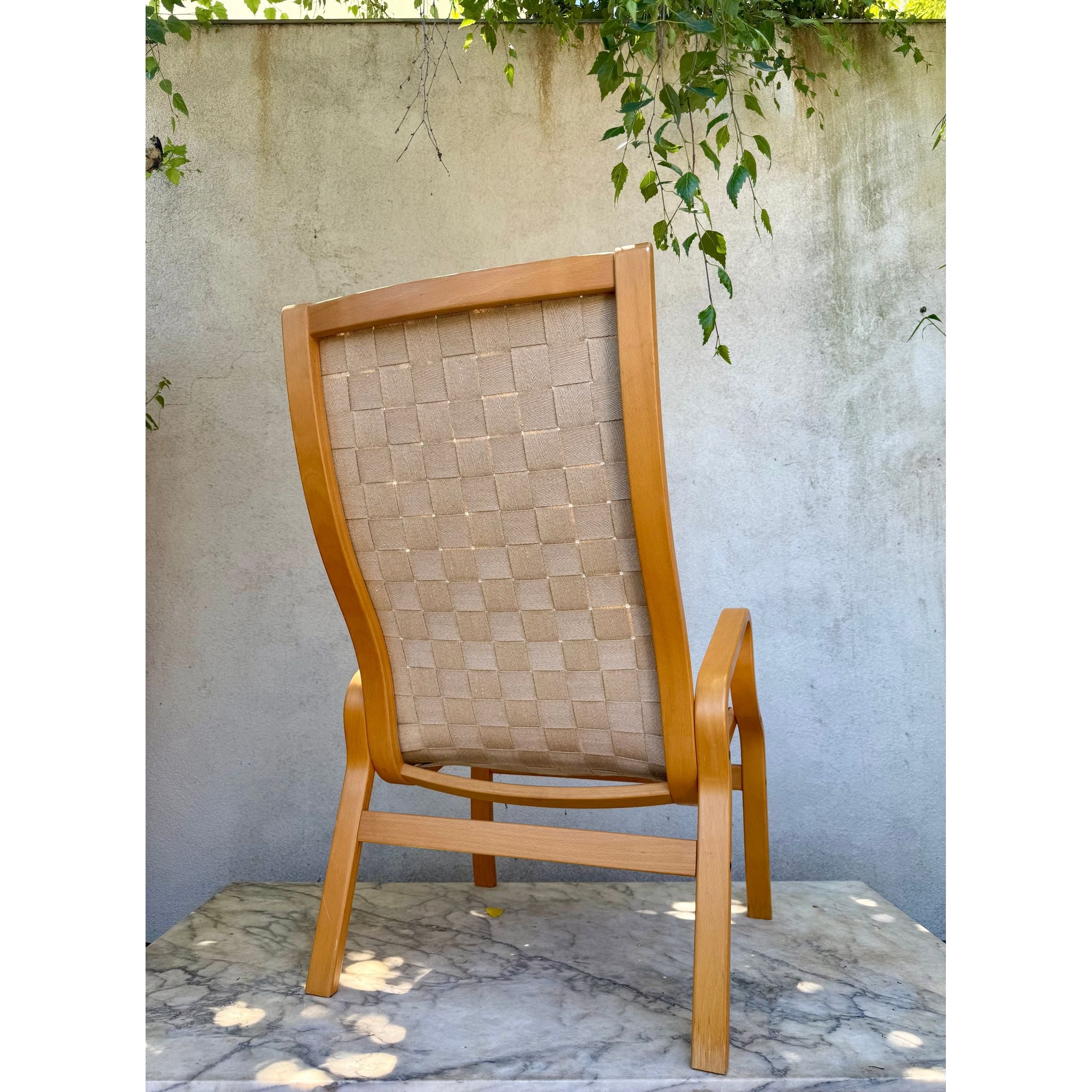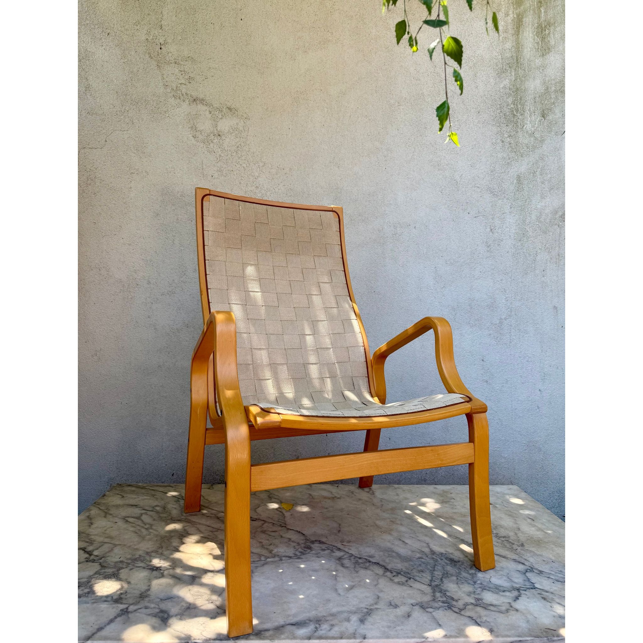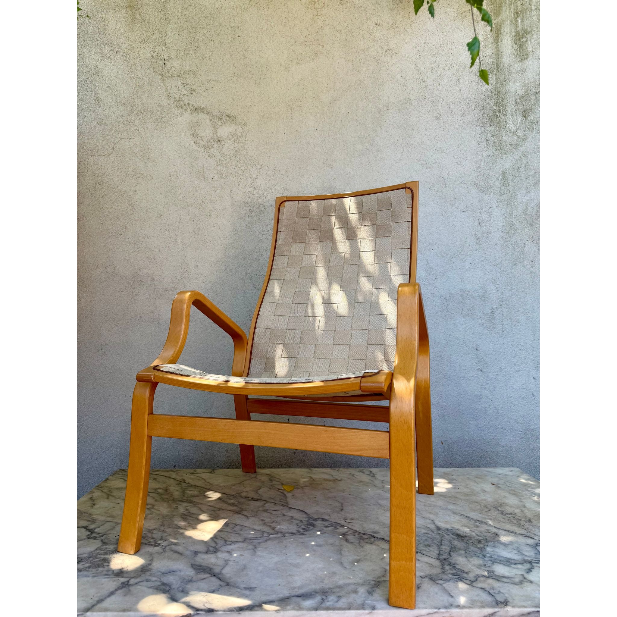 This ‘Albert’ lounge chair is composed of birch ply bentwood frame and a beige braided saddle upholstery.