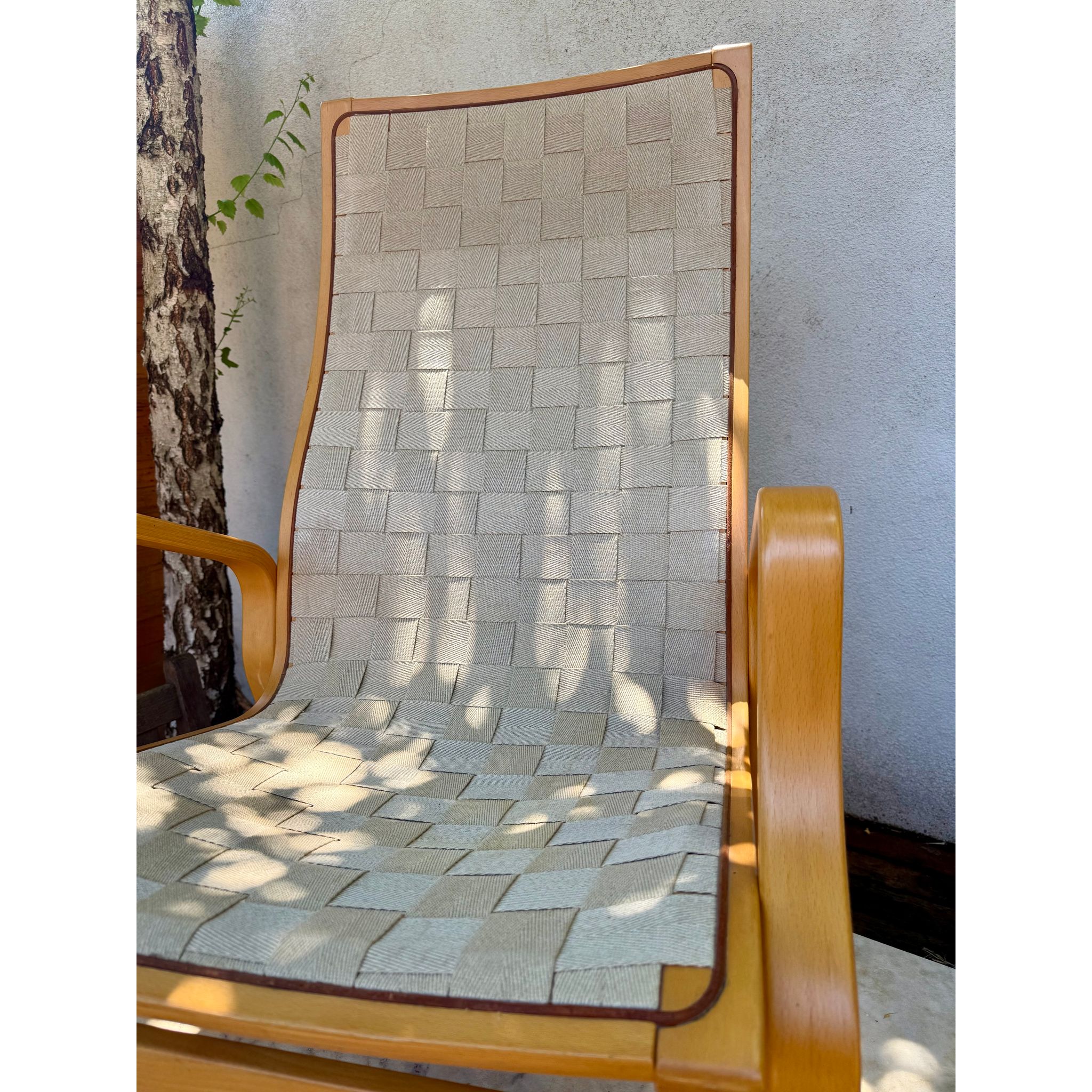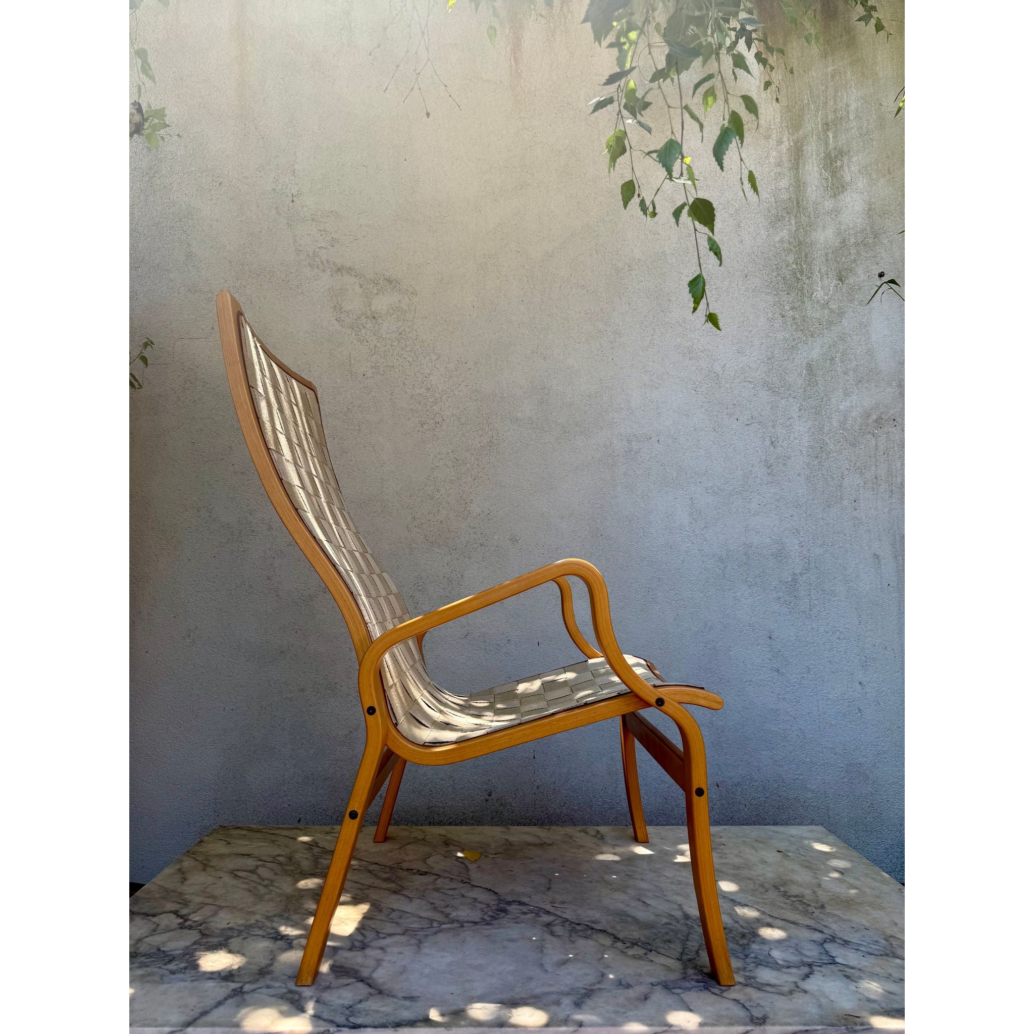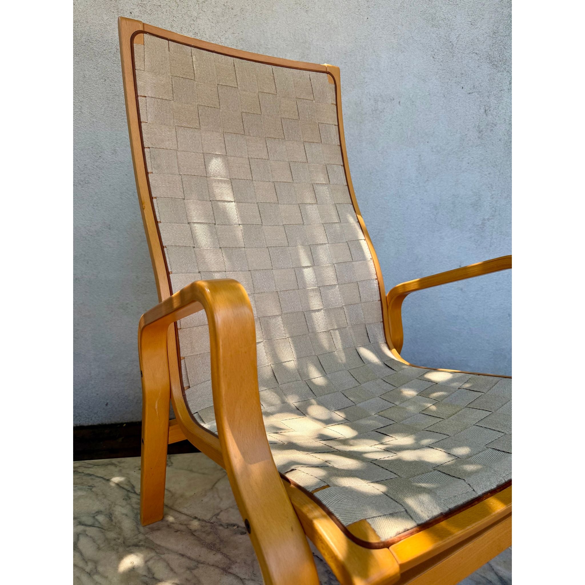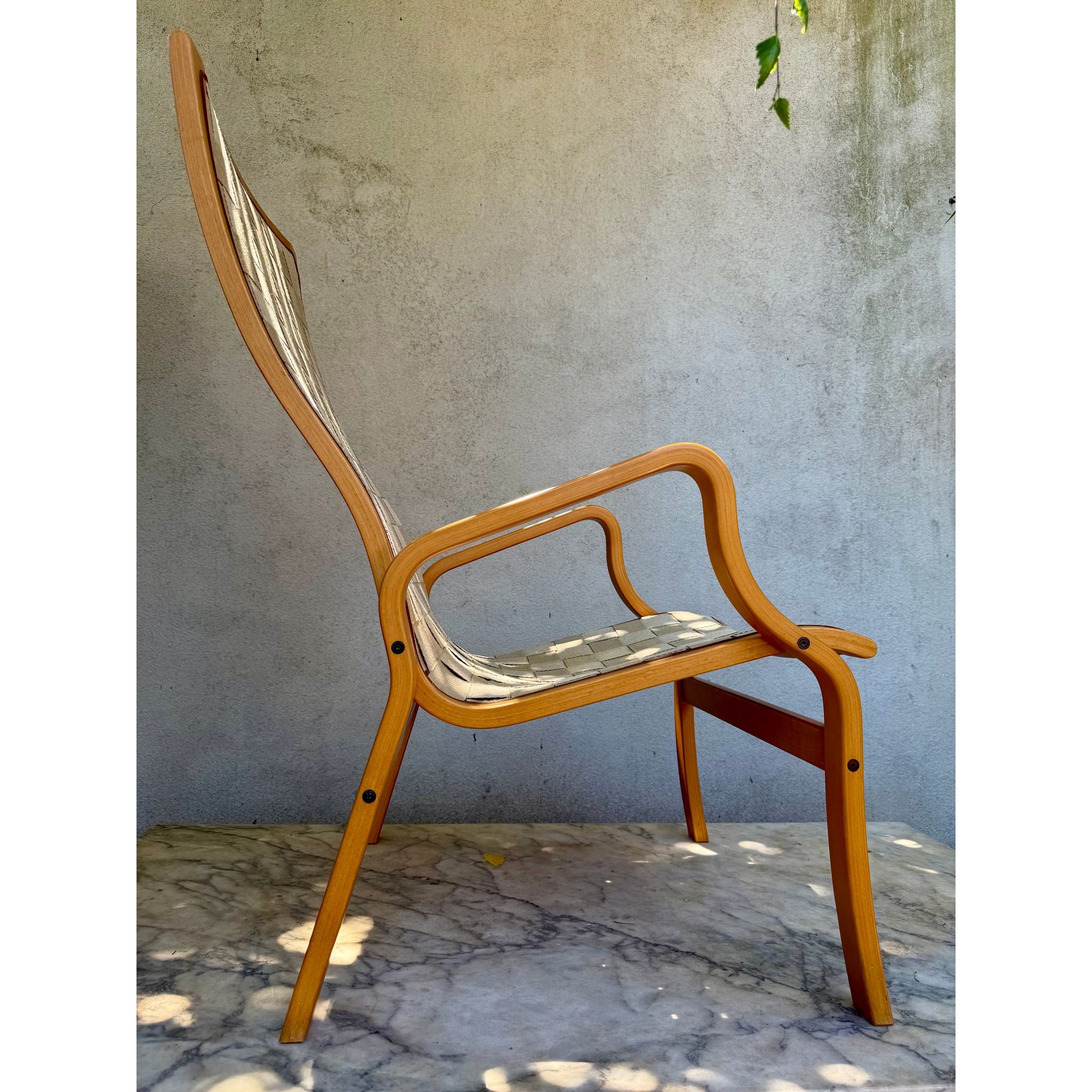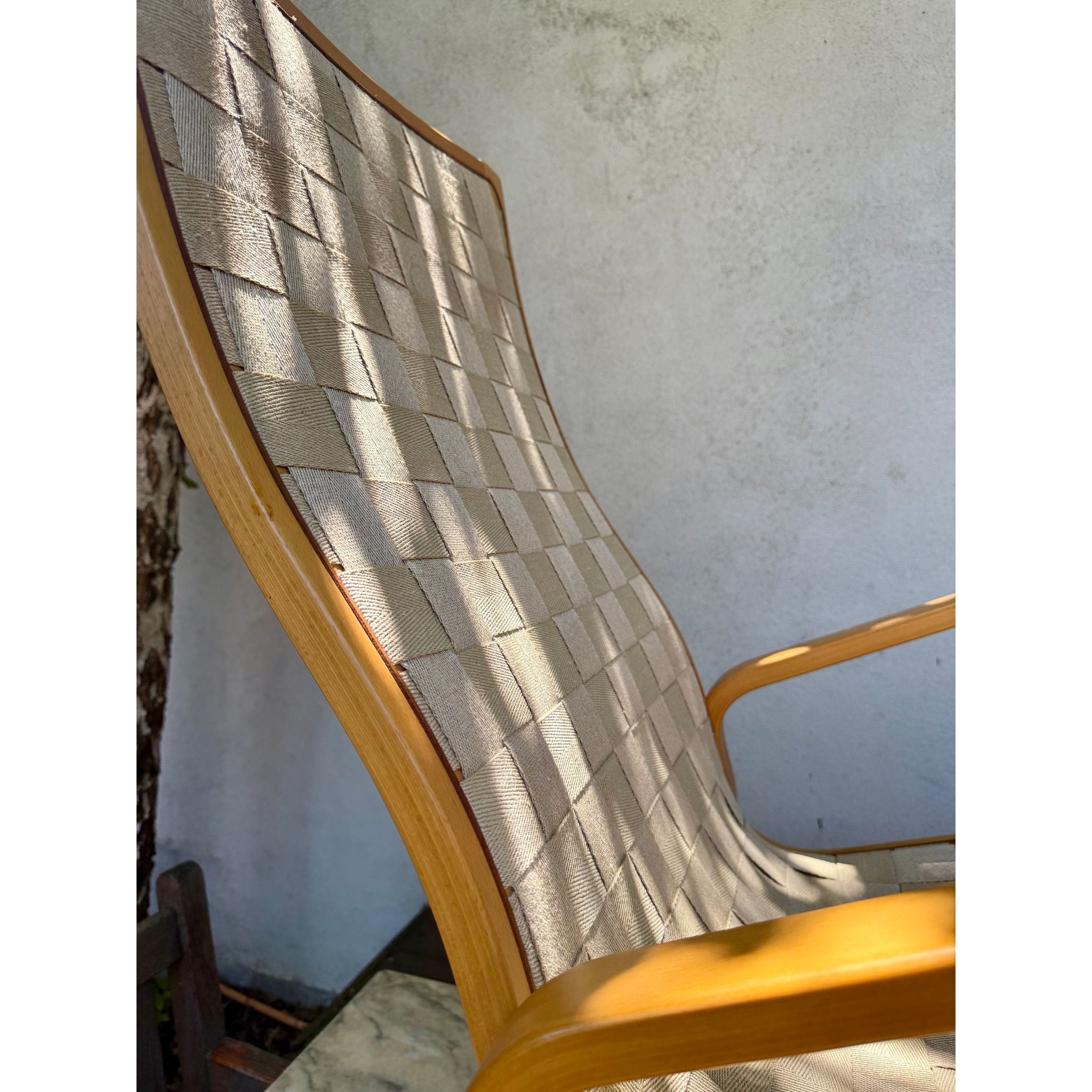 This ‘Albert’ lounge chair is composed of birch ply bentwood frame and a beige braided saddle upholstery.