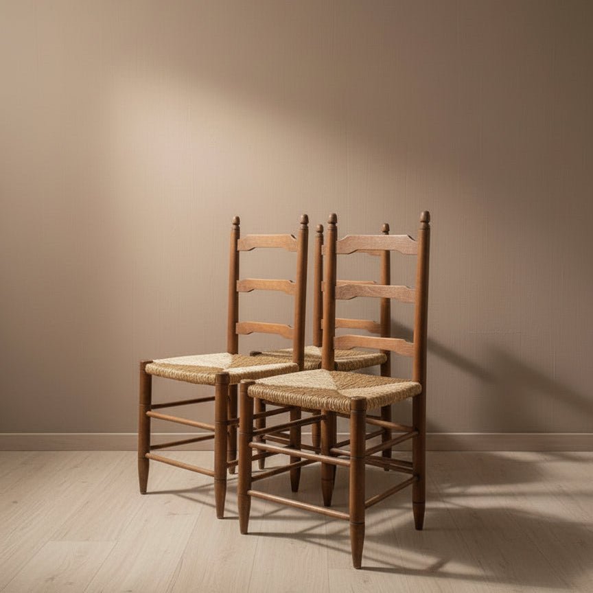 Authentic French Provincial oak ladder-back chairs with handwoven rush seats. Vintage dining chairs featuring timeless craftsmanship and natural patina. Perfect for collectors.