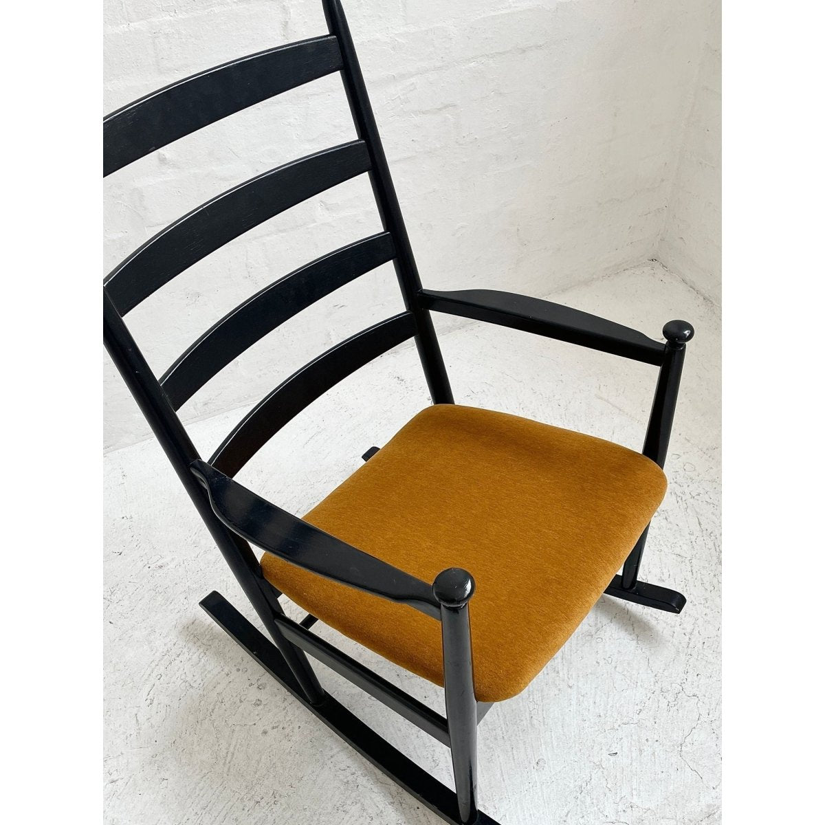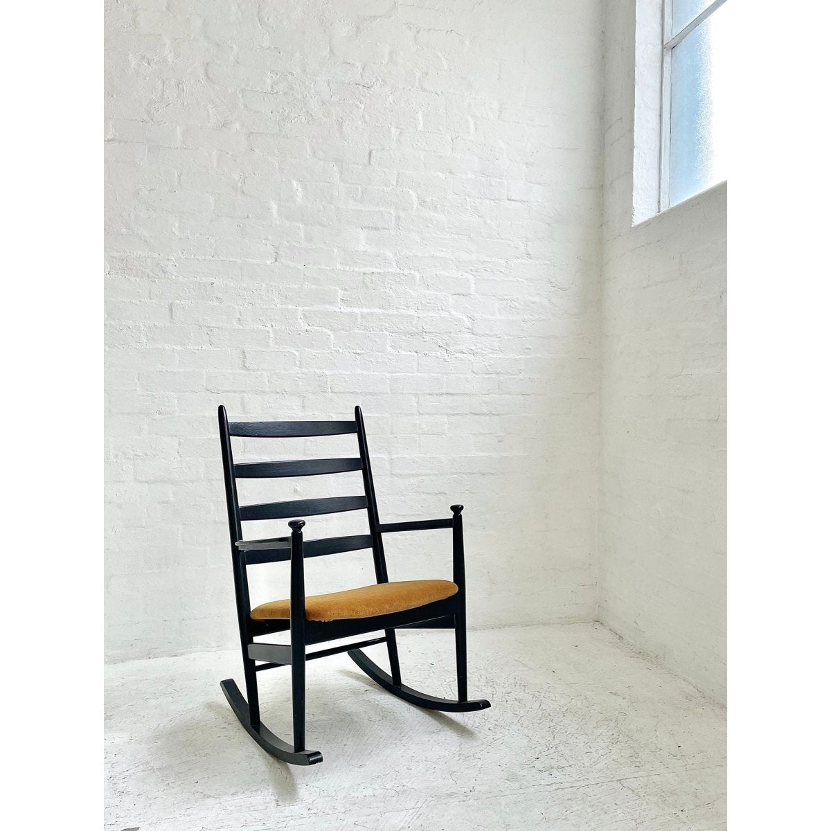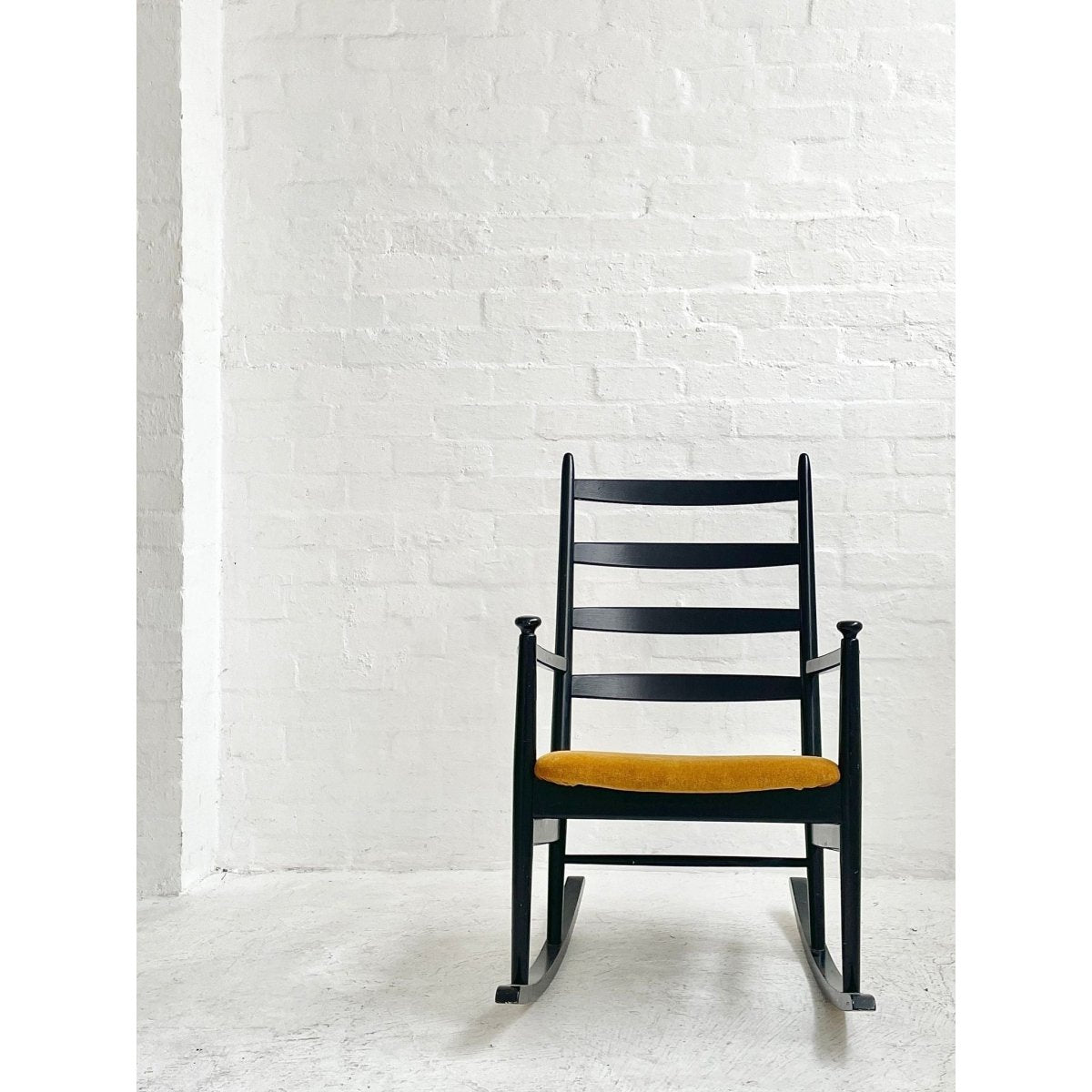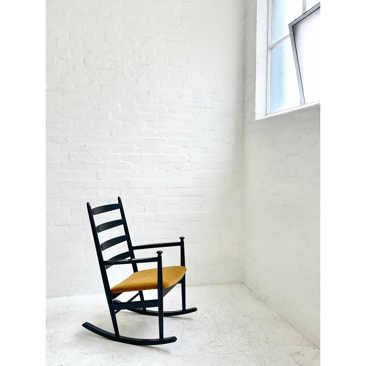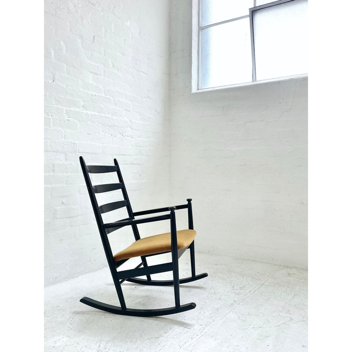 Danish pale timber rocking chair with a newly upholstered seat. In very good restored condition.
