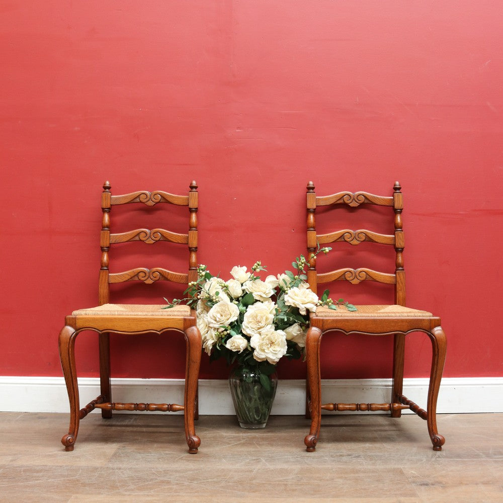 Description:A beautiful pair of French oak ladder back chairs with elegantly shaped horizontal slats and turned finials in the form of acorns. The seats are hand-woven with natural twisted rush, adding warmth, texture and authenticity to the design.