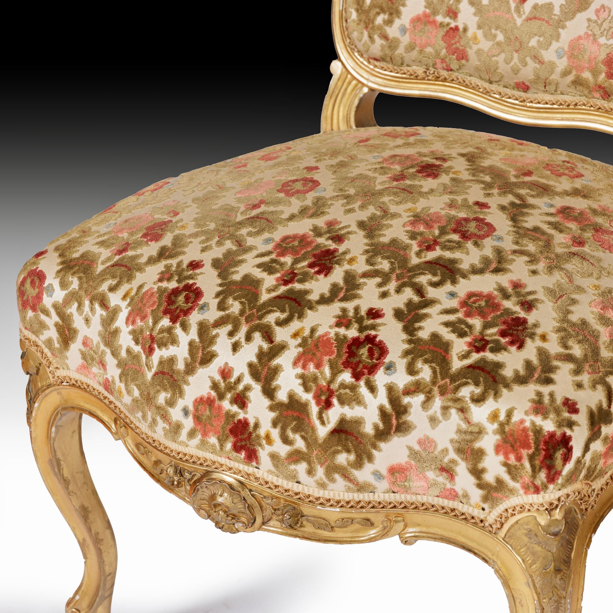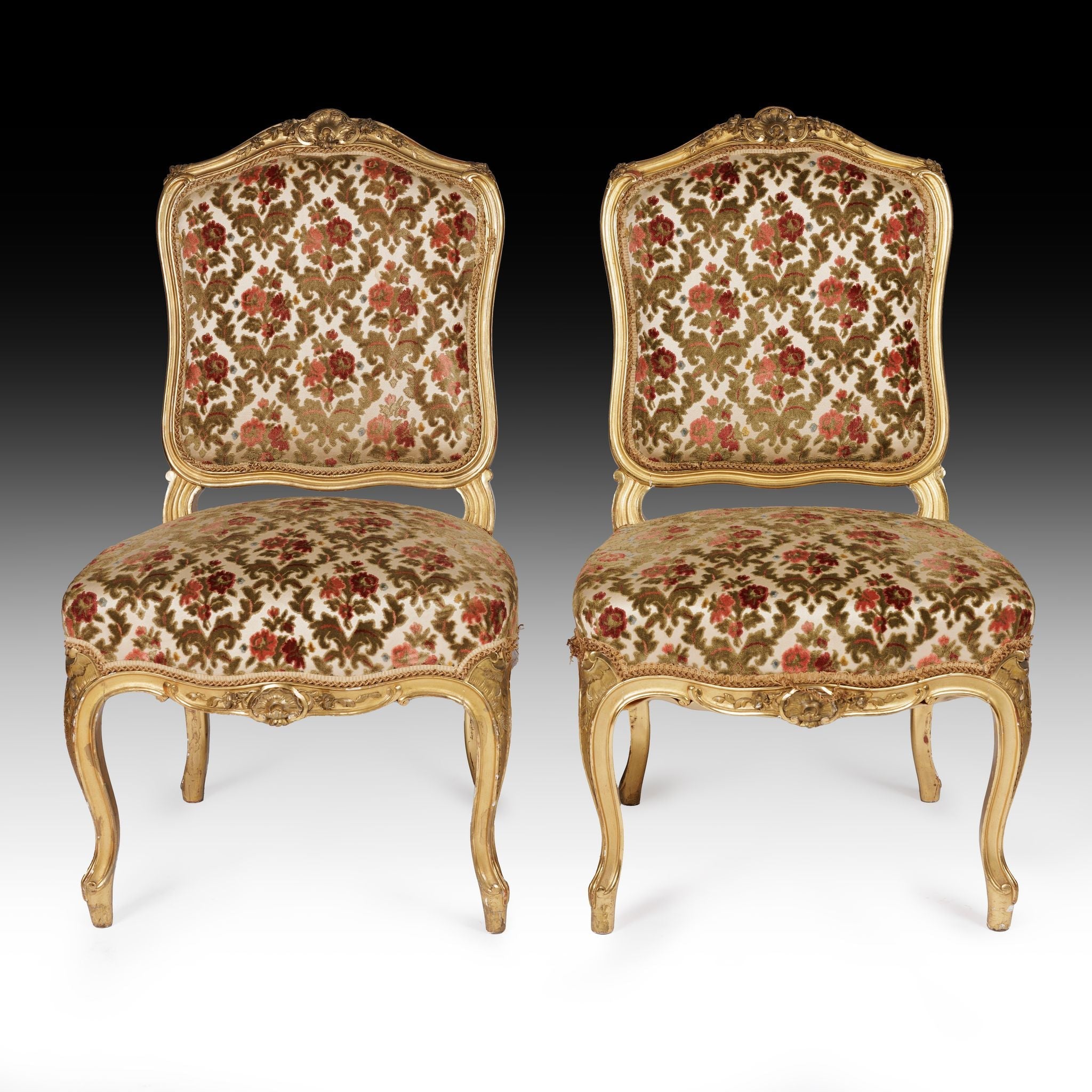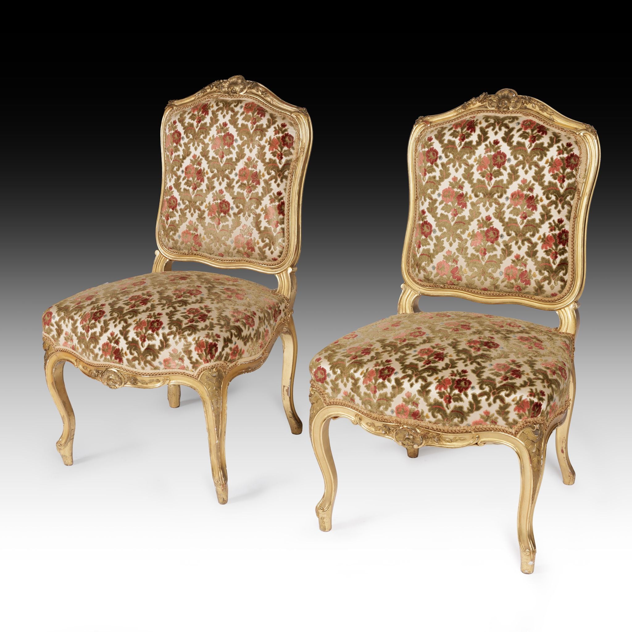 Fine pair 19th century French Louis XV gilded side chairs, the moulded frames craved in the form of flowers and leaves surrounding upholstered back and seat raised on four cabriole legs. In excellent condition.