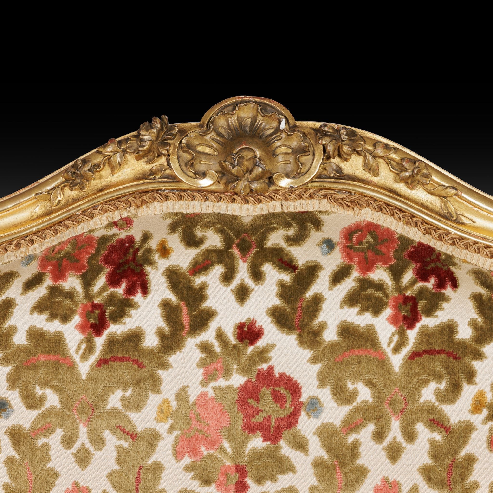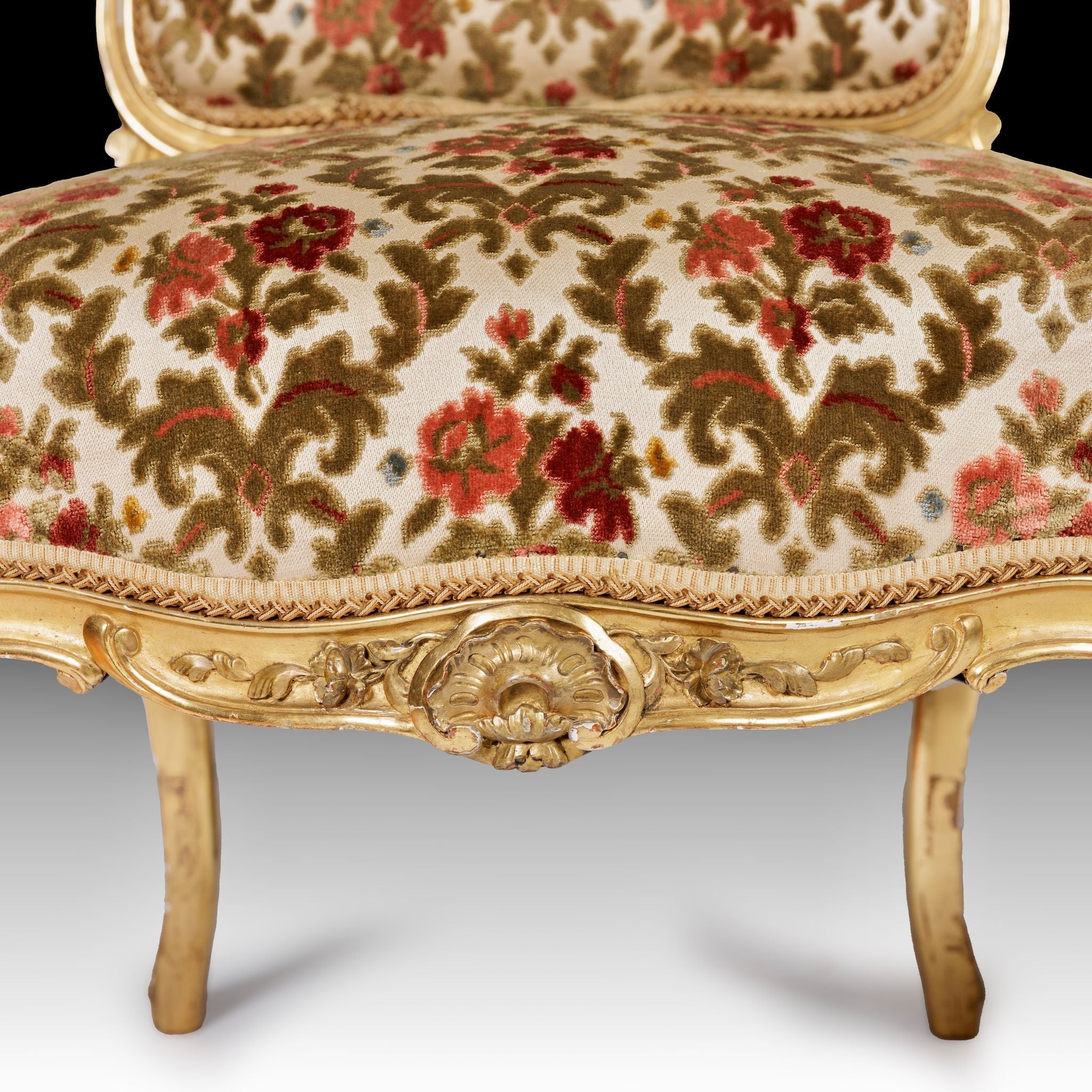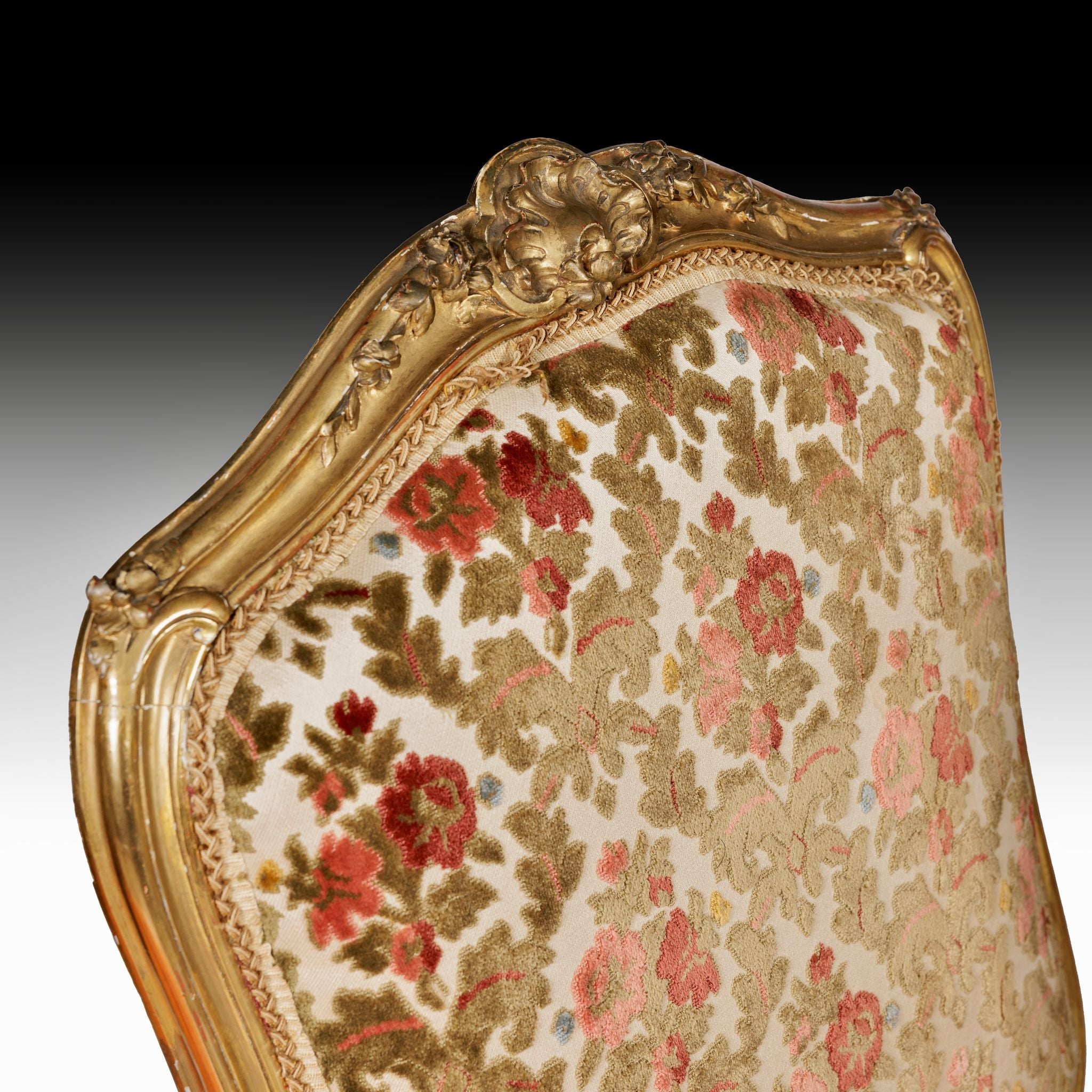 Fine pair 19th century French Louis XV gilded side chairs, the moulded frames craved in the form of flowers and leaves surrounding upholstered back and seat raised on four cabriole legs. In excellent condition.