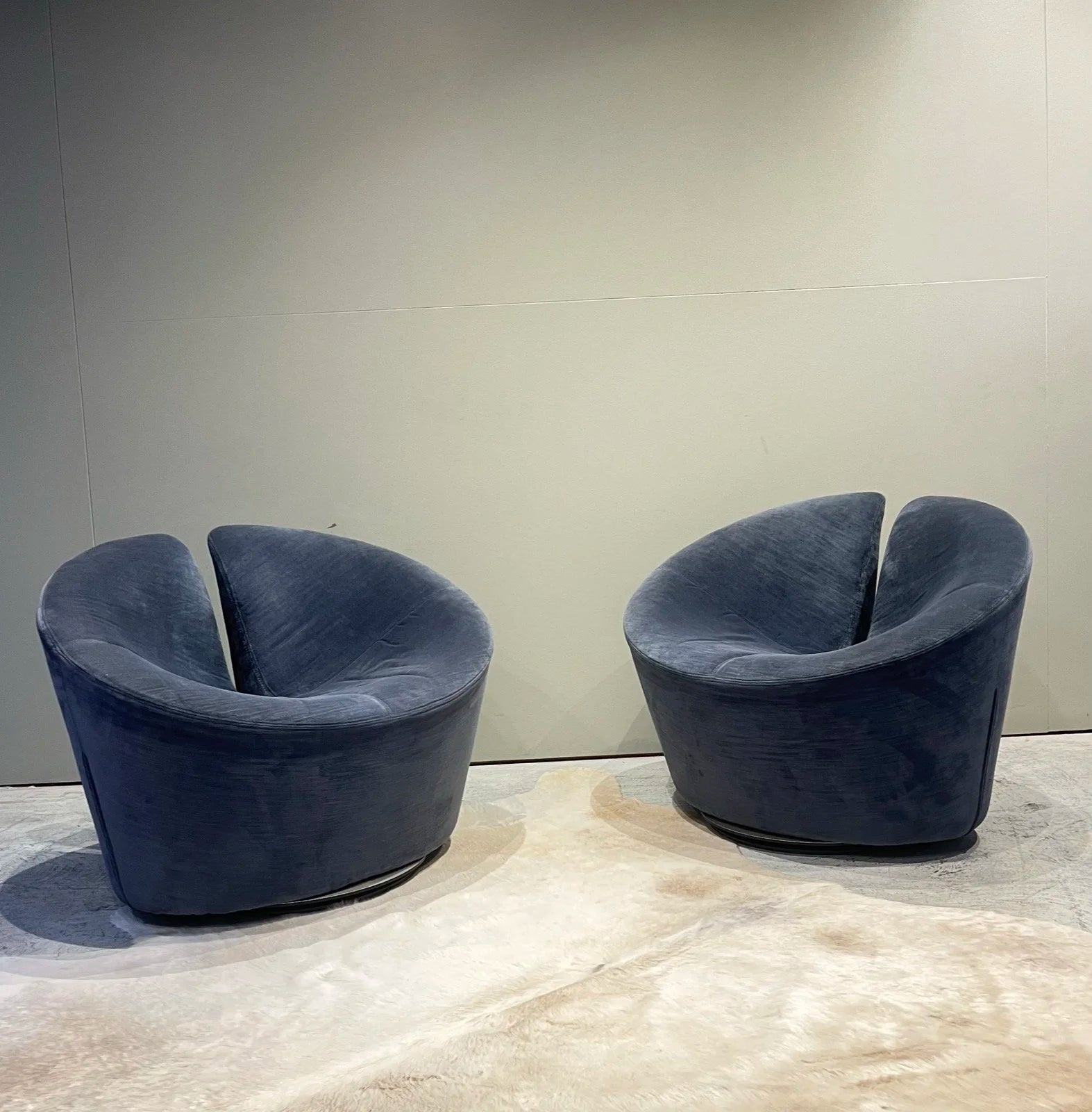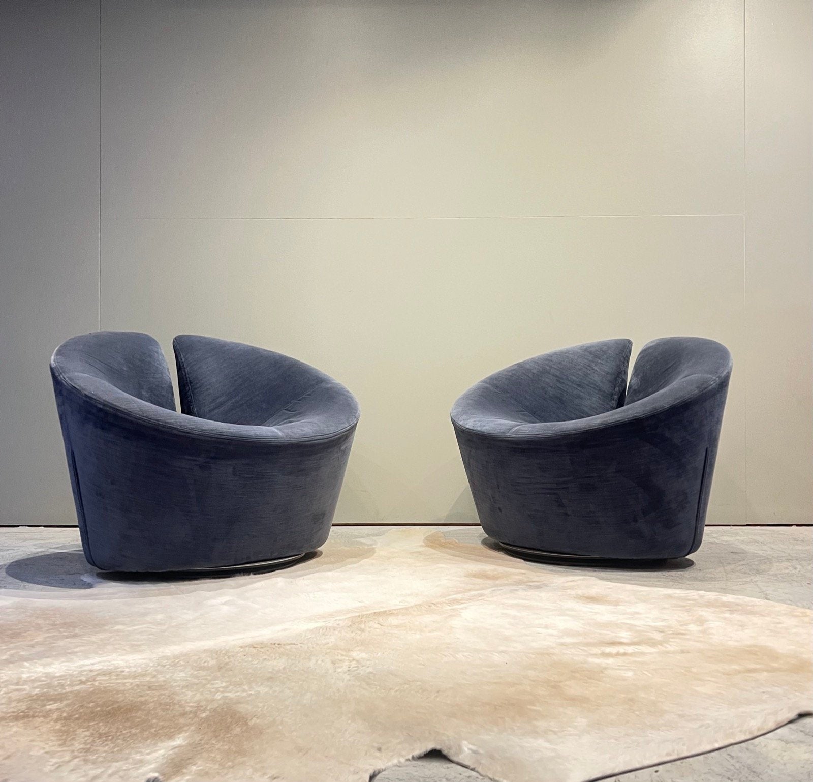 This pair retains its original blue-grey velvet upholstery soft and barely worn, with the quiet patina that only genuine age can produce. The low, generous seat and cocoon-like form suit long conversation and quiet reading in equal measure. Both chairs sit on chrome disc swivel bases, rotating freely through 360 degrees.