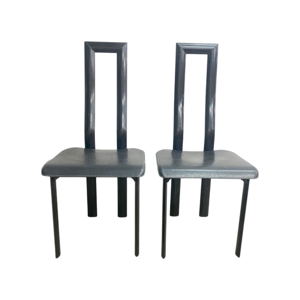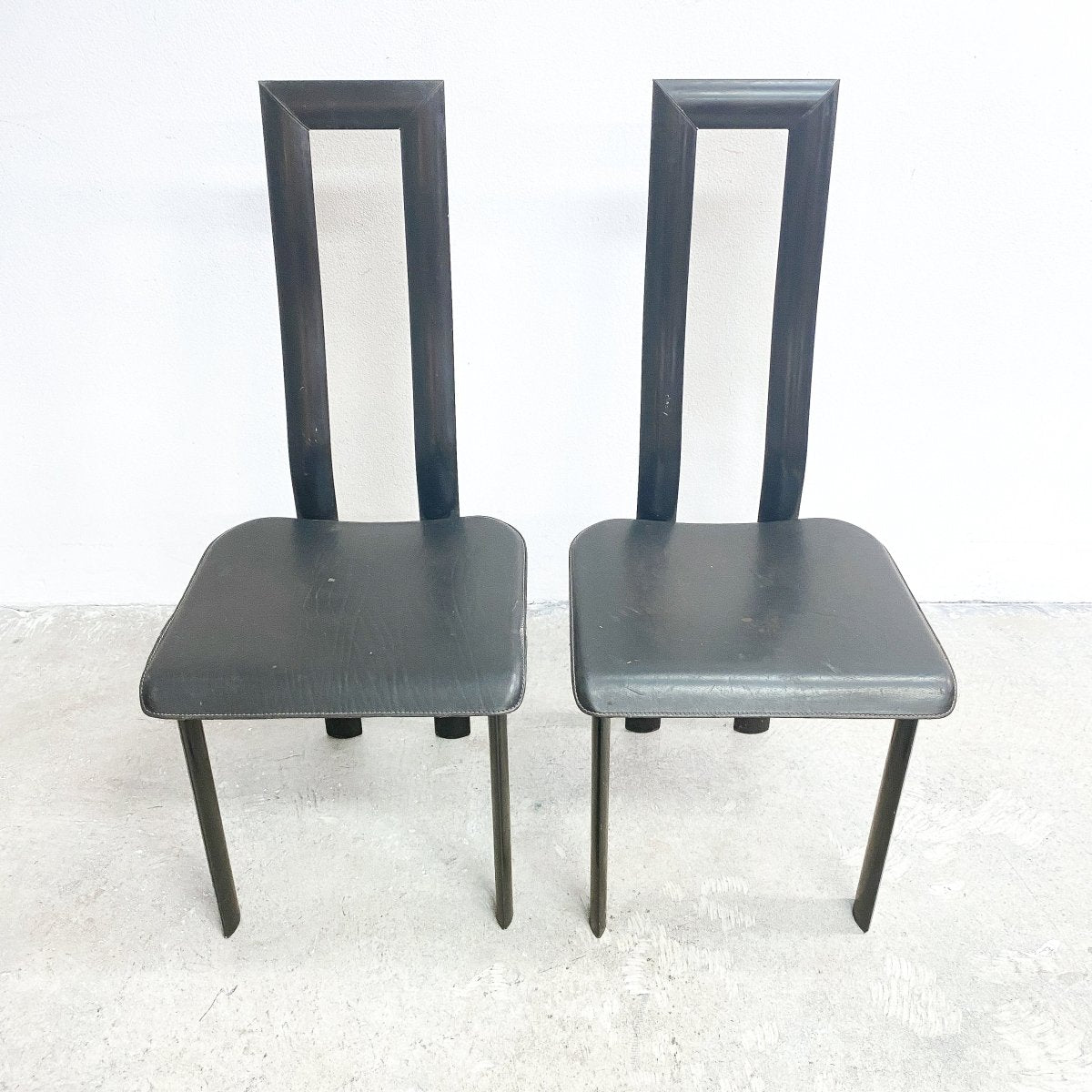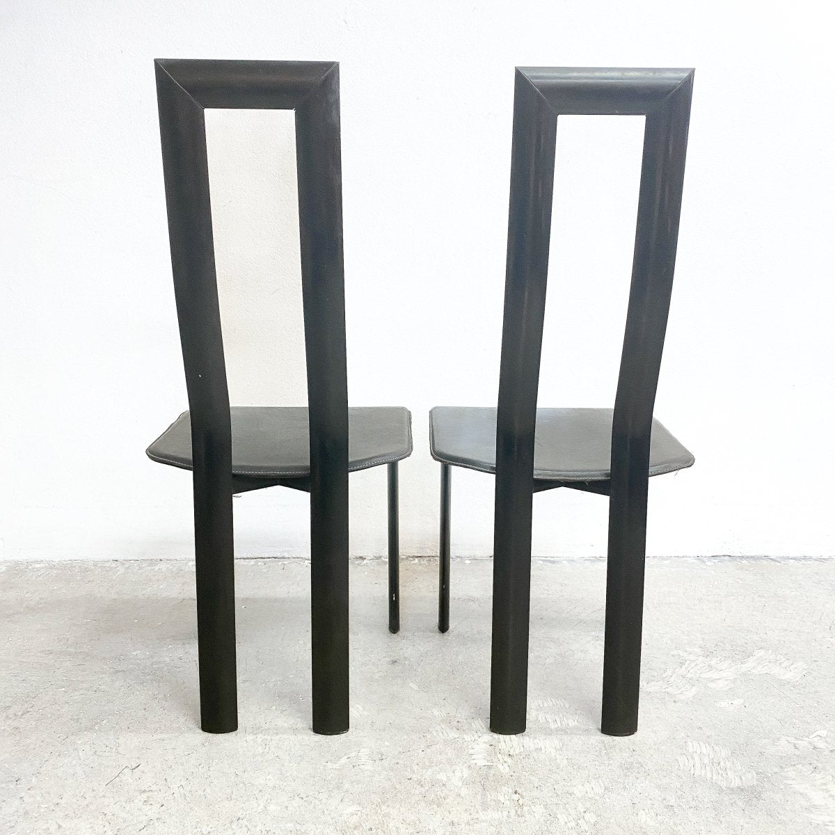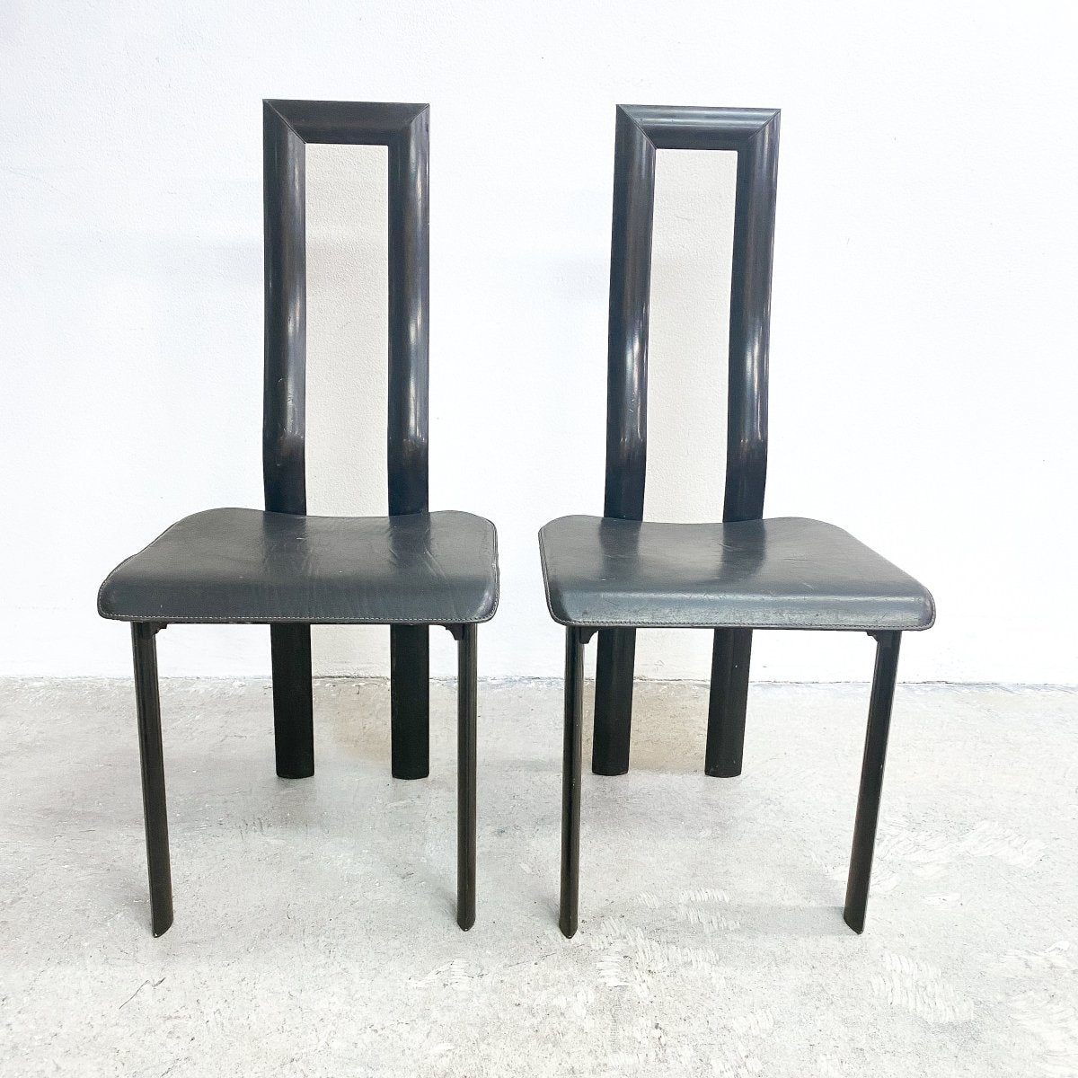 Pair of cool post modern Italian 1980's dining chairs with black leather seats and aluminium frame. Designed by Antonella Mosca Regina for Ycami Collection. In very good condition with some signs of use consistent with age.