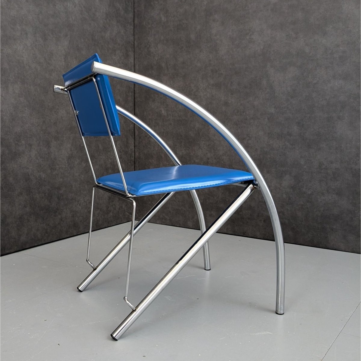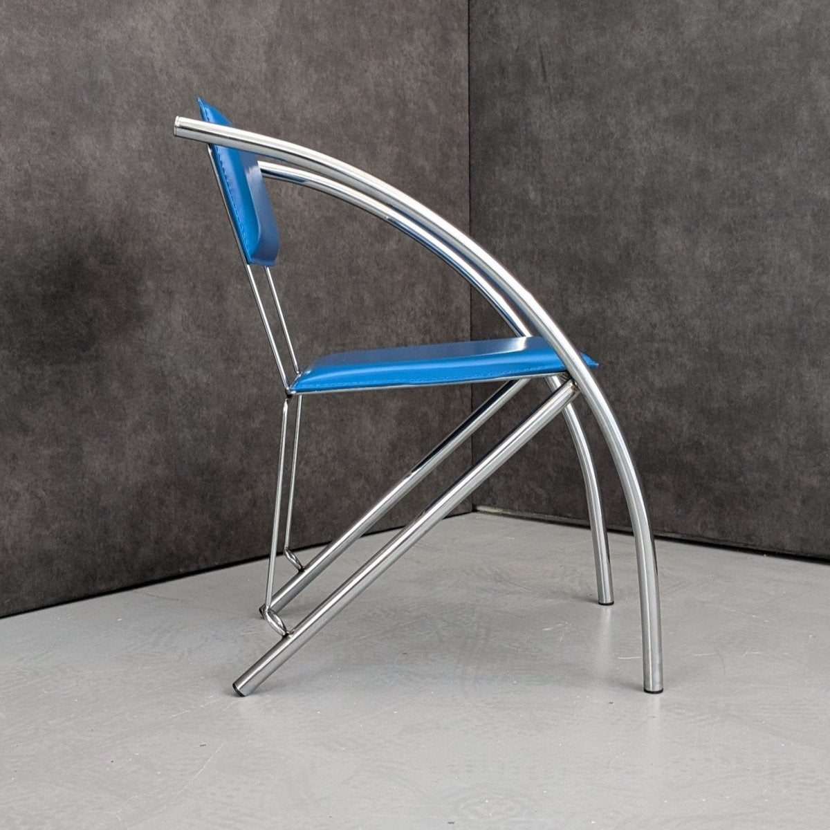 A precise graphic presence, defined by line, proportion, and surface rather than decoration. Produced in Italy during the 1980s, this postmodern dining chair reflects a period when tubular steel furniture explored geometry and contrast with confidence and restraint. The chrome steel frame forms a continuous linear structure, supporting a blue faux leather seat and back that emphasise outline and profile over softness. The pairing of saturated colour with reflective metal situates the chair firmly within late twentieth century Italian interiors, conceived for dining, meeting, or workspaces where clarity of form mattered as much as function. On its own, it reads as an architectural object as much as a functional seat.