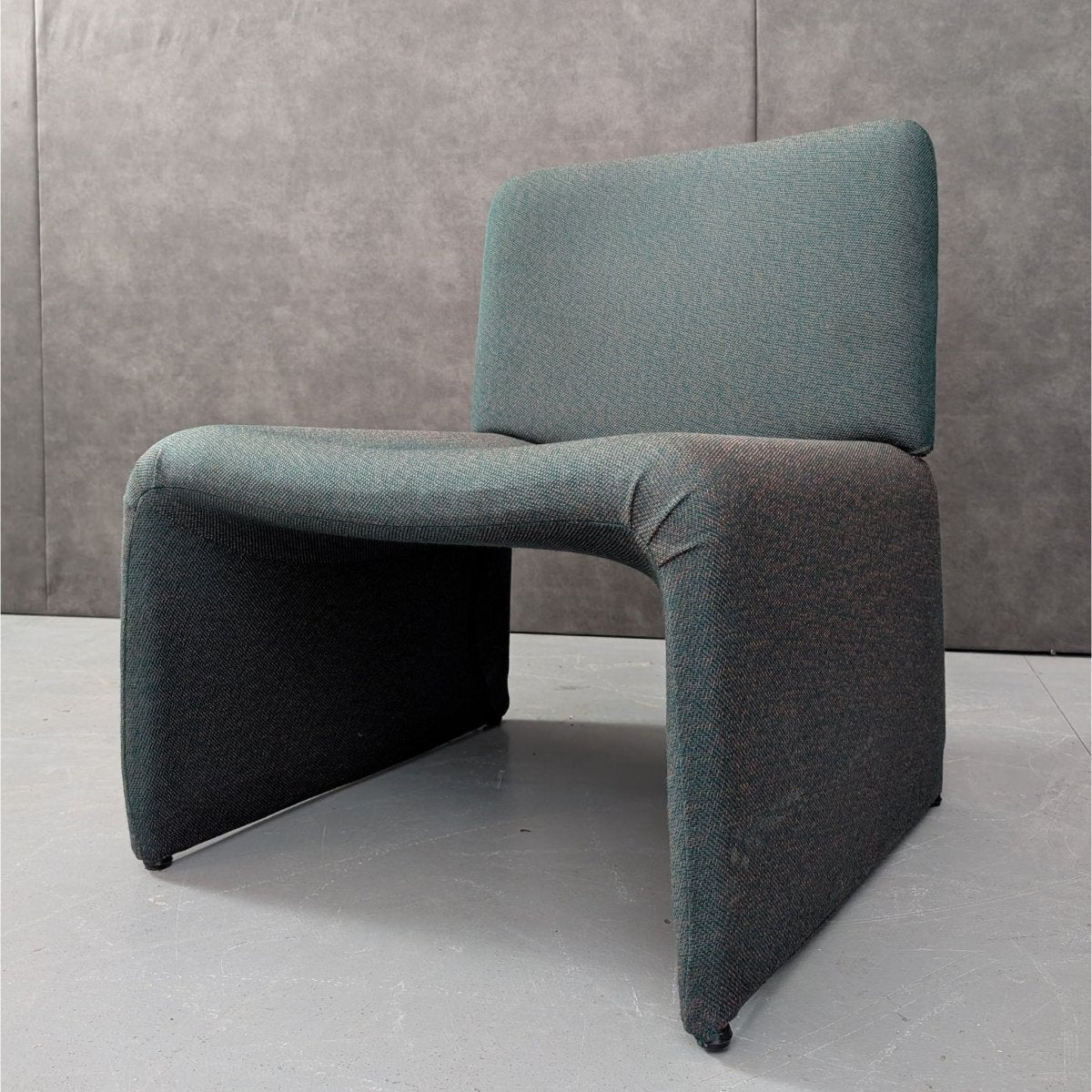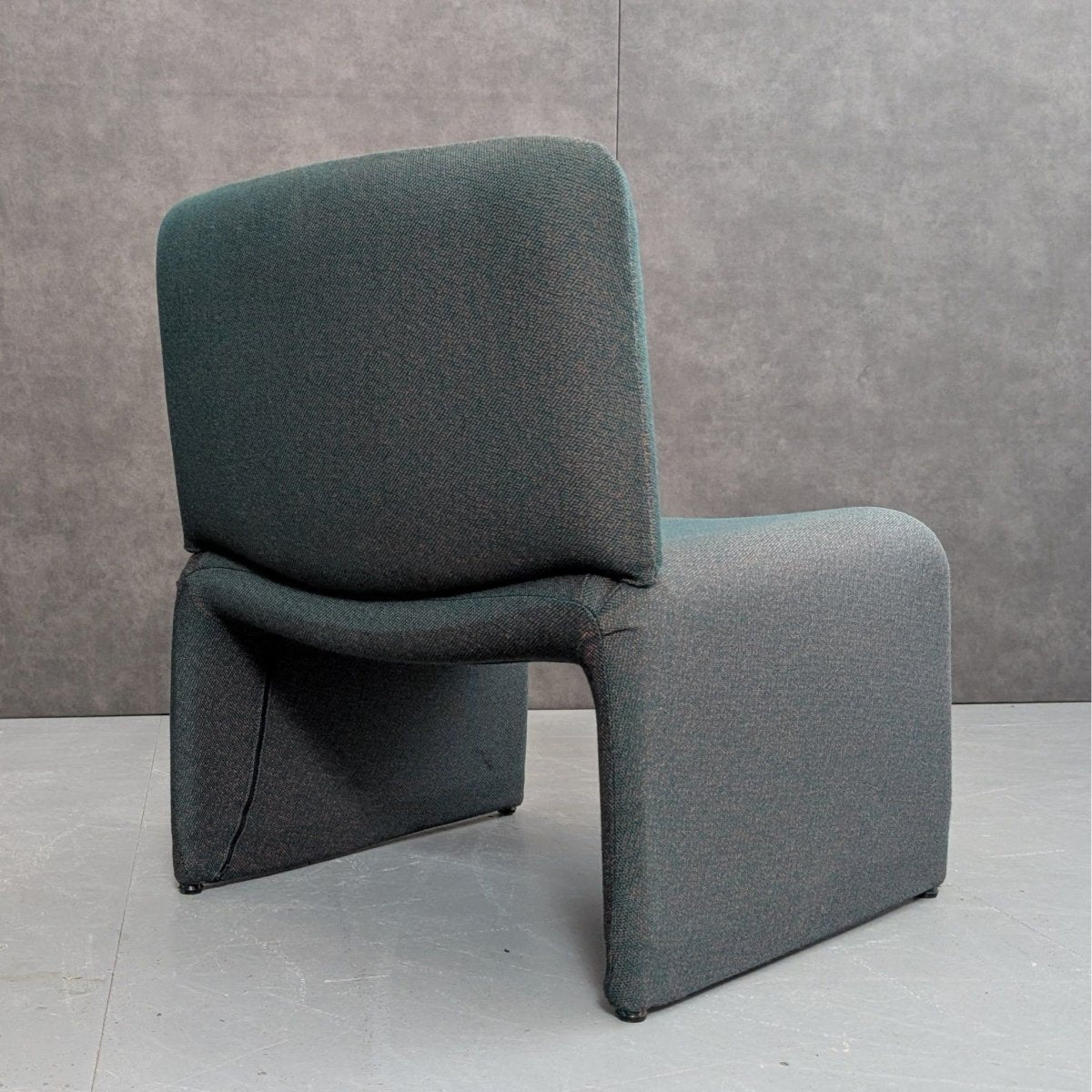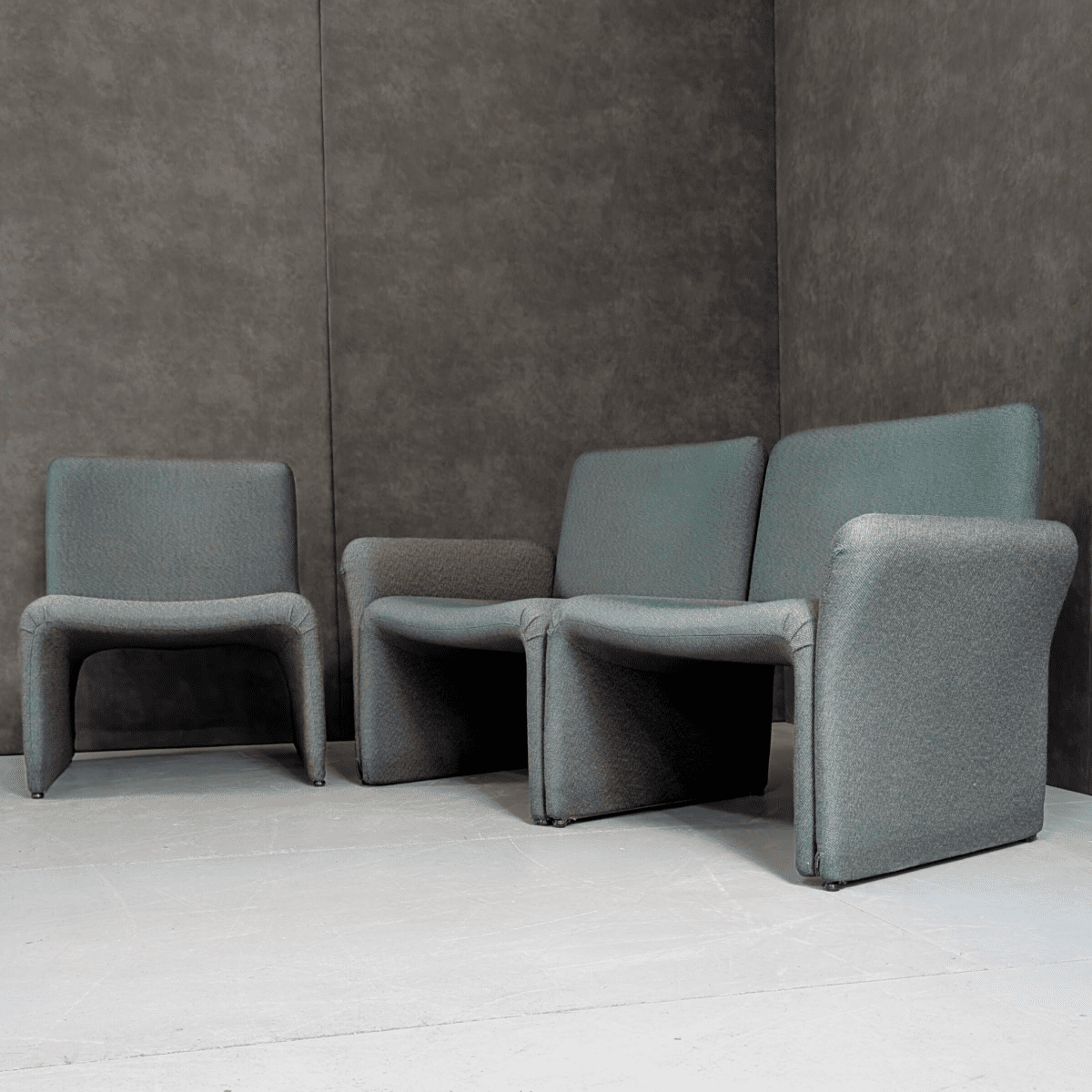 Produced in Italy during the 1970s postmodern period, the set reflects a shift toward softer geometries and modular domestic layouts. Fully upholstered construction allows continuous surfaces and rounded transitions, with sculpted negative space beneath the seat giving the form visual lift without fragmentation. Designed to operate as individual elements or join into a single arrangement via removable side components, the system supports flexible placement across residential or commercial interiors. Its form is cohesive and settled, with comfort, scale, and spatial order built directly into the design.