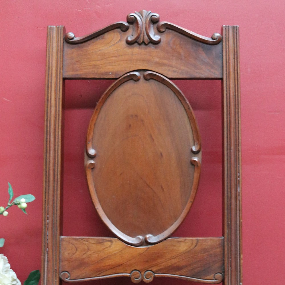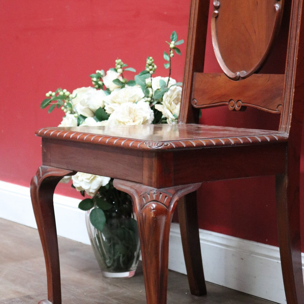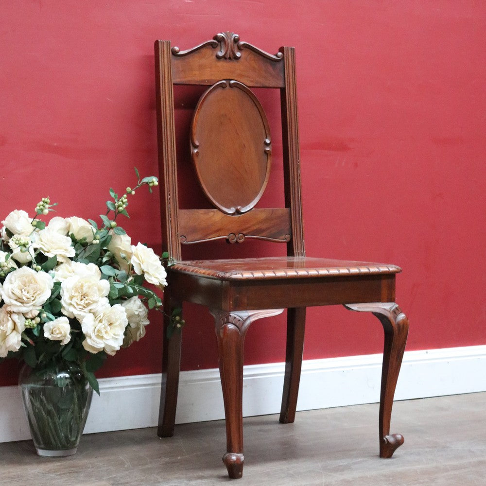 Description: A Victorian English mahogany high back church chair featuring a carved crown and an oval medallion-shaped back rest. The chair stands on elegant cabriole legs and is exceptionally sturdy and solid. A beautiful and character-filled piece that works in any room of the home because every room deserves a chair.