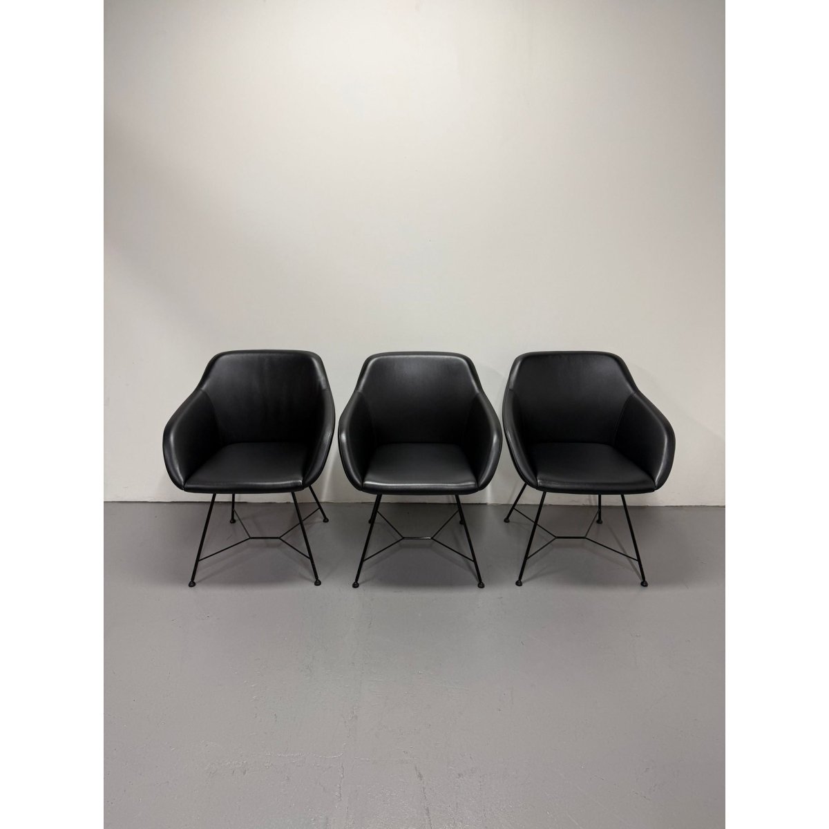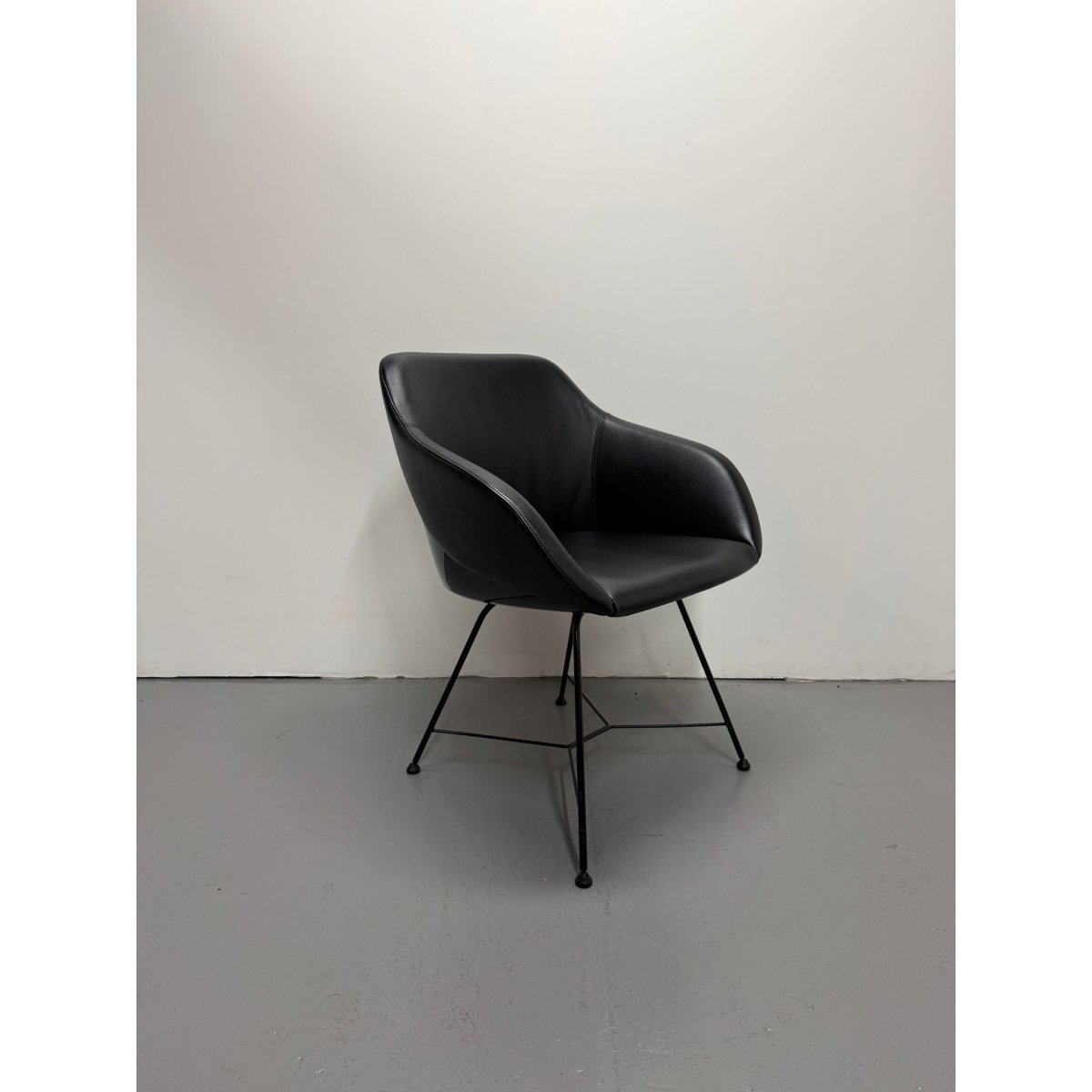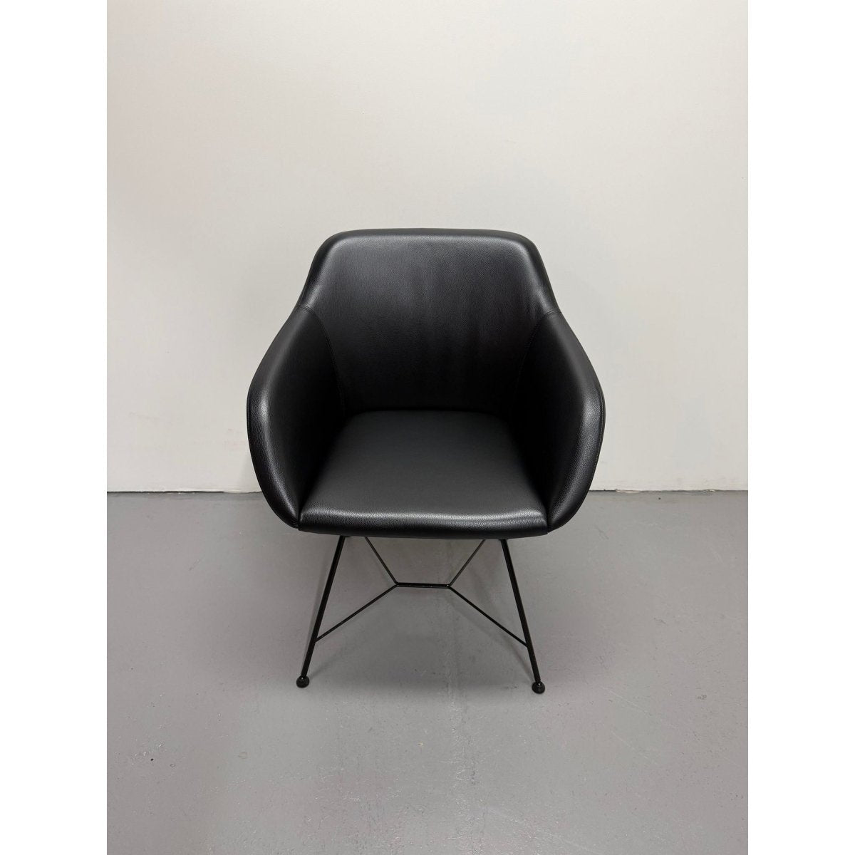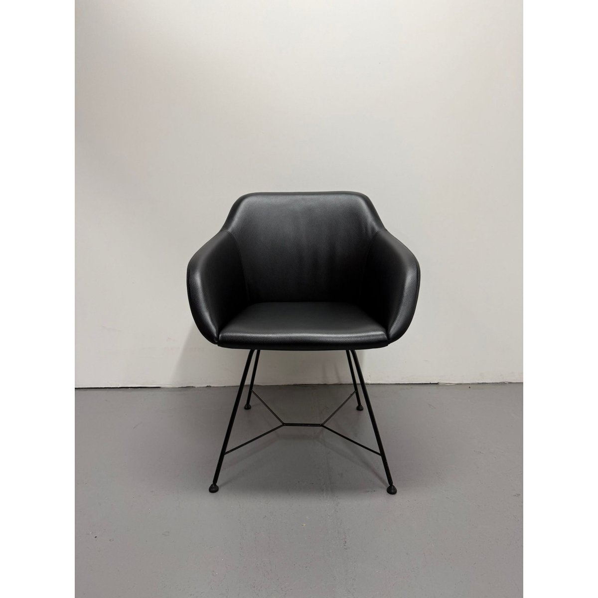This version features a full black leather finish paired with a sleek black wire base ideal for meeting rooms, waiting areas, or stylish home offices, and equally suited as an accent chair in a living or bedroom setting.