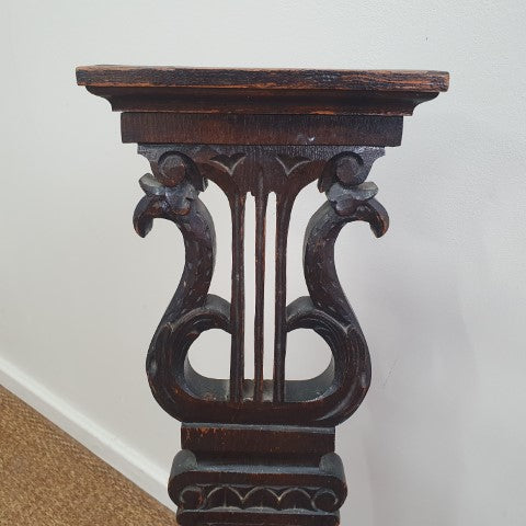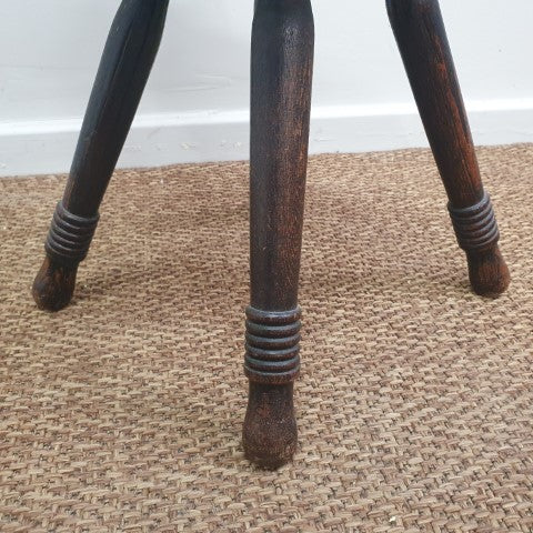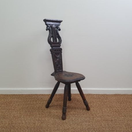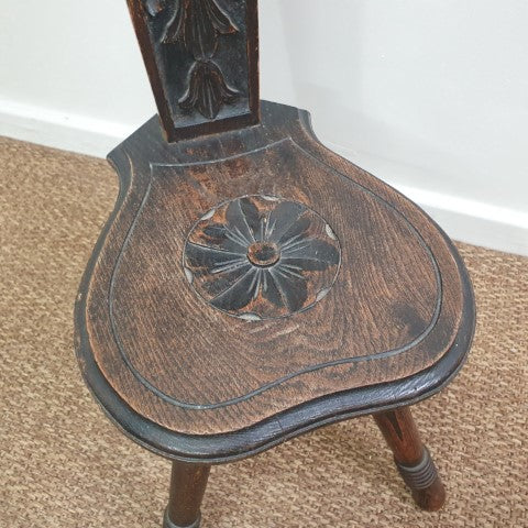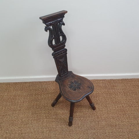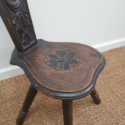 This antique oak spinning chair features decorative floral and harp carvings, highlighting fine craftsmanship and intricate detailing. Its classic design and rich timber tone make it a charming decorative piece for living areas, hallways, or bedrooms. A timeless addition that complements traditional and eclectic interiors.