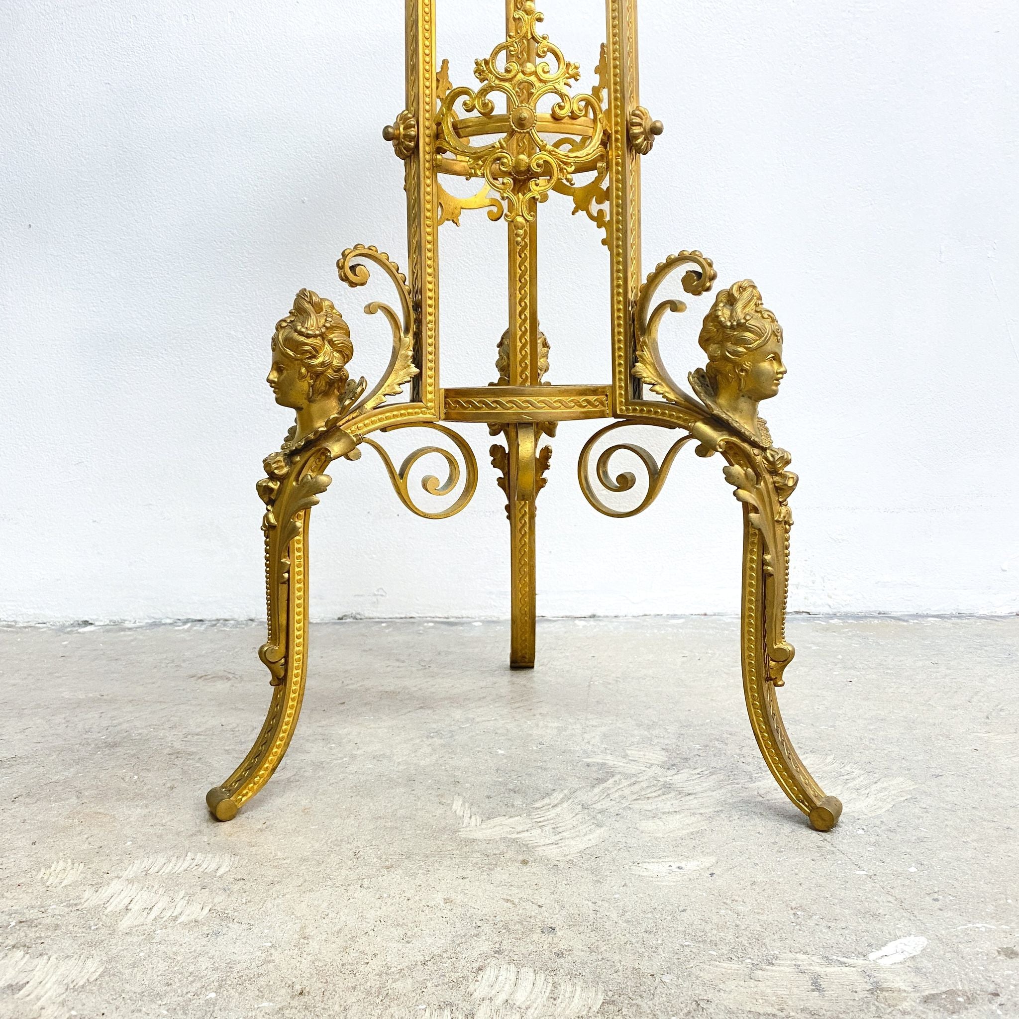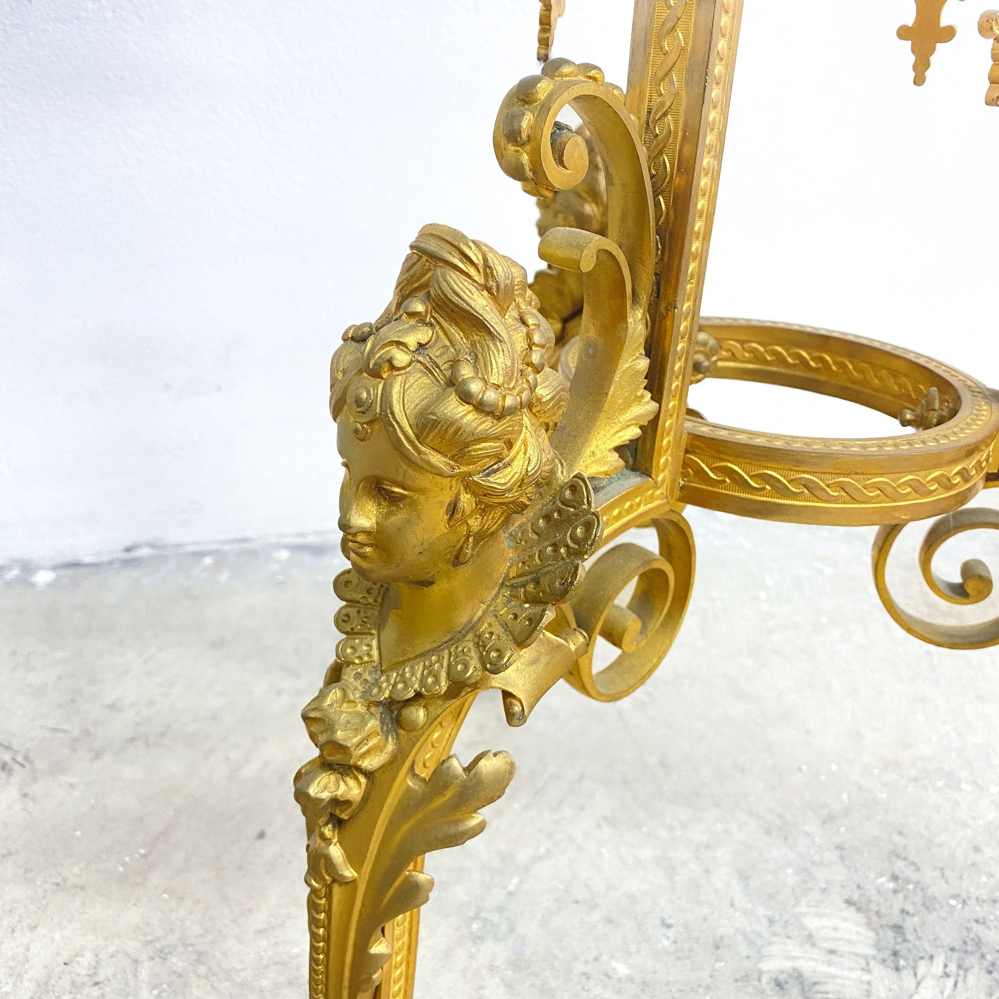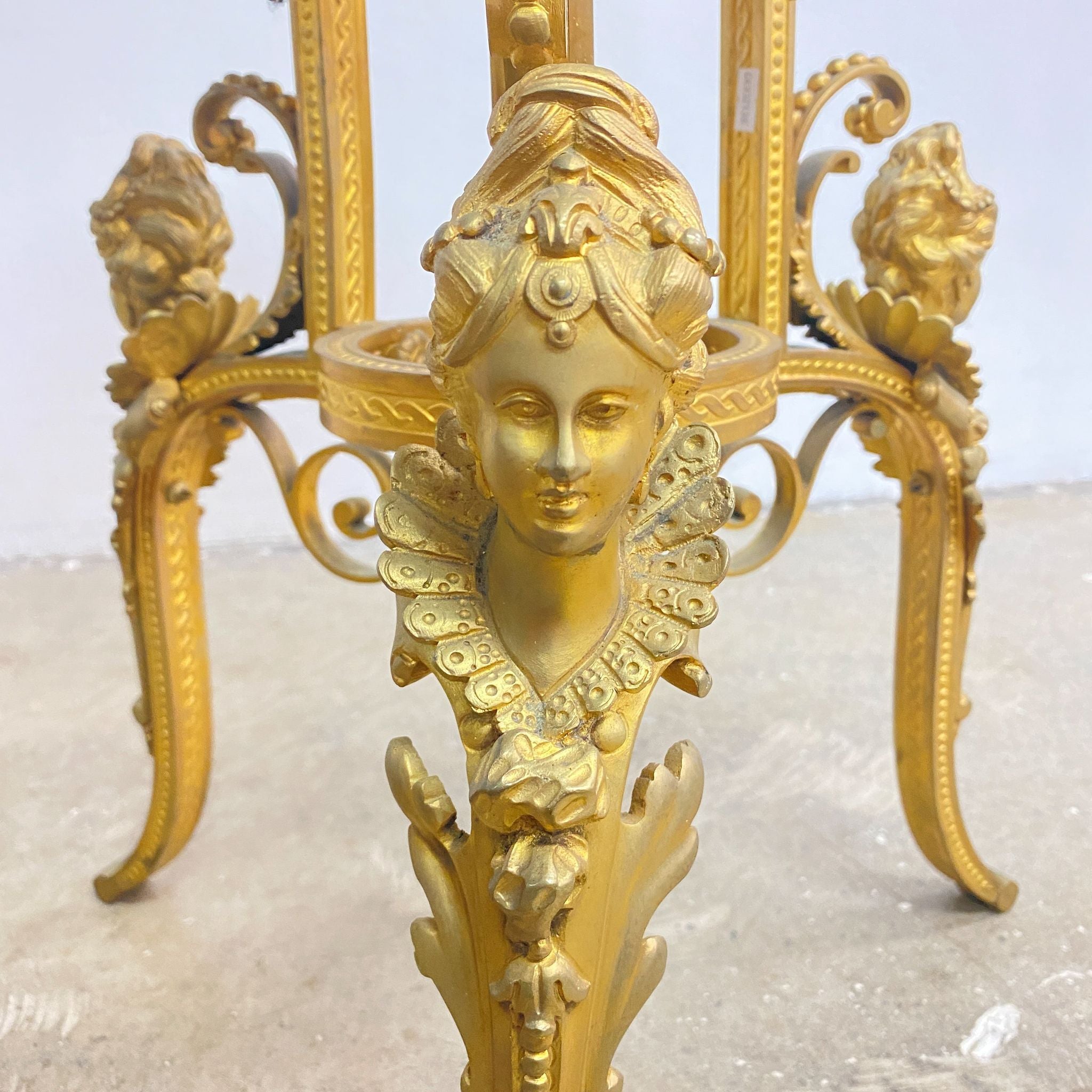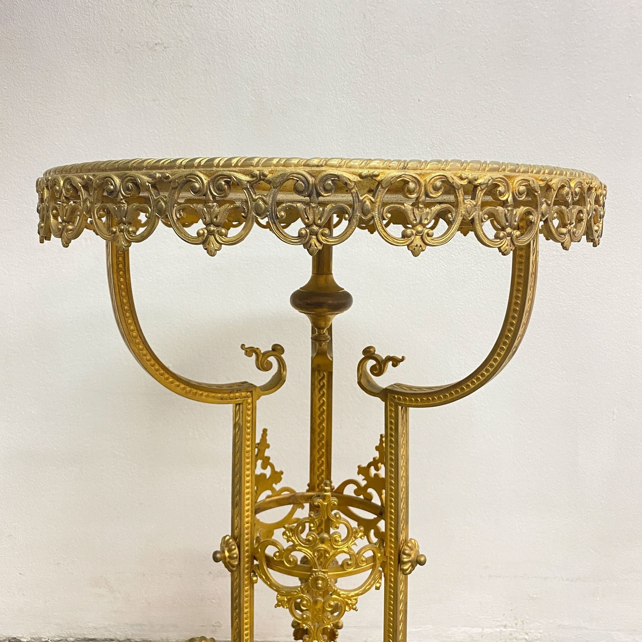 French antique ornate gold gilt jardiniere or plant stand, with circular marble top, openwork scrolling border, supported by three cabriole legs. A very beautiful decorative piece in excellent condition with some signs of use commensurate with age.