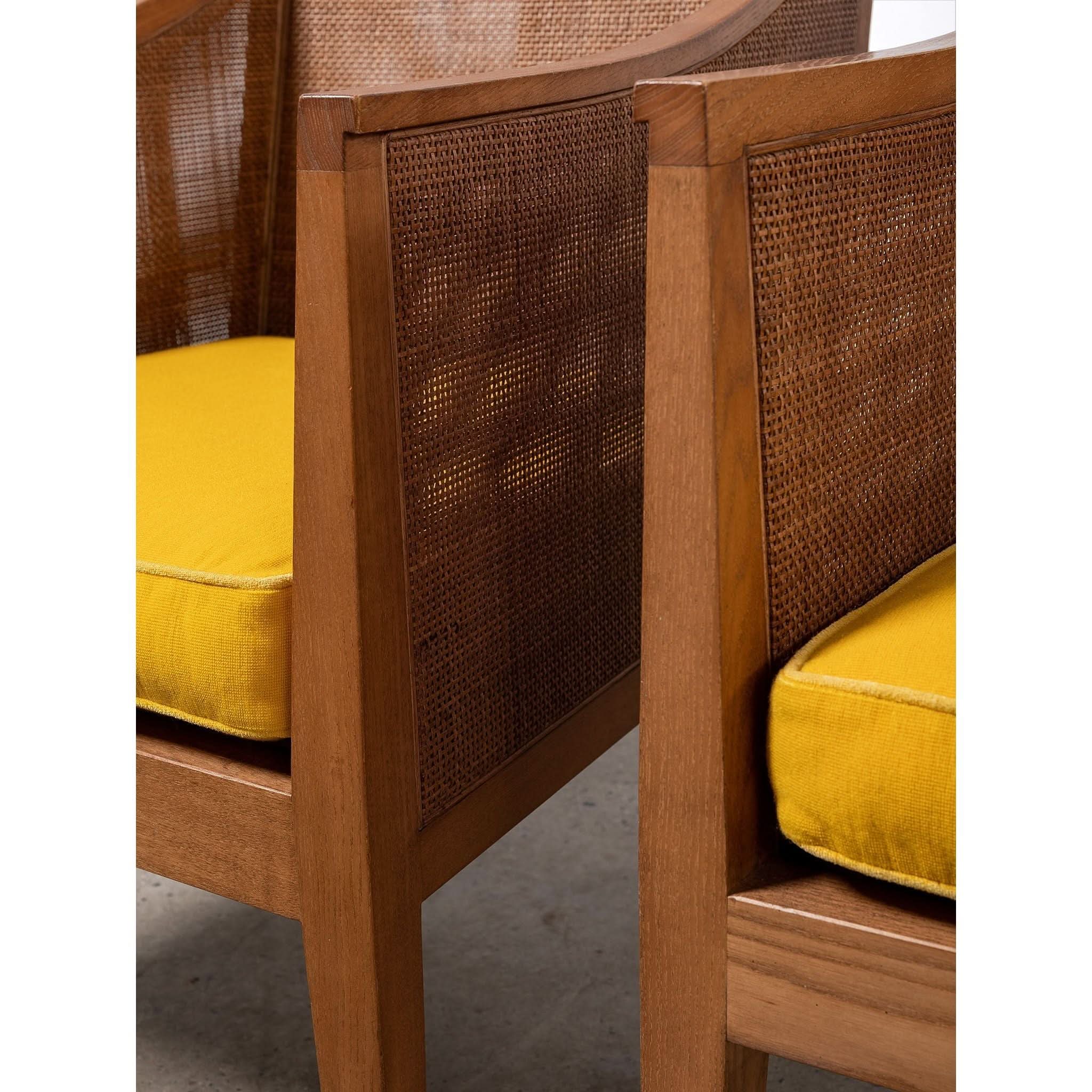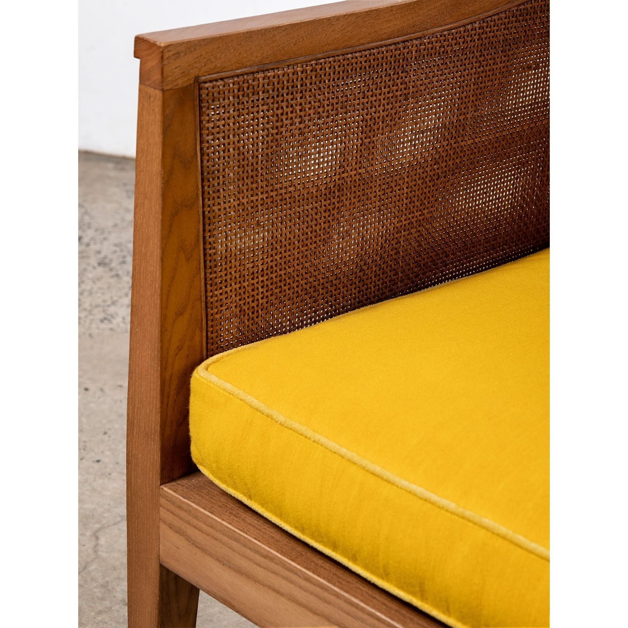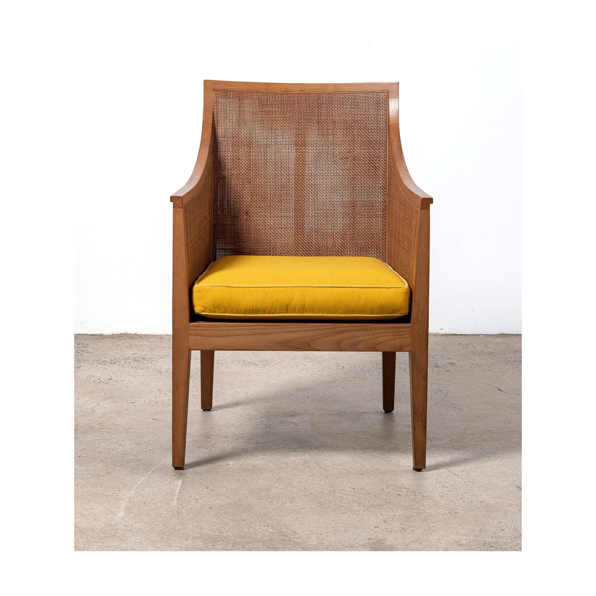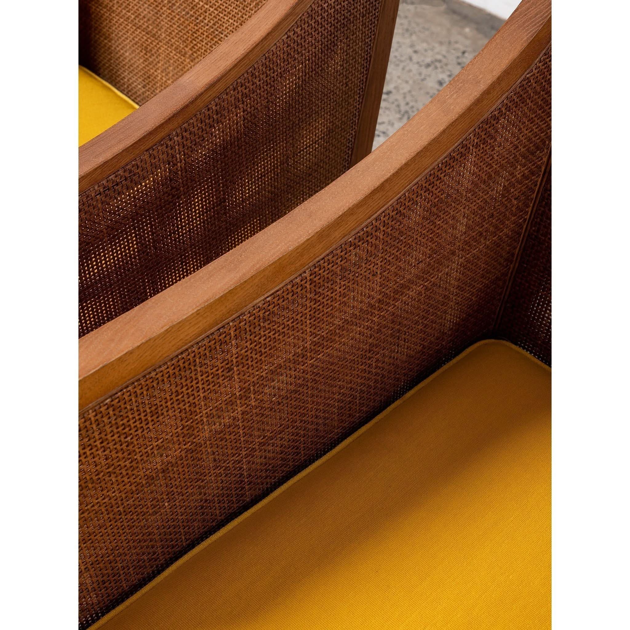 Armchair by Antonio Citterio for Flexform. With a frame crafted from beech wood, the rattan cladding runs along both the inside and outside. Featuring from wood joinery, high armrests and original lemon cushion.