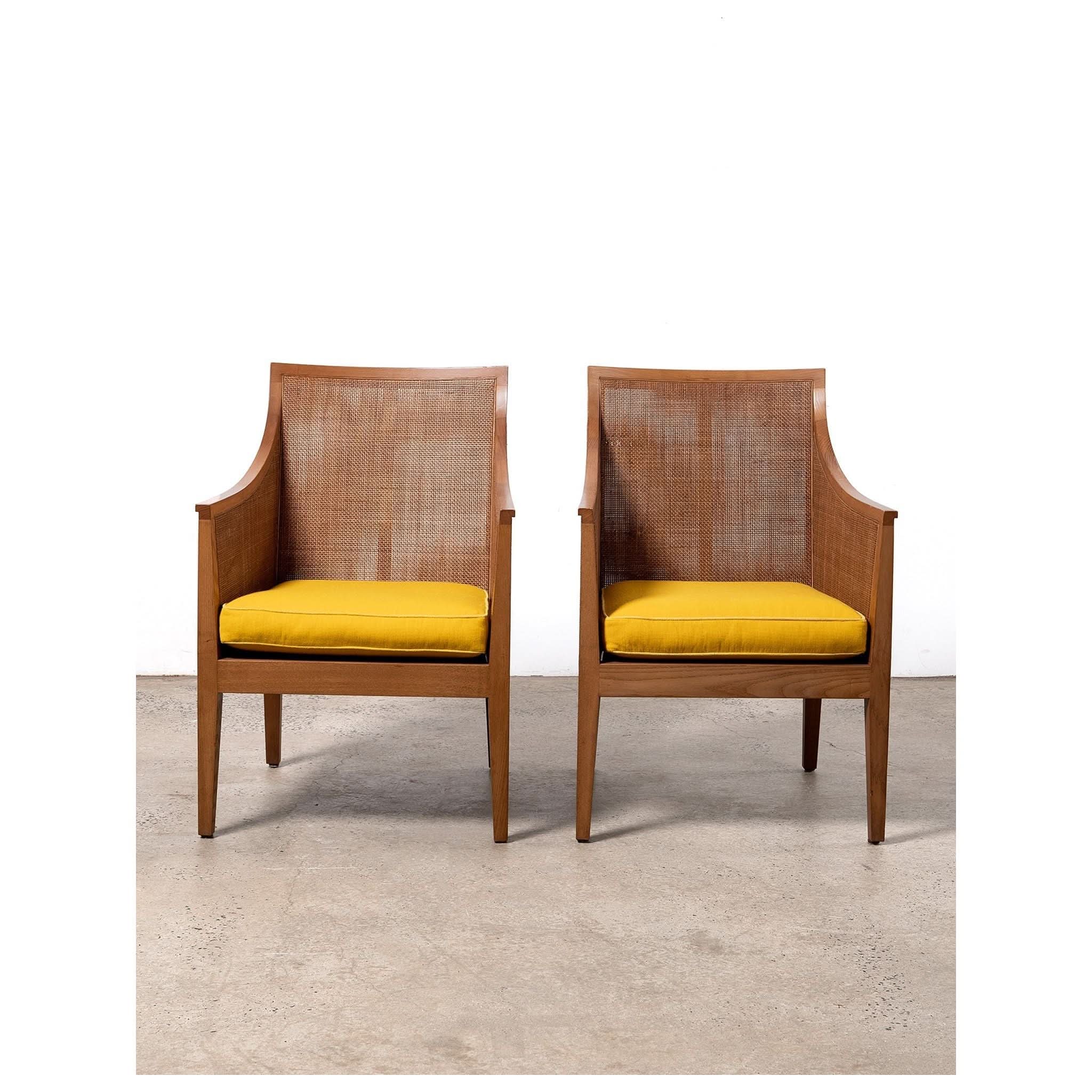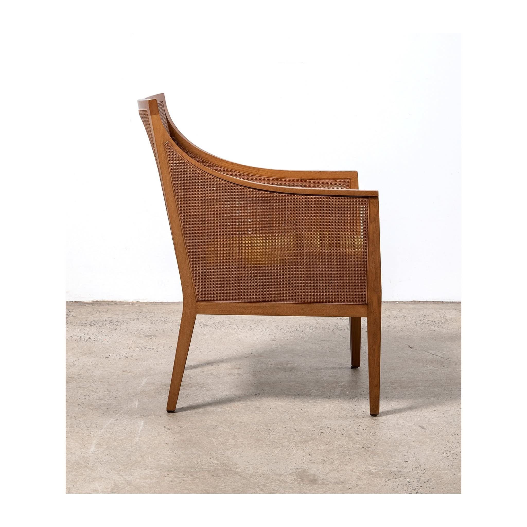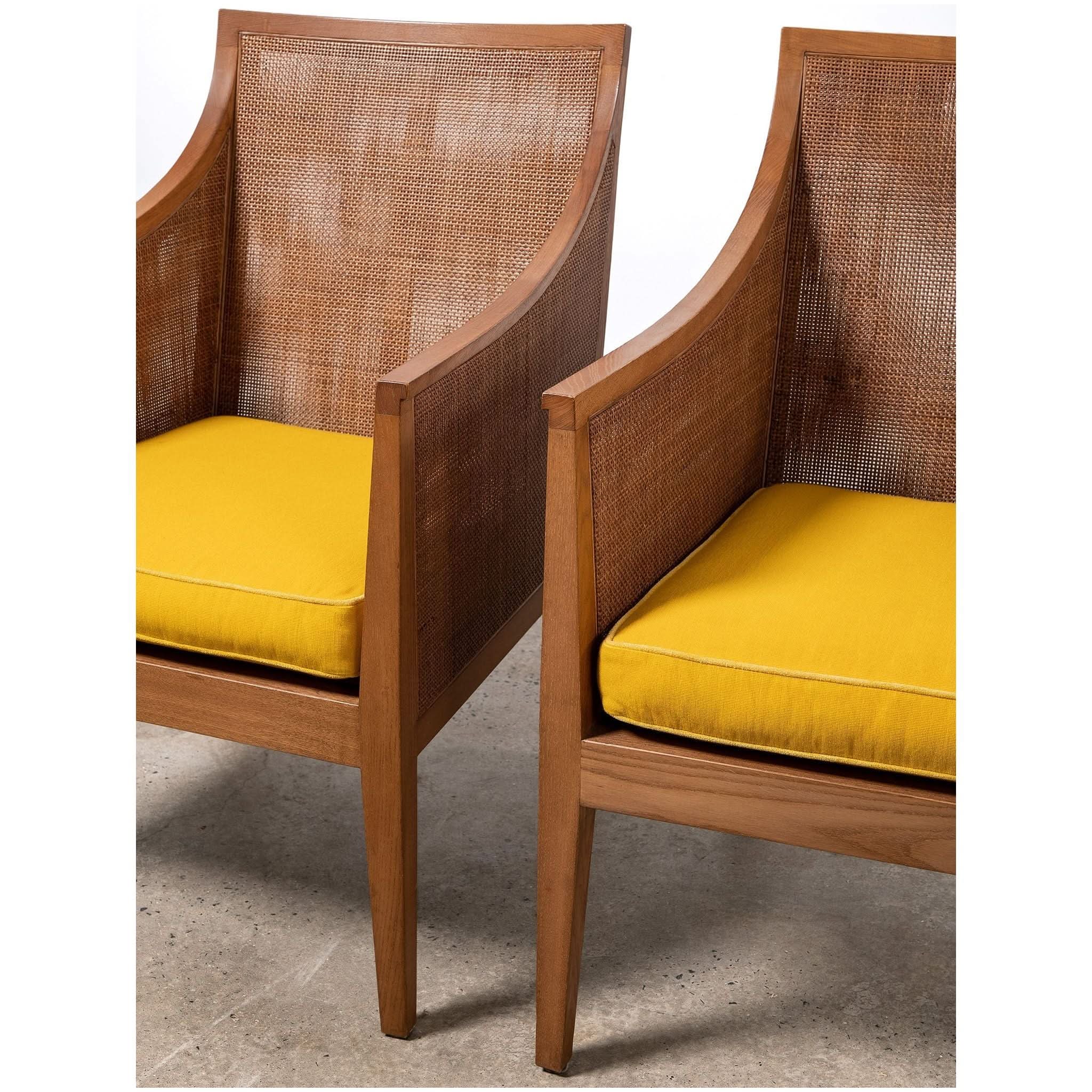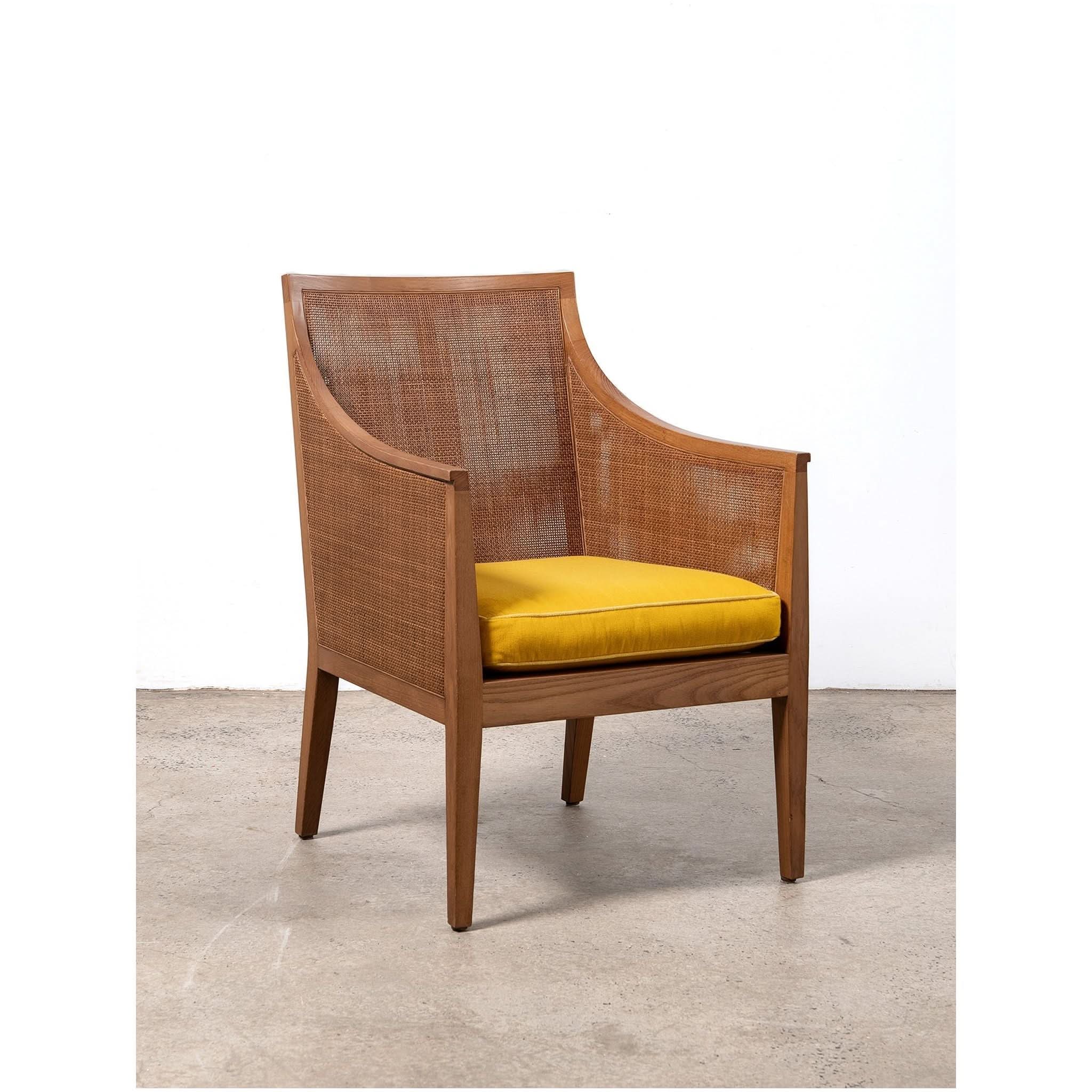 Armchair by Antonio Citterio for Flexform. With a frame crafted from beech wood, the rattan cladding runs along both the inside and outside. Featuring from wood joinery, high armrests and original lemon cushion.