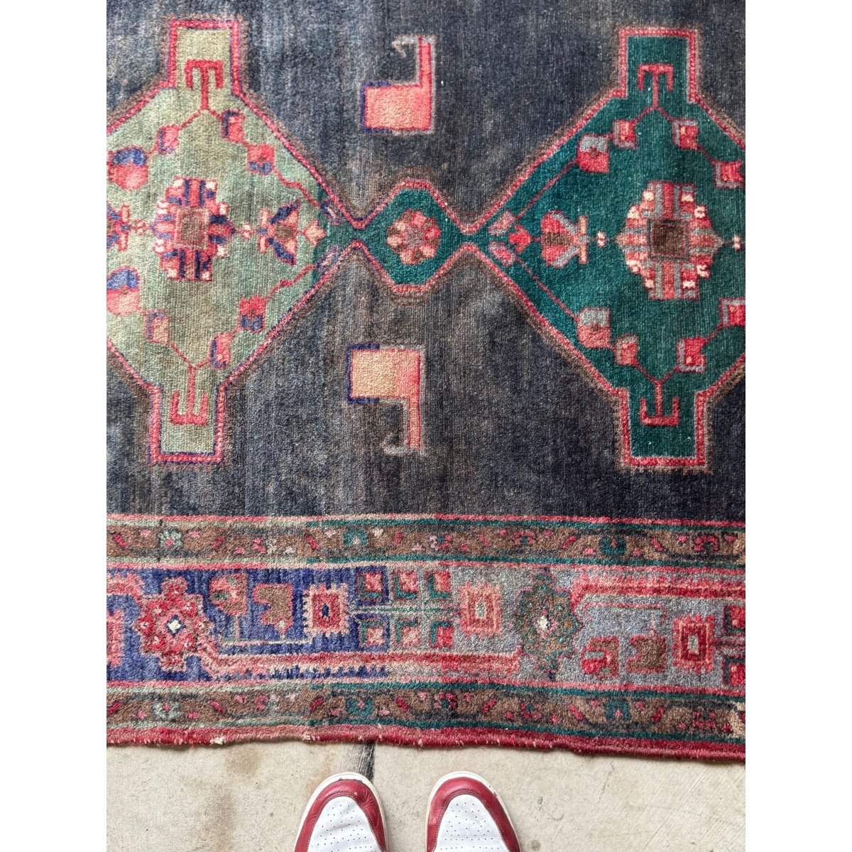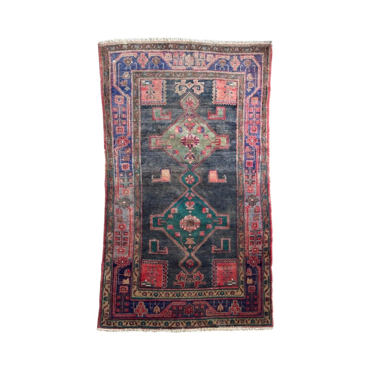 Handknotted Persian rug from the Hamadan region of north-west Iran, woven in the mid 20th century. This is a village-made piece, characterised by its bold geometric layout and stacked central medallions, drawn with the natural variation you expect from handwoven production. The palette is classic Hamadan: deep indigo ground with brick red, soft green and muted ivory details. Borders feature traditional tribal motifs, all rendered with a slightly irregular hand that gives the rug its honesty and charm. Wool pile on a cotton foundation. Wear is consistent with age and use, adding softness and character rather than detracting from the overall presence. A good, versatile size that works equally well in living spaces, hallways or layered under furniture.