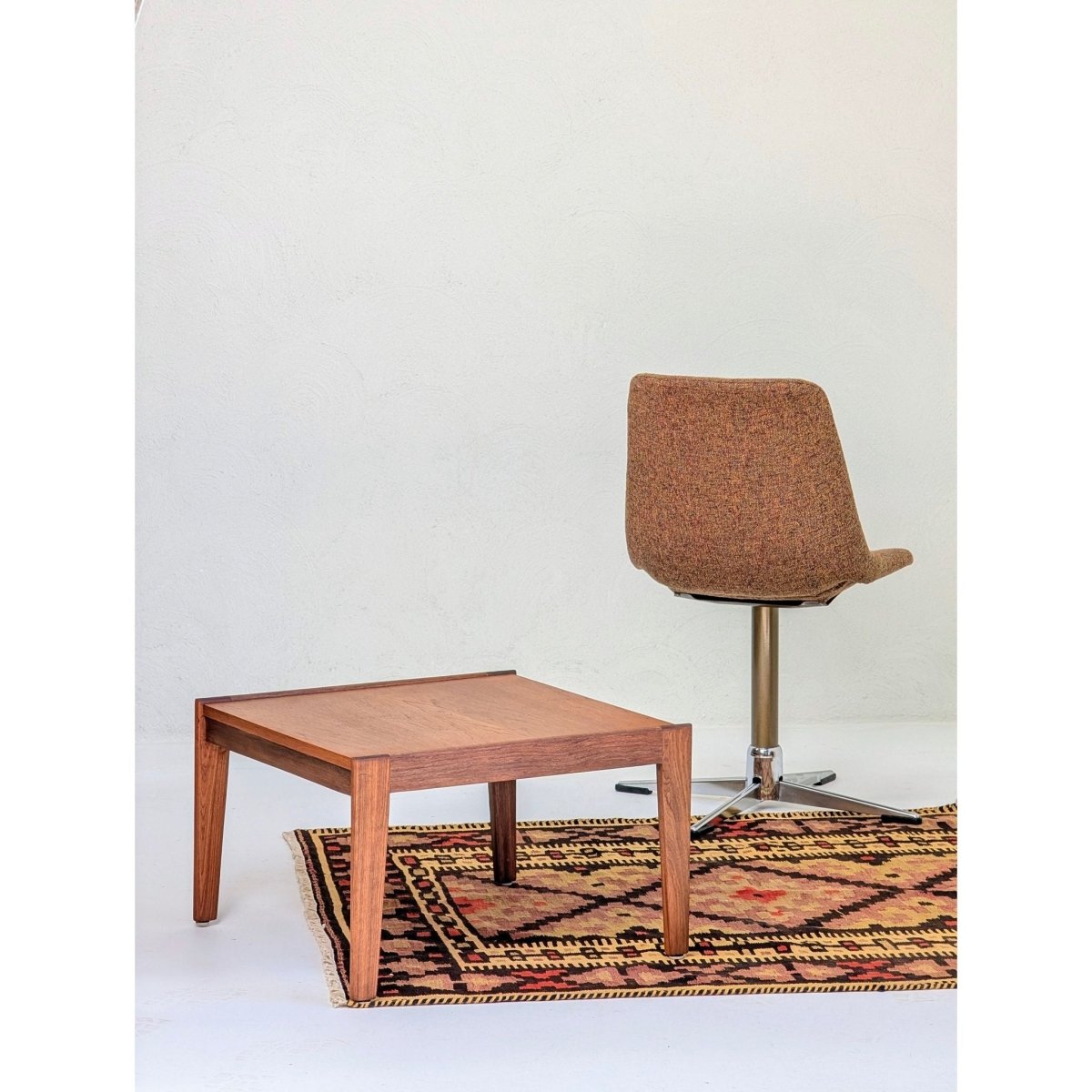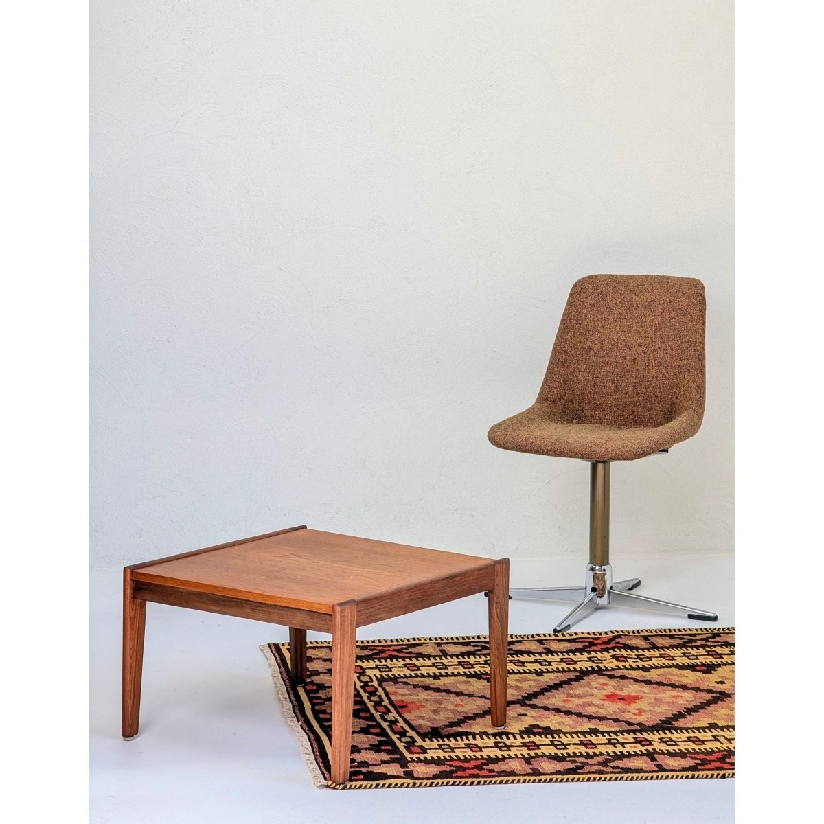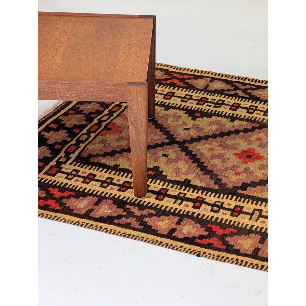 As a flatweave (Kilim), this piece has no pile, making it durable and versatile. Its nearly square dimensions (130 x 120 cm) make it an incredibly useful size for difficult spaces: it works perfectly in an entryway, under a small coffee table, layered over a larger sisal rug, or even mounted on the wall as a textile art piece. It brings an instant sense of warmth and texture to Mid-Century Modern, Bohemian, or contemporary interiors.