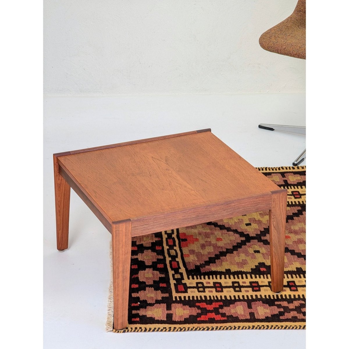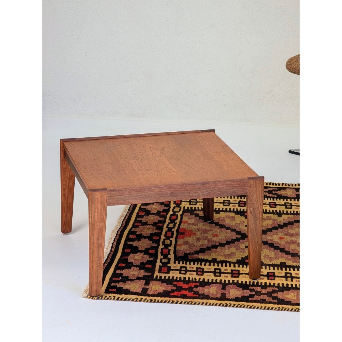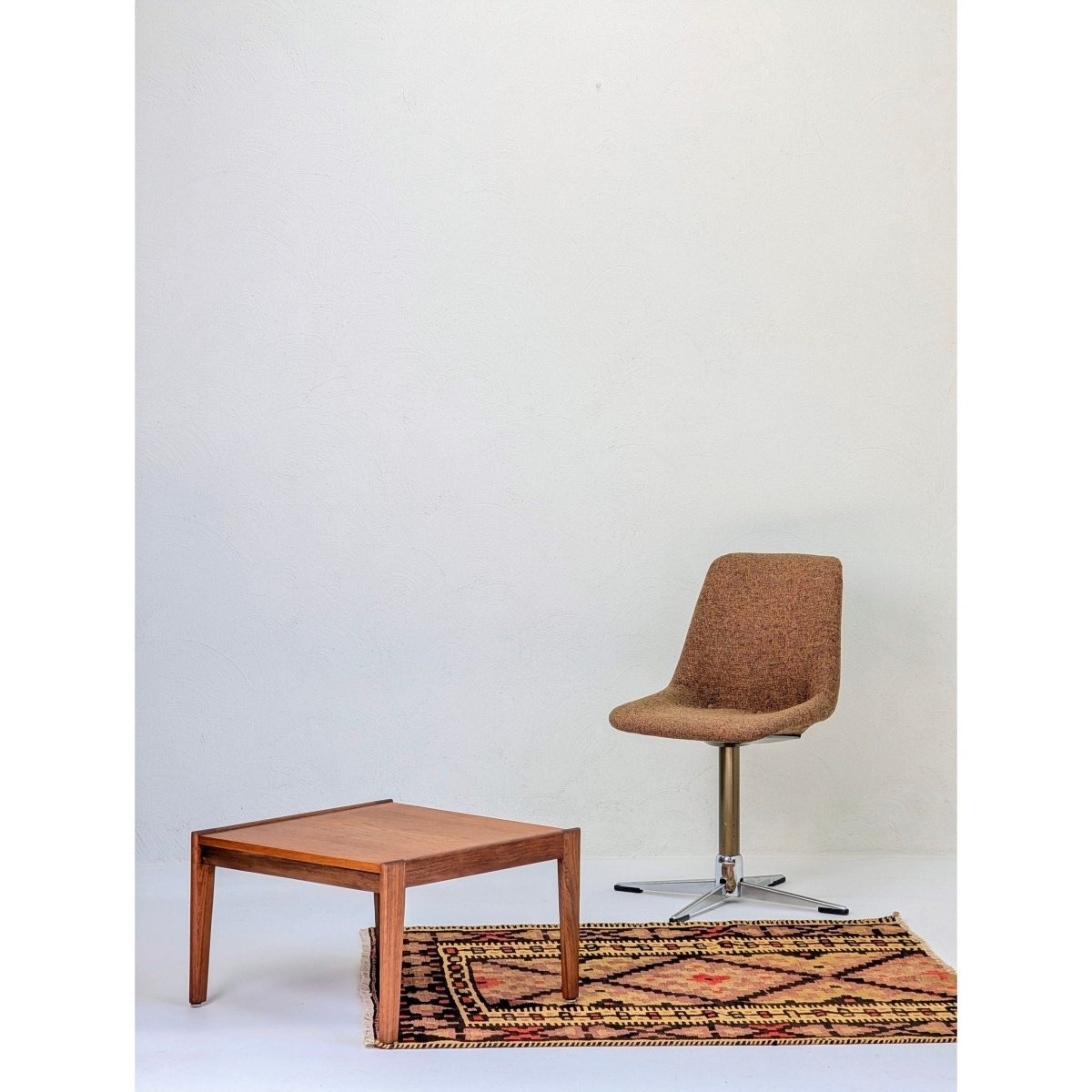 As a flatweave (Kilim), this piece has no pile, making it durable and versatile. Its nearly square dimensions (130 x 120 cm) make it an incredibly useful size for difficult spaces: it works perfectly in an entryway, under a small coffee table, layered over a larger sisal rug, or even mounted on the wall as a textile art piece. It brings an instant sense of warmth and texture to Mid-Century Modern, Bohemian, or contemporary interiors.