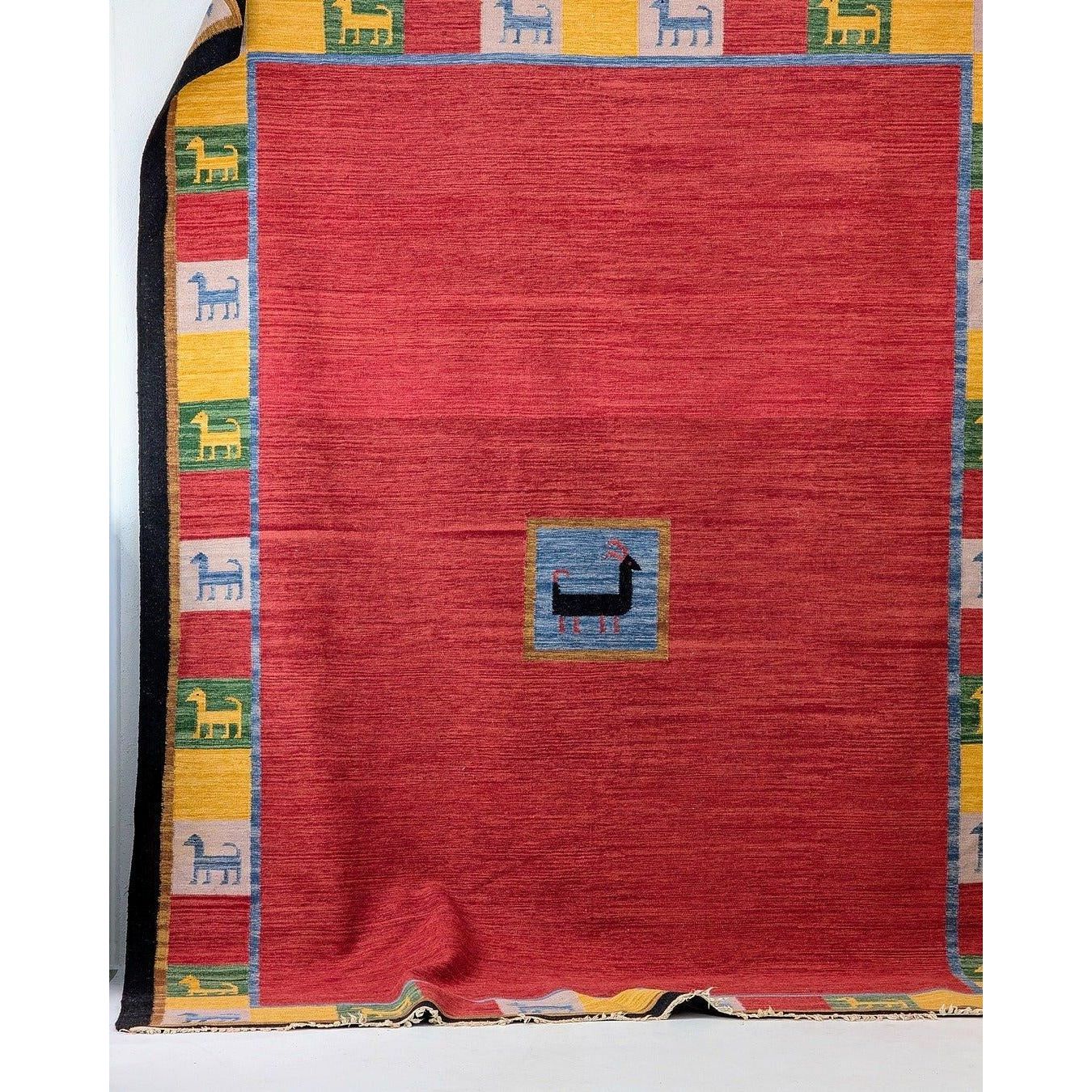 This Gabbeh is a woven narrative, a personal story told through a lexicon of ancient symbols. At its heart, a single, stylised deer or gazelle stands in quiet contemplation — a potent emblem of grace, gentleness, and the natural world. Encircling this serene scene is a lively procession of guardian dogs, a motif symbolising protection and loyalty, who patrol the border and safeguard the inner world of the rug. The charming simplicity of these figures is a hallmark of the Gabbeh style, where the weaver's personal expression and emotional connection to her surroundings take precedence over formal design. Each charming irregularity is a whisper of the weaver's hand and a testament to the belief that only the divine can be perfect, making this not just a rug, but a unique and soulful work of folk art.