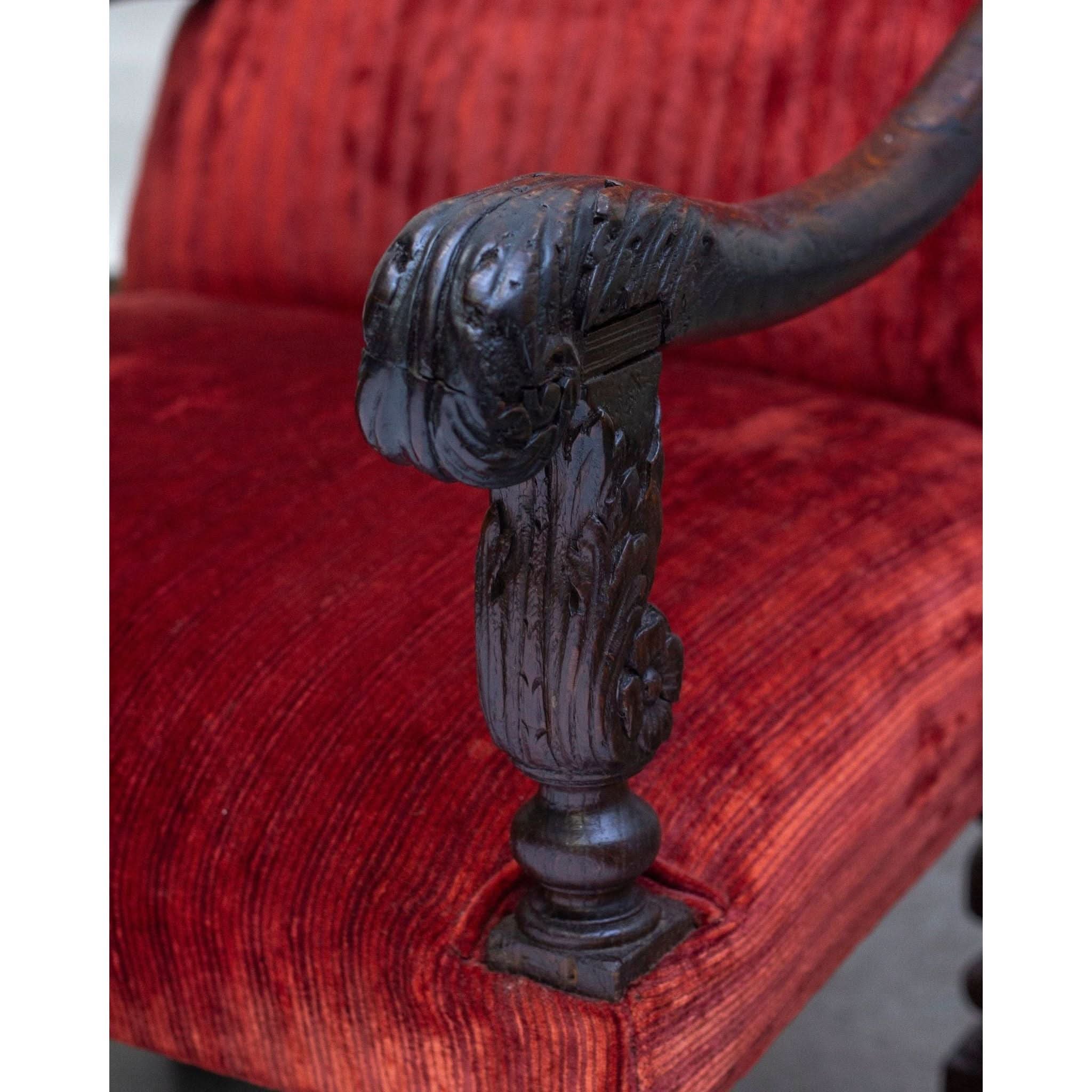Condition: Overall great antique condition. One rose carving on front apron missing and some minor fraying to red upholstery.