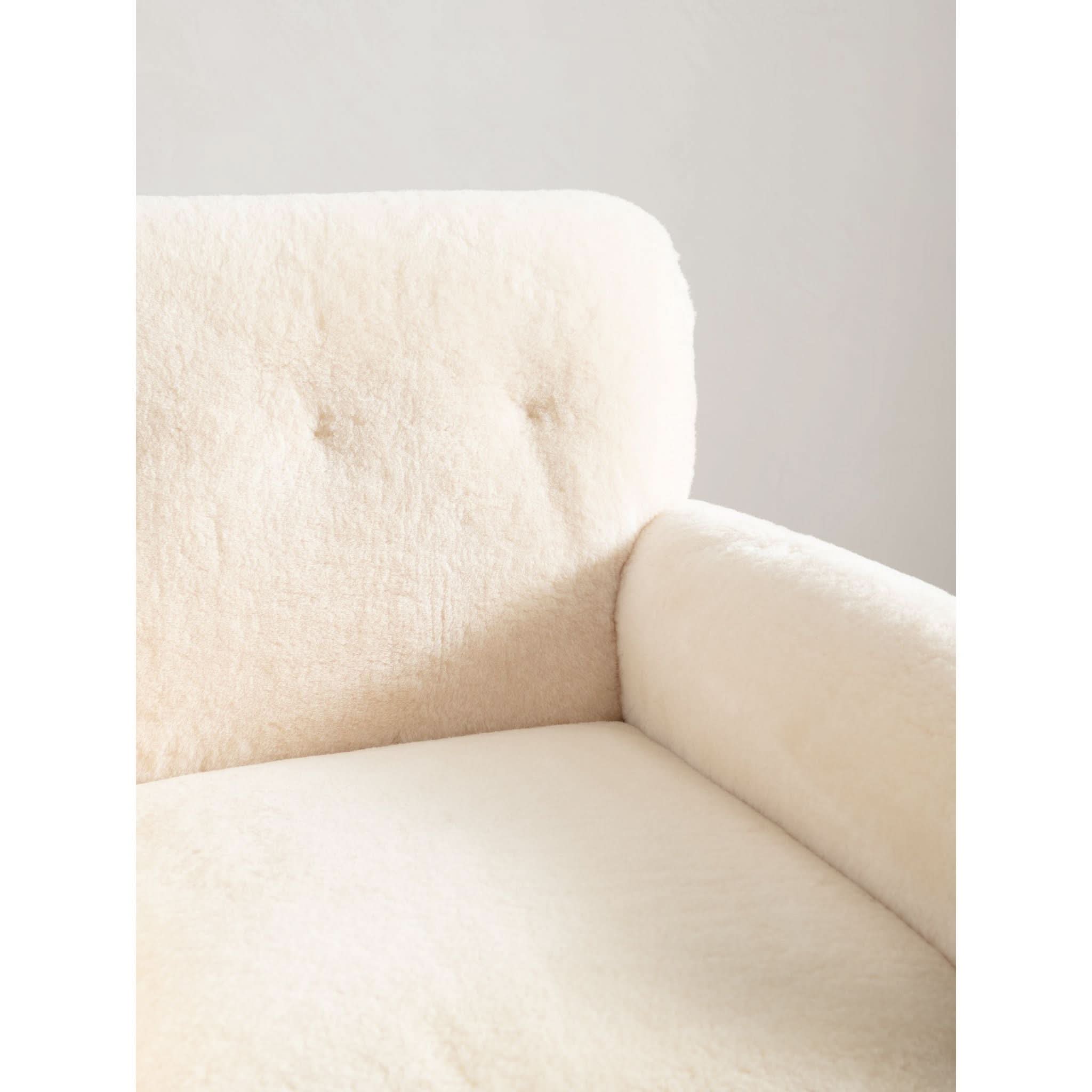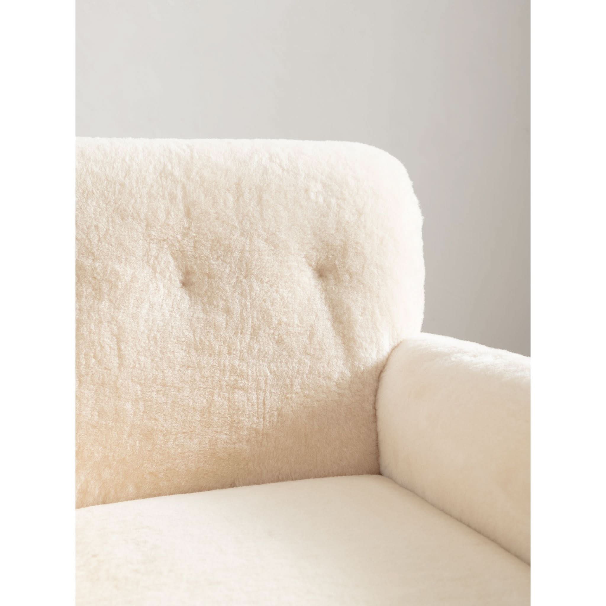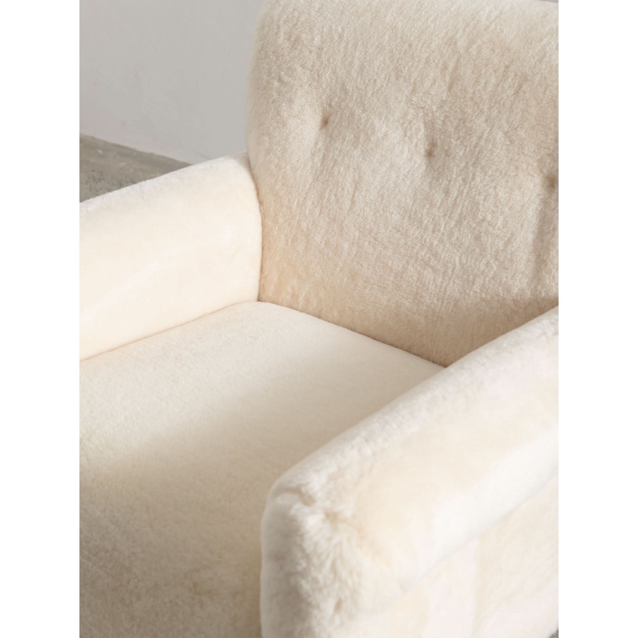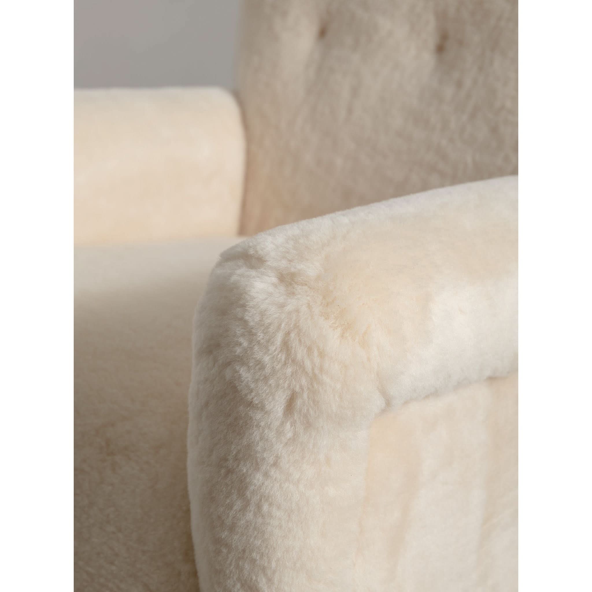 Sit back into the timeless elegance of the 1960s with the exquisite solid armchair, a testament to the artistry of mid-century design. Meticulously reupholstered in the finest cream sheepskin, the piece offers a sumptuous blend of texture and warmth, inviting you to sink into its soft embrace.