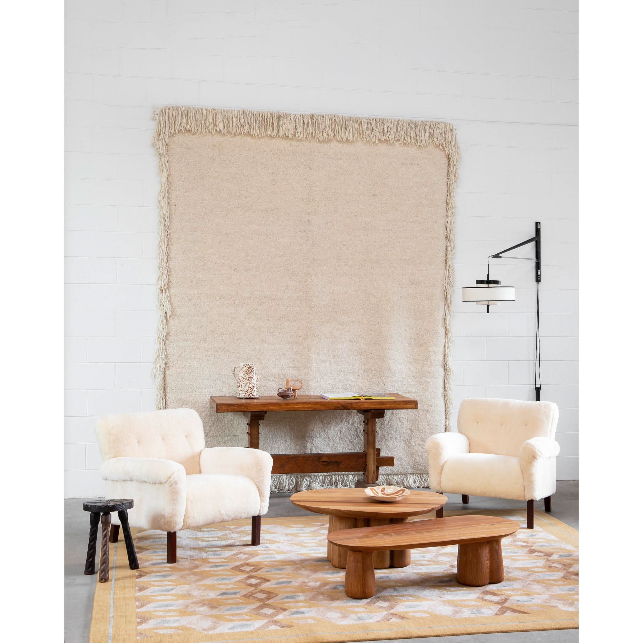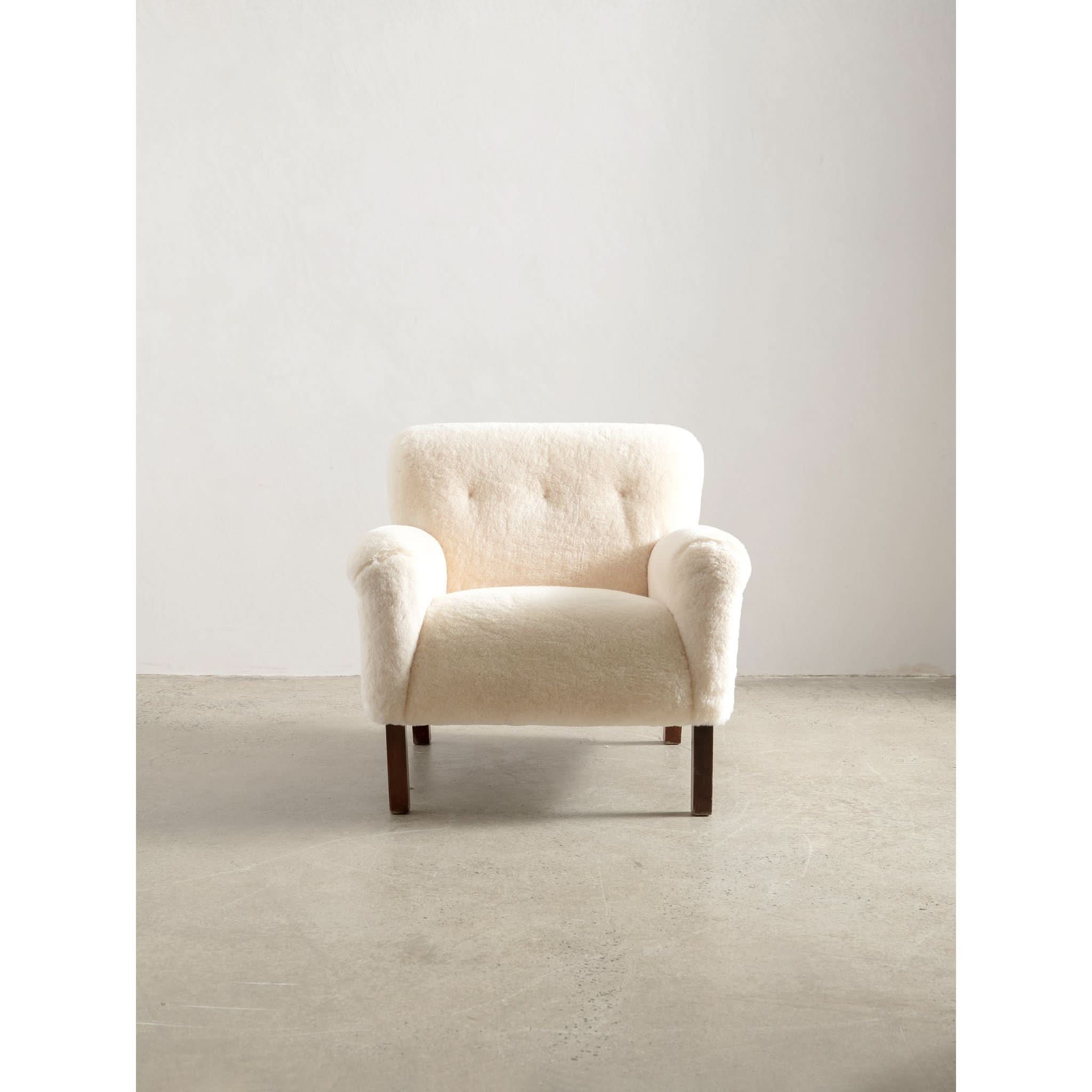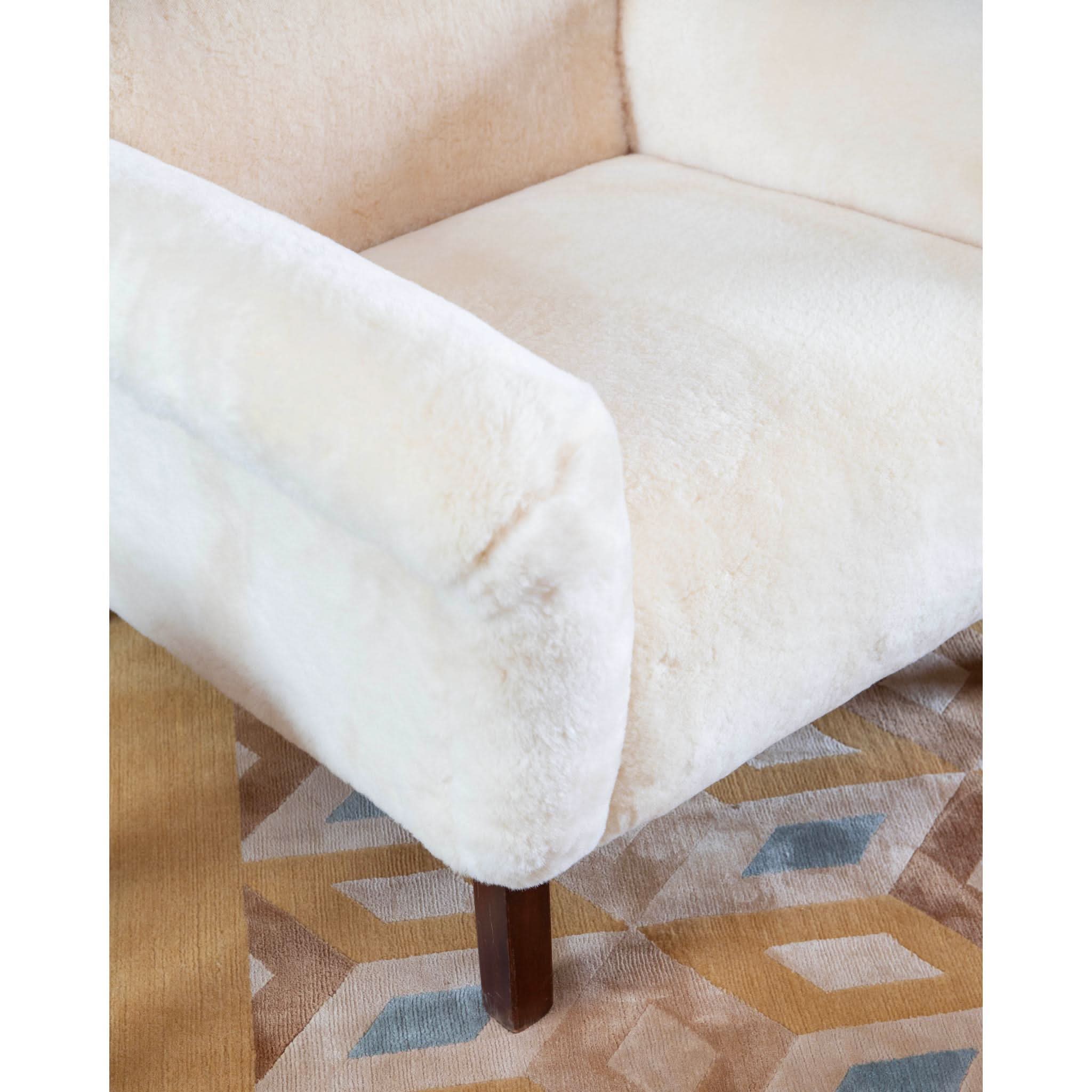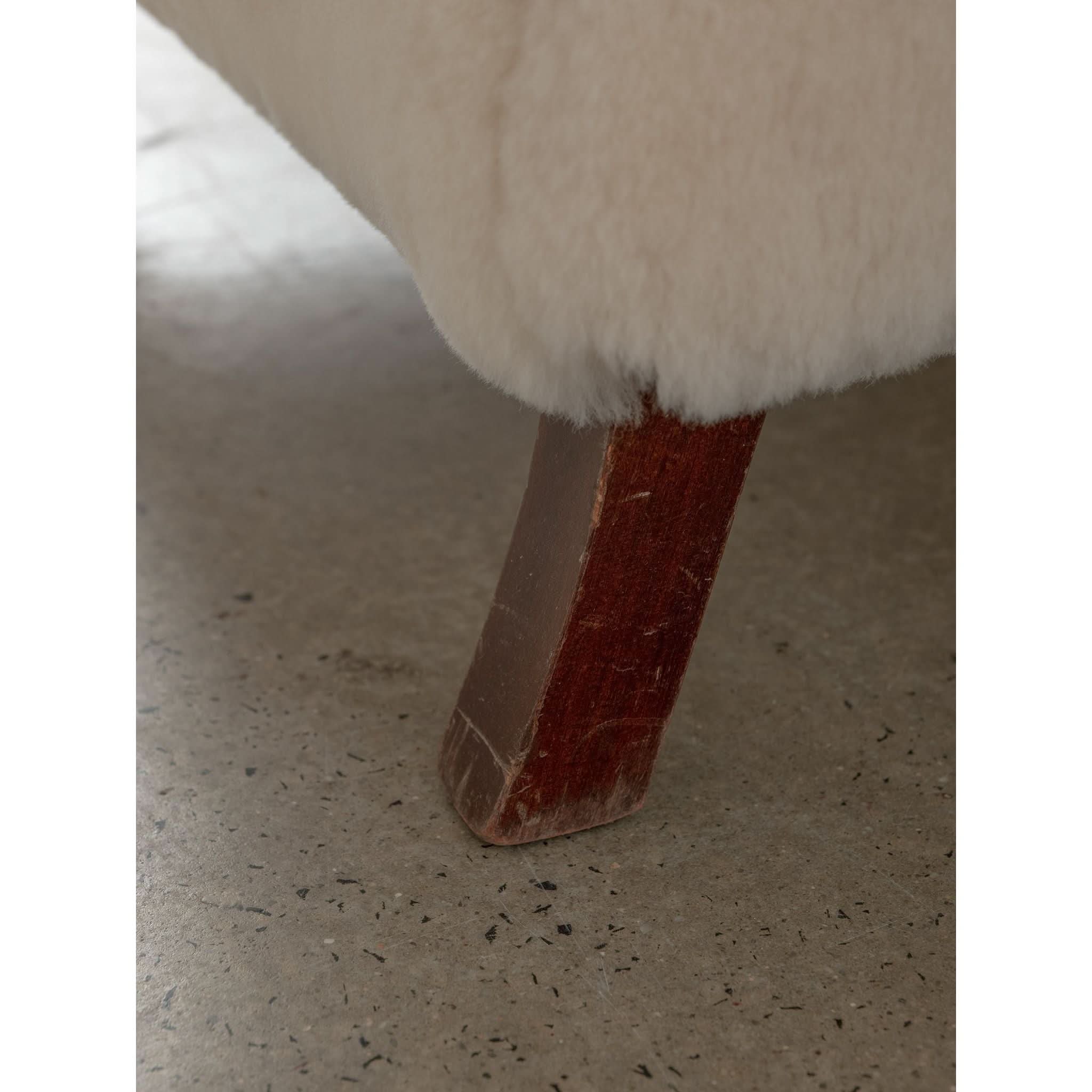 Sit back into the timeless elegance of the 1960s with the exquisite solid armchair, a testament to the artistry of mid-century design. Meticulously reupholstered in the finest cream sheepskin, the piece offers a sumptuous blend of texture and warmth, inviting you to sink into its soft embrace.