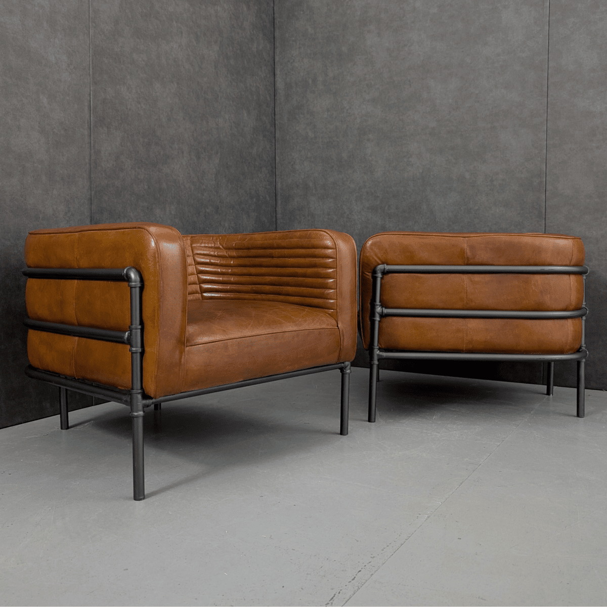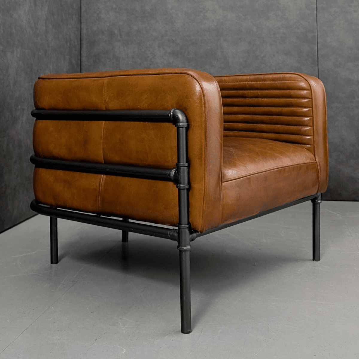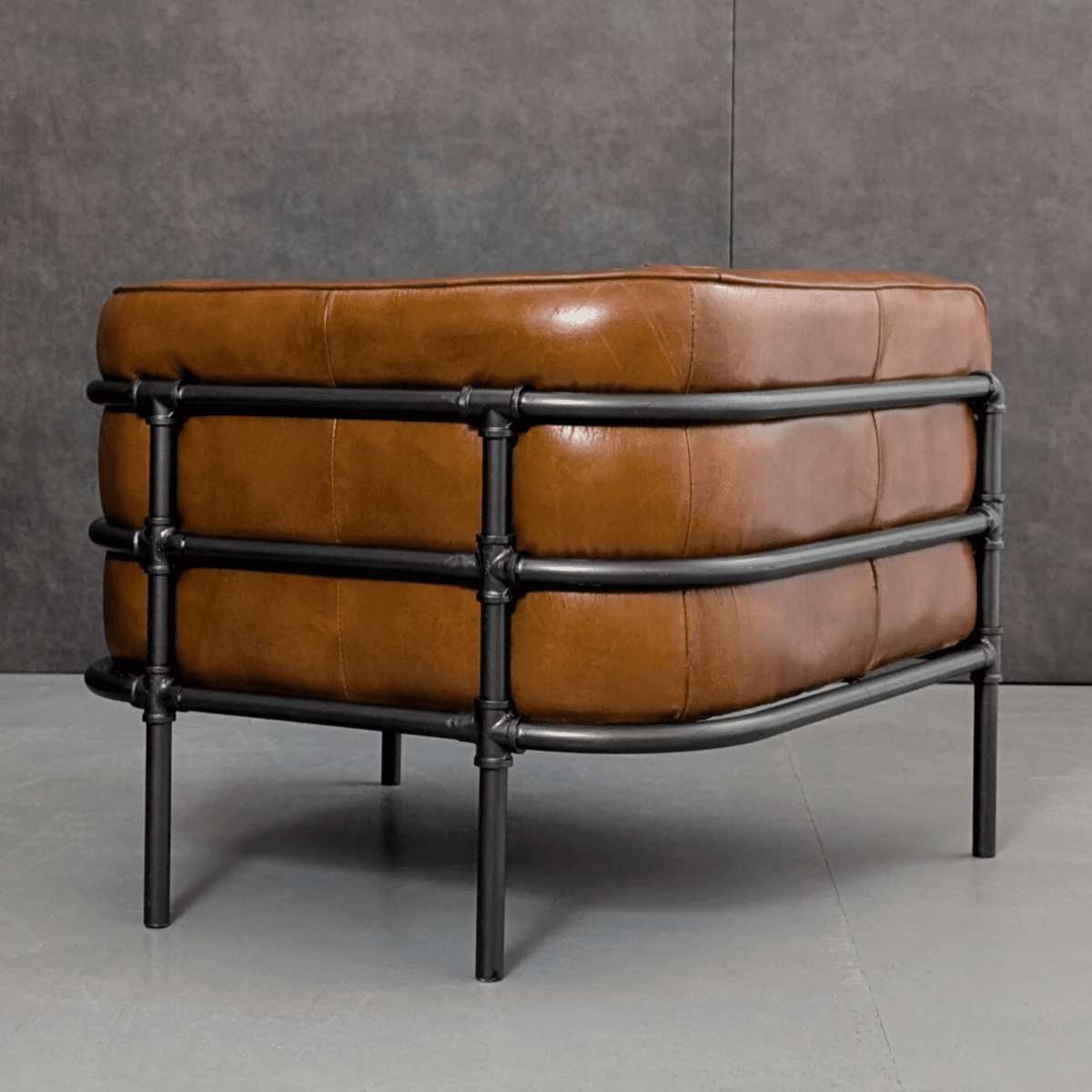 Built in the early twenty-first century during the height of the loft and industrial revival, the design pairs an exposed steel pipe-frame cage with generous volumes of top-grain cowhide leather, ribbed internally for structure and comfort. The form nods to postwar industrial language and late modern interiors rather than classic modernism, with a deliberate emphasis on material honesty and physical presence. Broad proportions, deep leather, and visible structure return the piece to its core function as a seat designed to anchor space rather than decorate it.