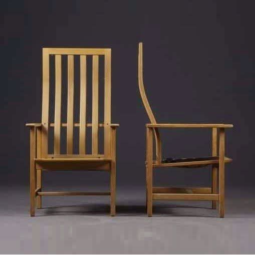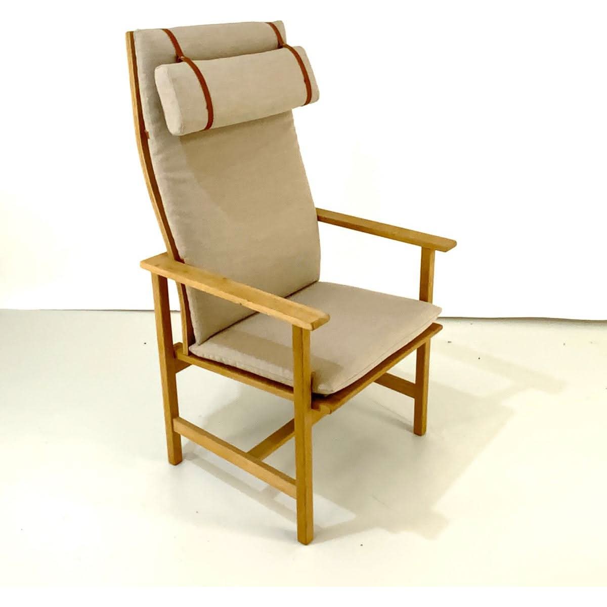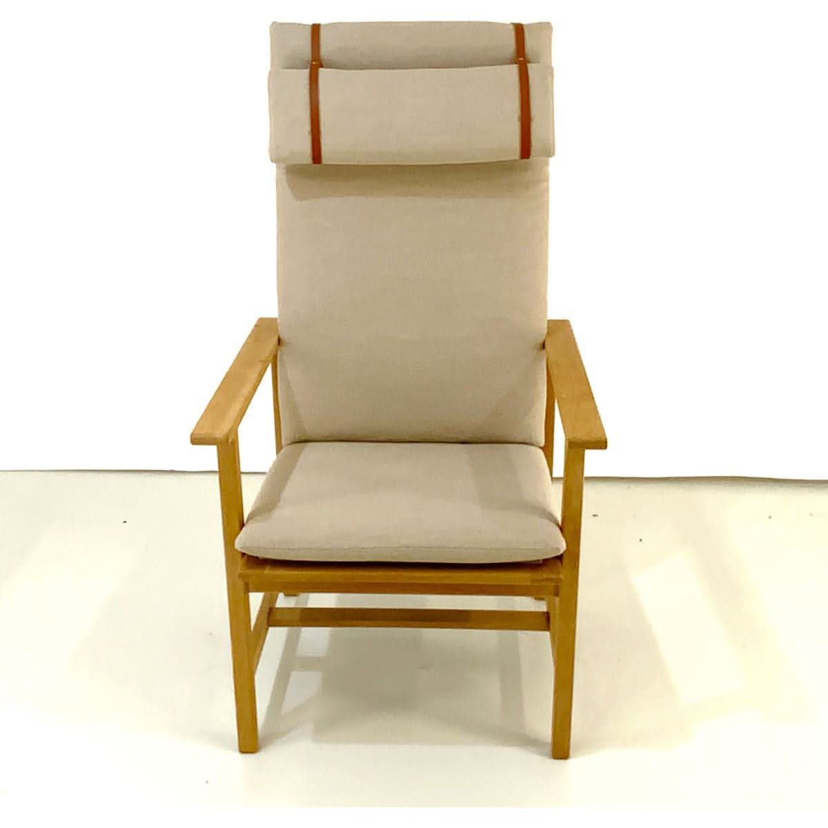 Slatted Oak High-back Single Chair (electric series). Now upholstered in linen. Matching 2-seater & 3-seater sofas also available.