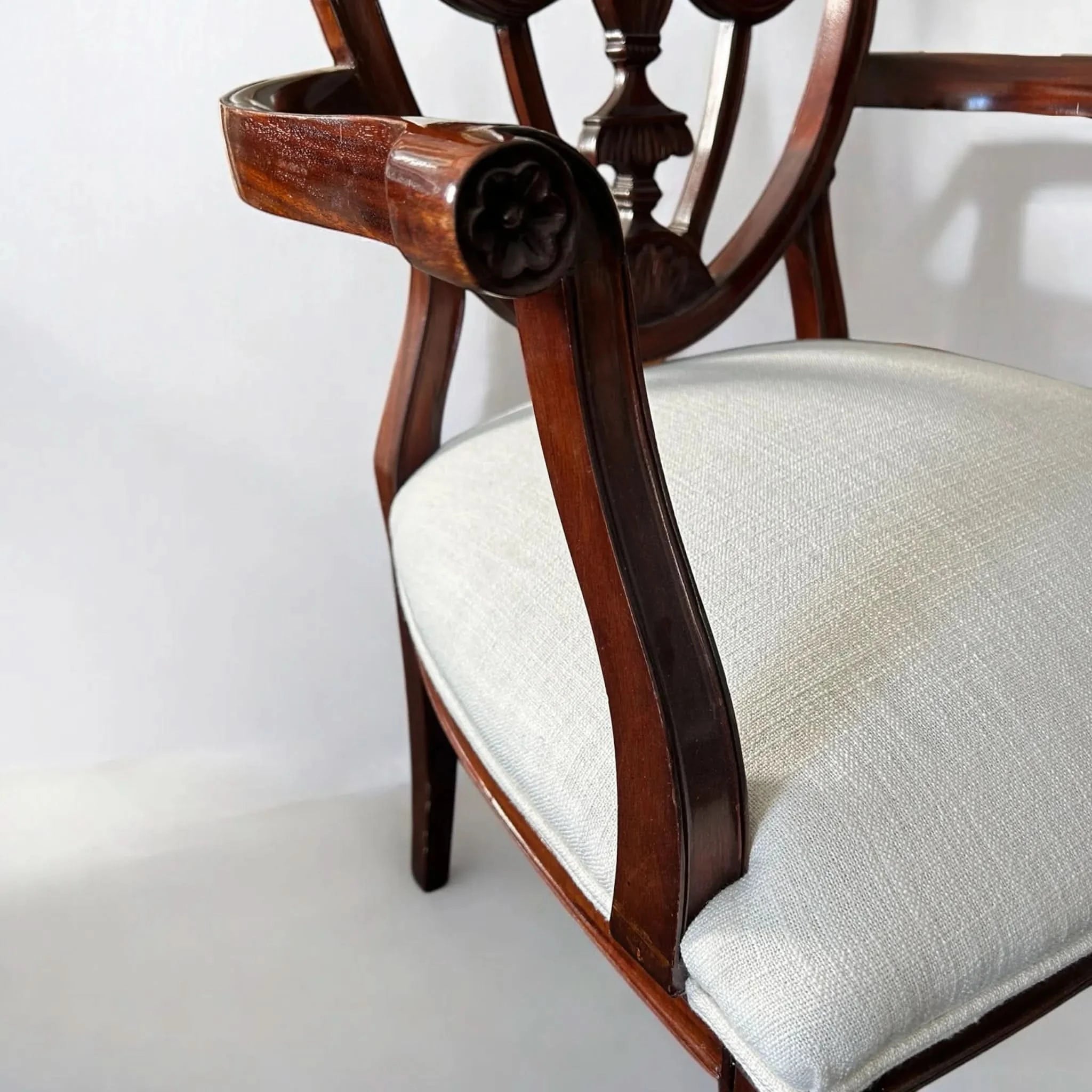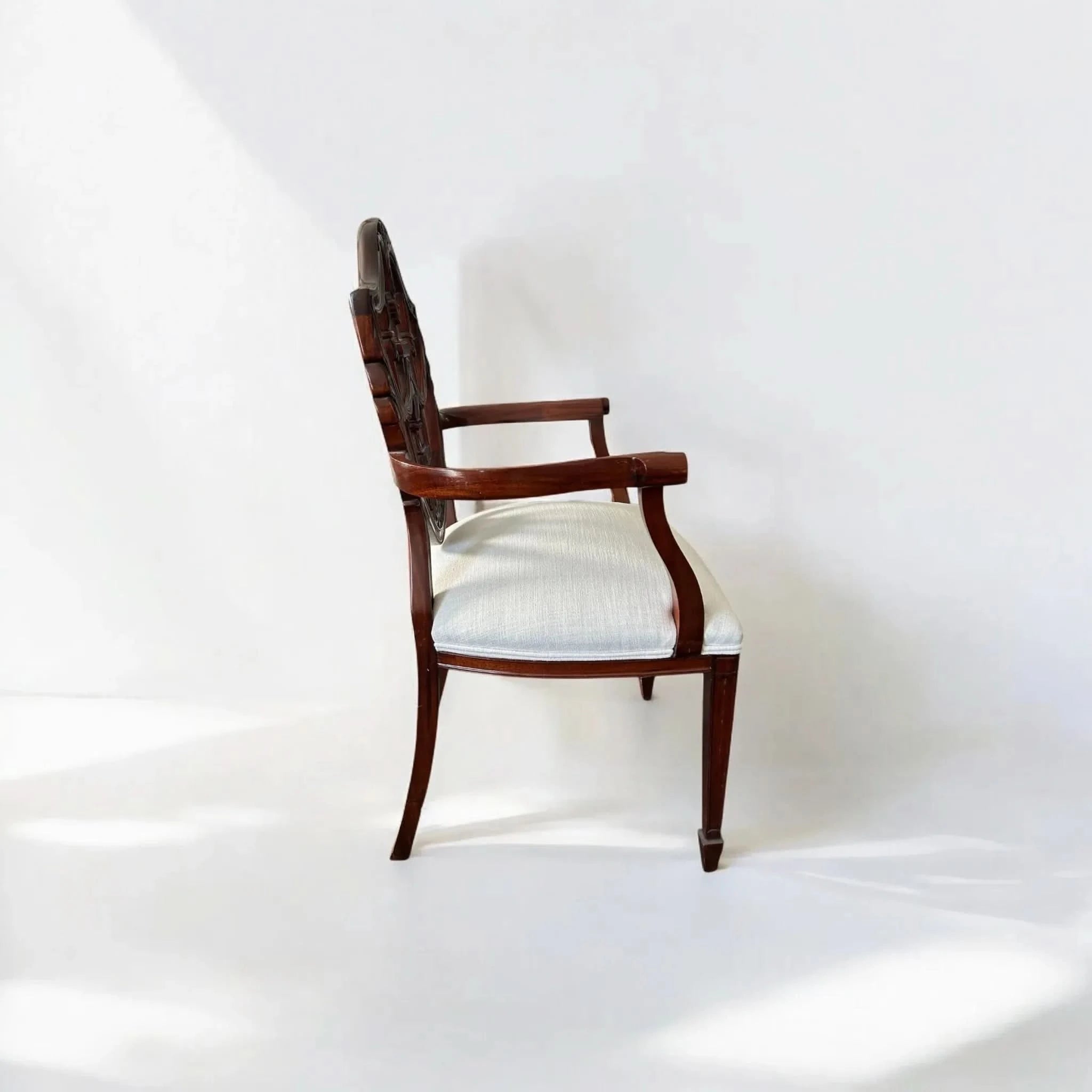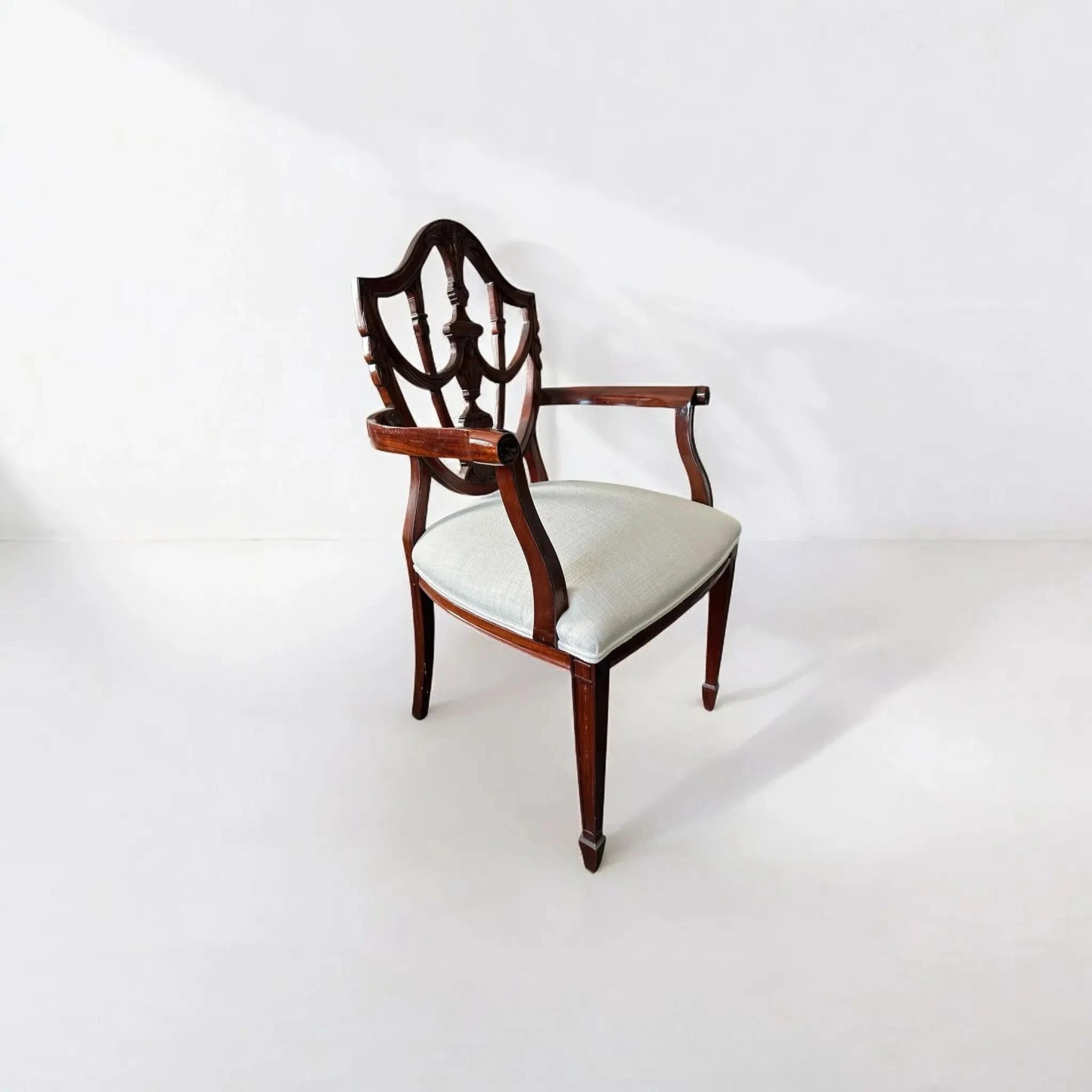 this vintage Sheraton/Hepplewhite Shiels-back Carver embodies timeless craftsmanship. In original condition with a newly upholstered seat with fabric from Westbury Textiles, its graceful lines and delicate detailing speaks to an era of refined design. Signs of wear on the French polish frame, add to its authenticity, making it a true piece of history.