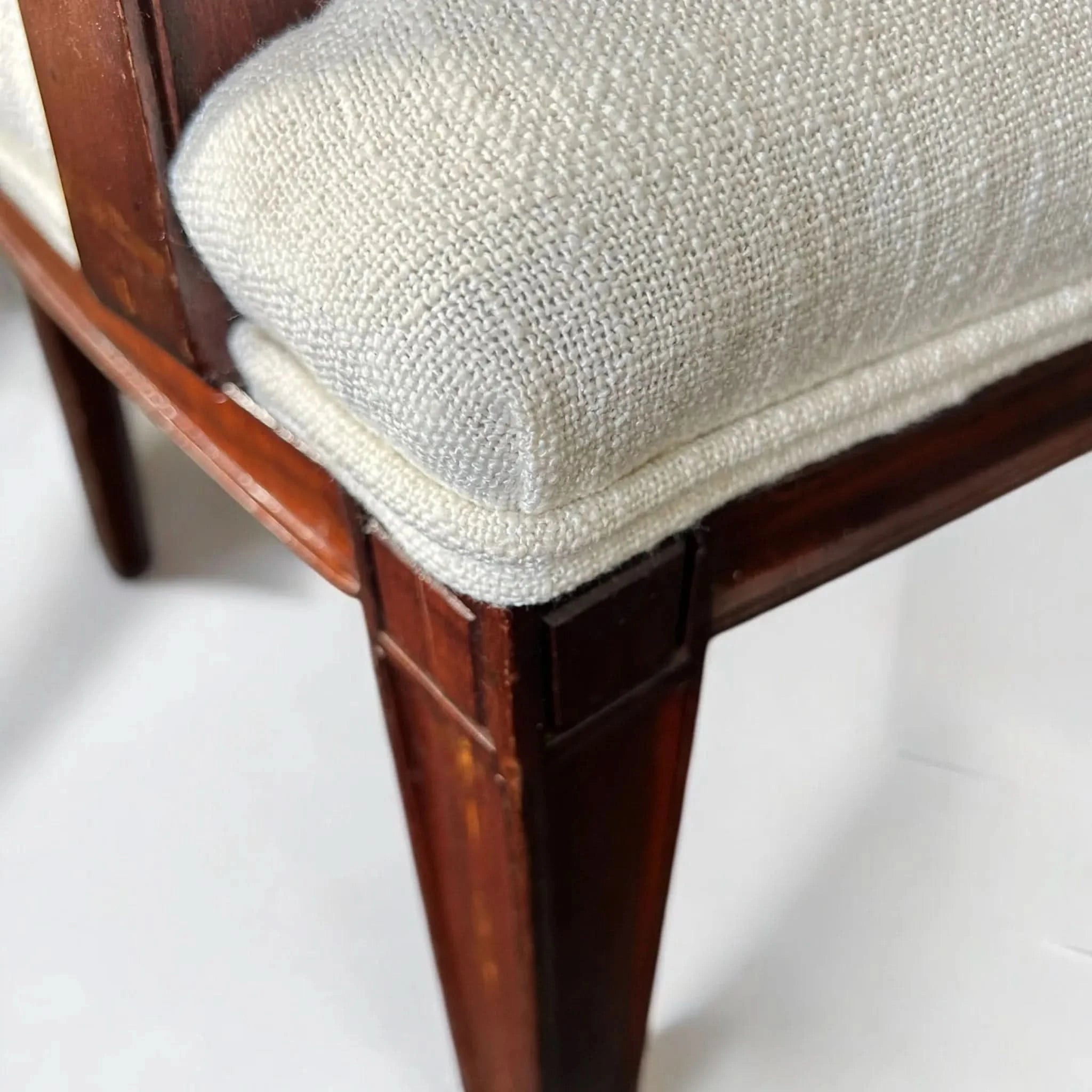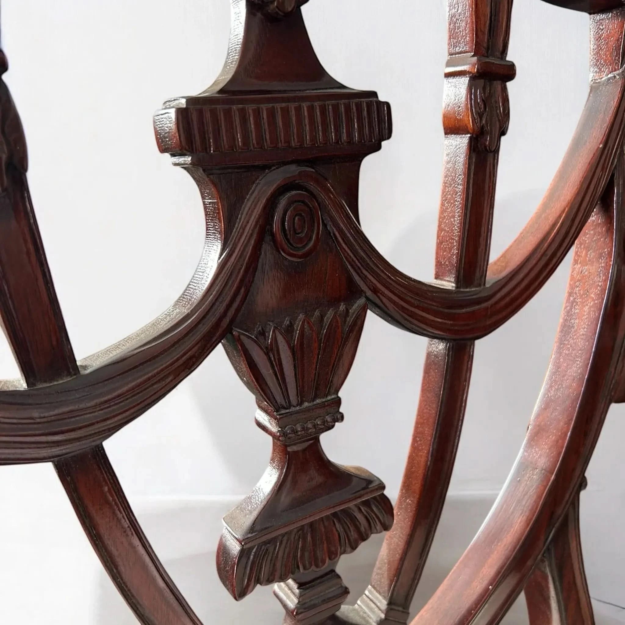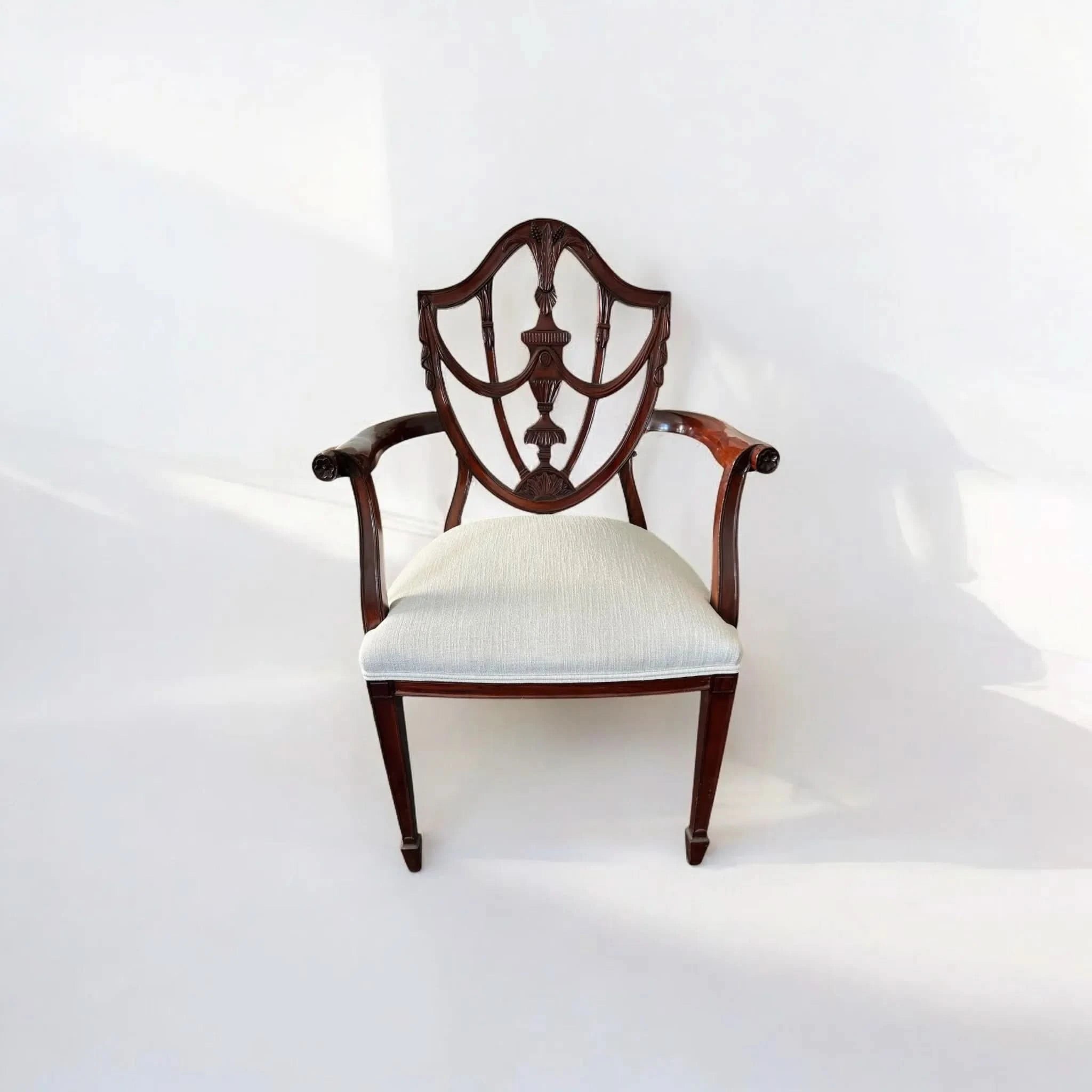 this vintage Sheraton/Hepplewhite Shiels-back Carver embodies timeless craftsmanship. In original condition with a newly upholstered seat with fabric from Westbury Textiles, its graceful lines and delicate detailing speaks to an era of refined design. Signs of wear on the French polish frame, add to its authenticity, making it a true piece of history.