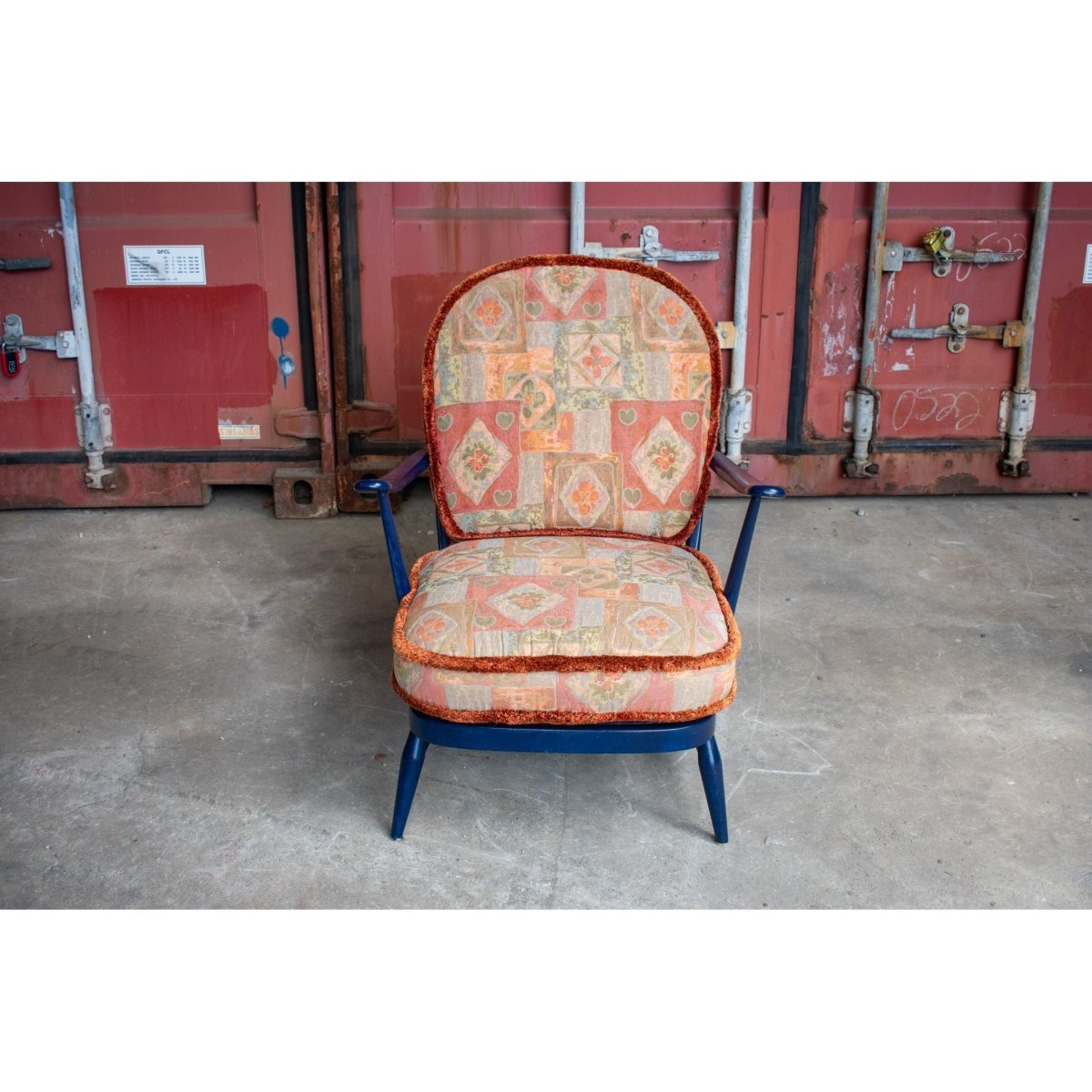 This vintage Ercol Model 203 armchair blends iconic British design with a playful twist. Designed by Lucian Ercolani and produced from the late 1950s through the 1970s, the Model 203 is celebrated for its sculpted armrests, slatted back, and generous proportions — all present here in full.