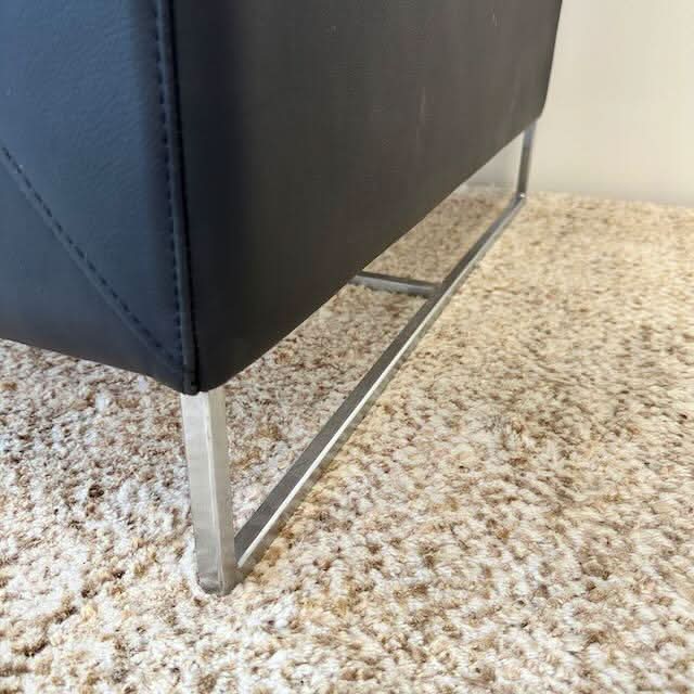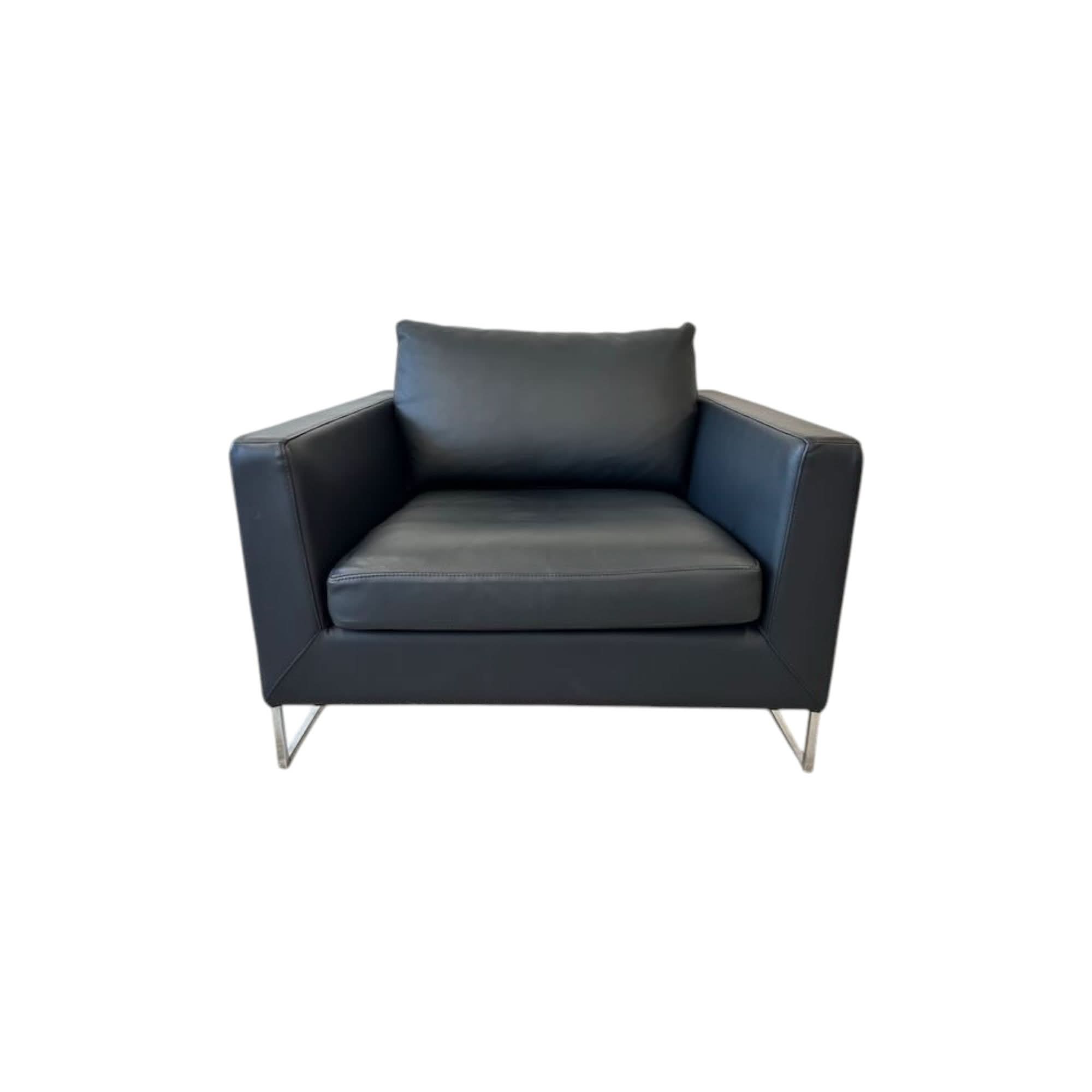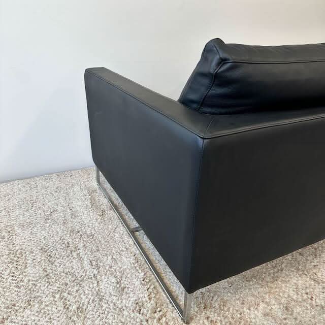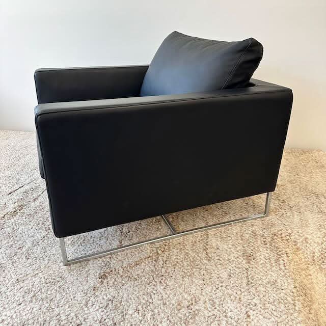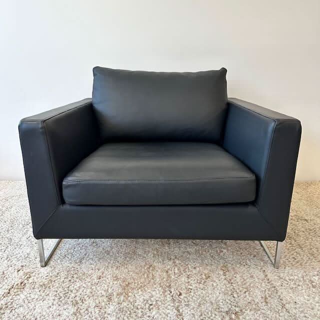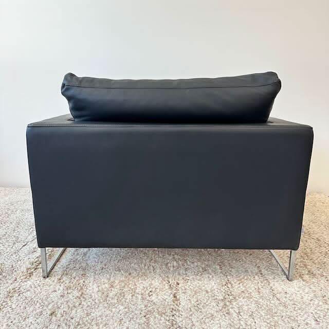 Timeless executive black leather armchair designed and made in Australia by Jardan. Jardan is an Australian family-owned furniture business in operation since 1987. Jardan furniture is designed in Australia and handcrafted with care & precision in Melbourne. This generously sized modern armchair features a sleek polished metal base, commercial grade construction, full premium leather upholstery and a matching leather cover throw cushion. Style this by itself or with the matching 4-seater sofa.