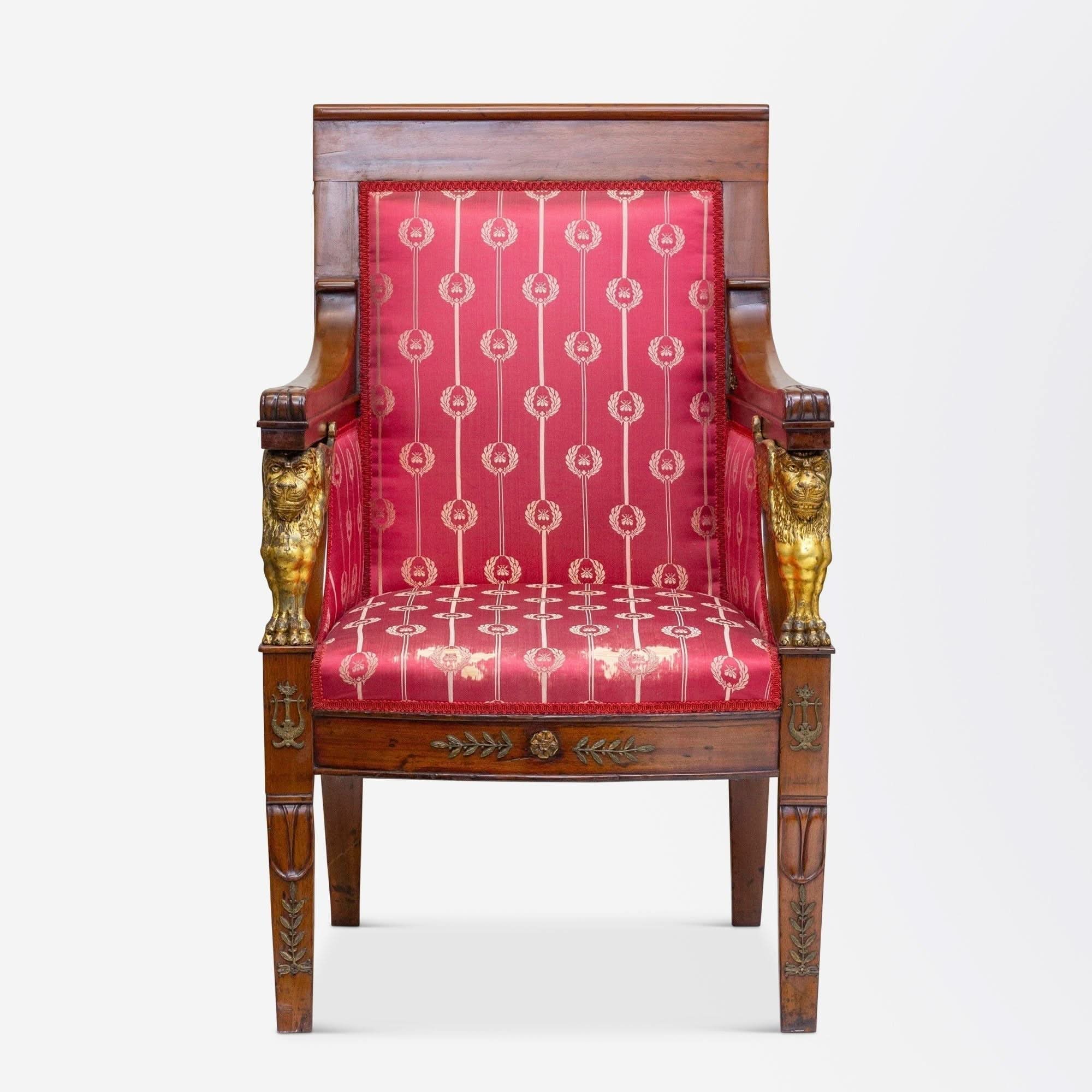 An imposing French Empire armchair with gilt griffins and ormolu mounts, crafted from cedarwood, circa 1800. Upholstered in a sympathetic red silk fabric featuring the Napoleonic bee.