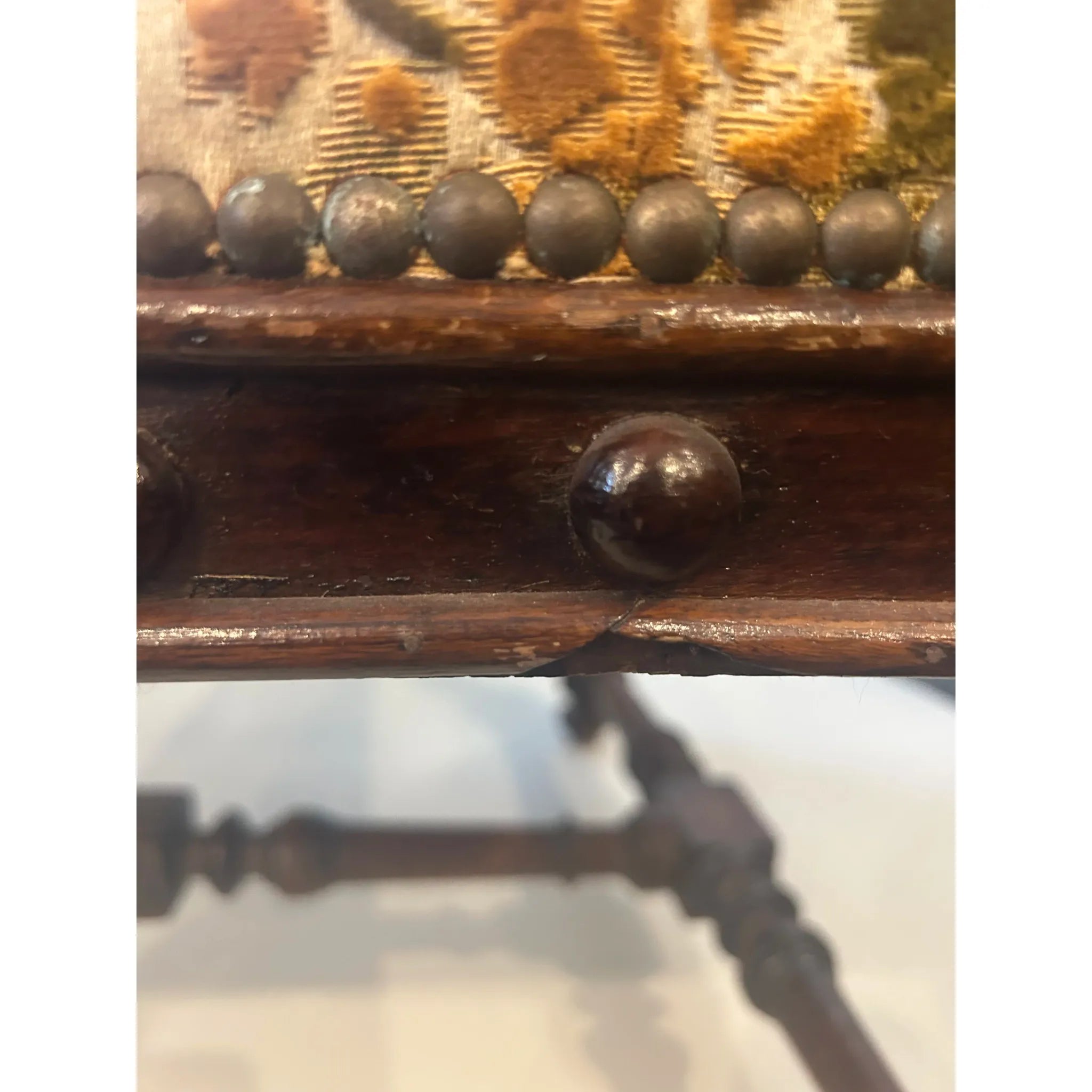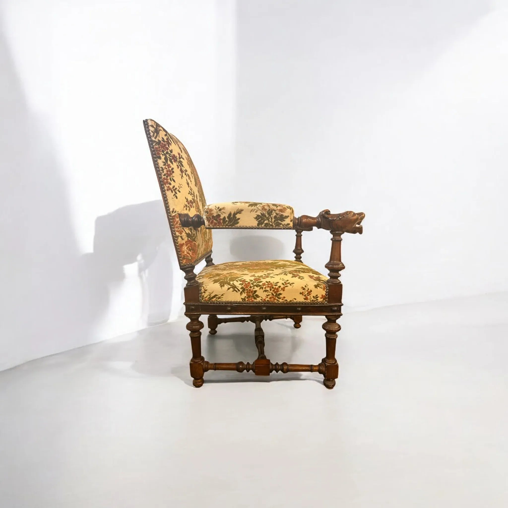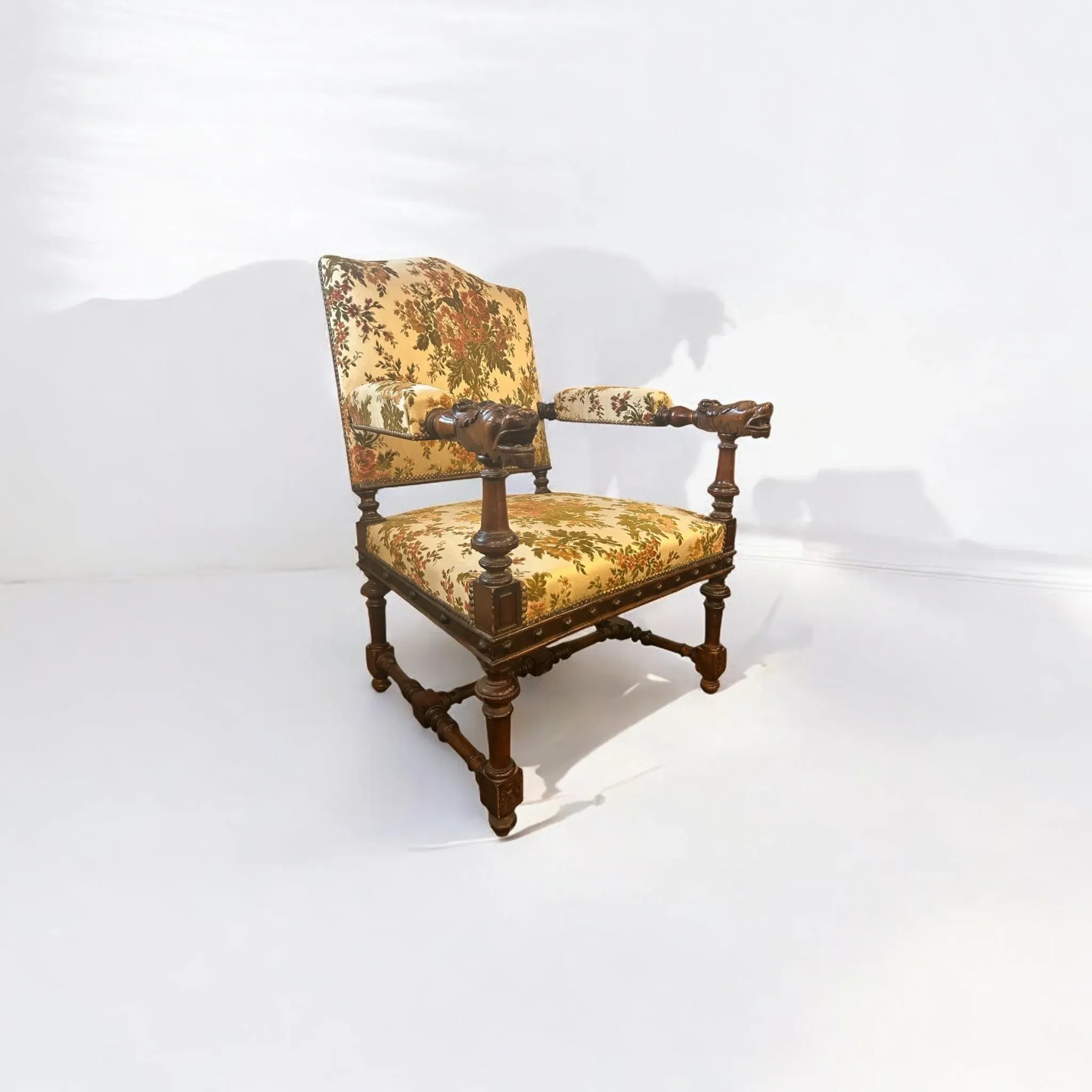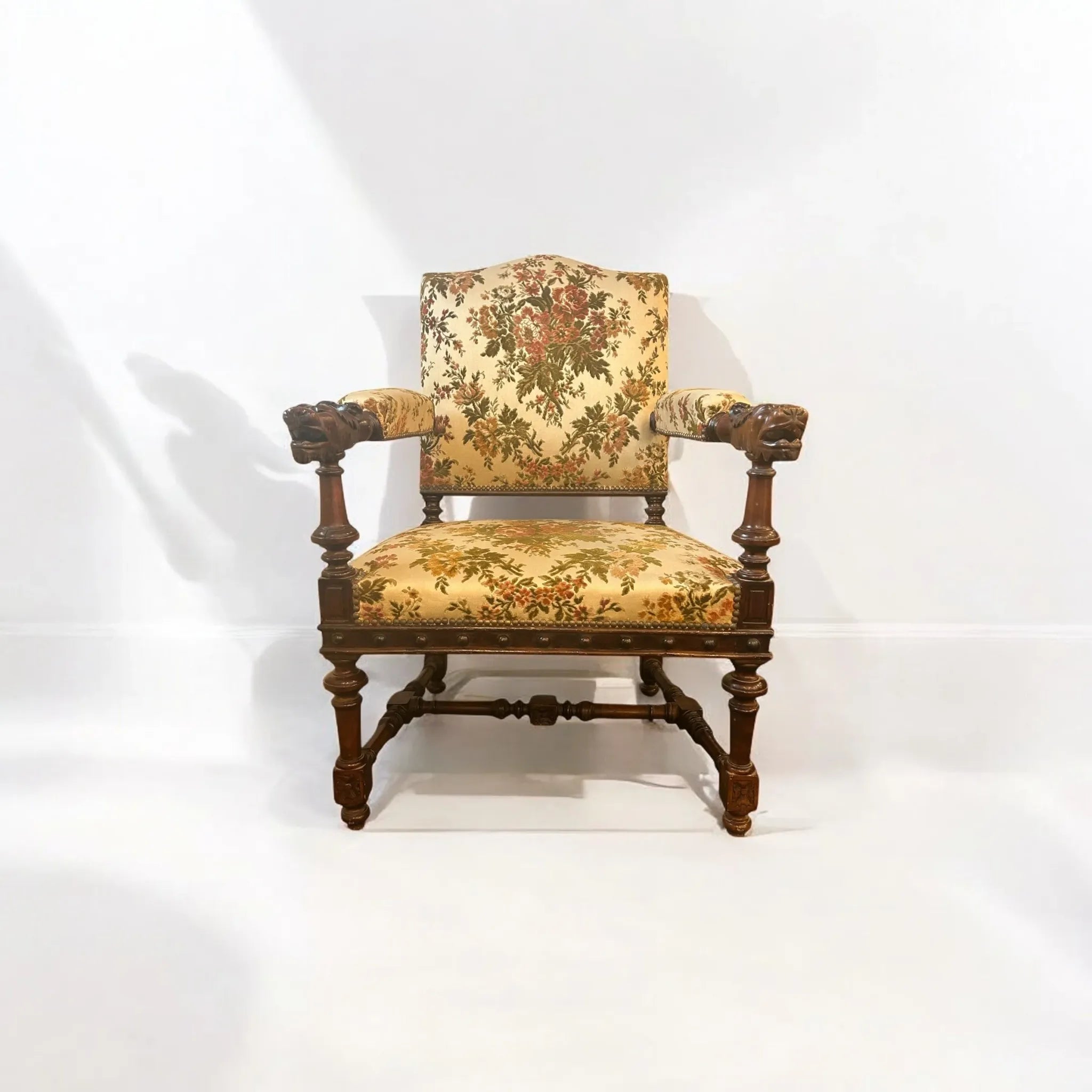 This striking French Renaissance style carved armchair features boldly turned legs and stretchers in solid wood, complemented by hand carved lion heads on each armrest- symbols of strength and grandeur. The richly patinated frame is upholstered in a classic floral tapestry- original and showing signs of wear, adding warmth and vintage charm. The timber frame has been left untreated meaning there are signs of wear and knocks to the frame as well as patina to the studded detail adding character and charm to the armchair. A commanding presence in any room, this piece is as sculptural as it is functional, perfect for heritage-inspired interiors or as a statement accent in more eclectic settings.