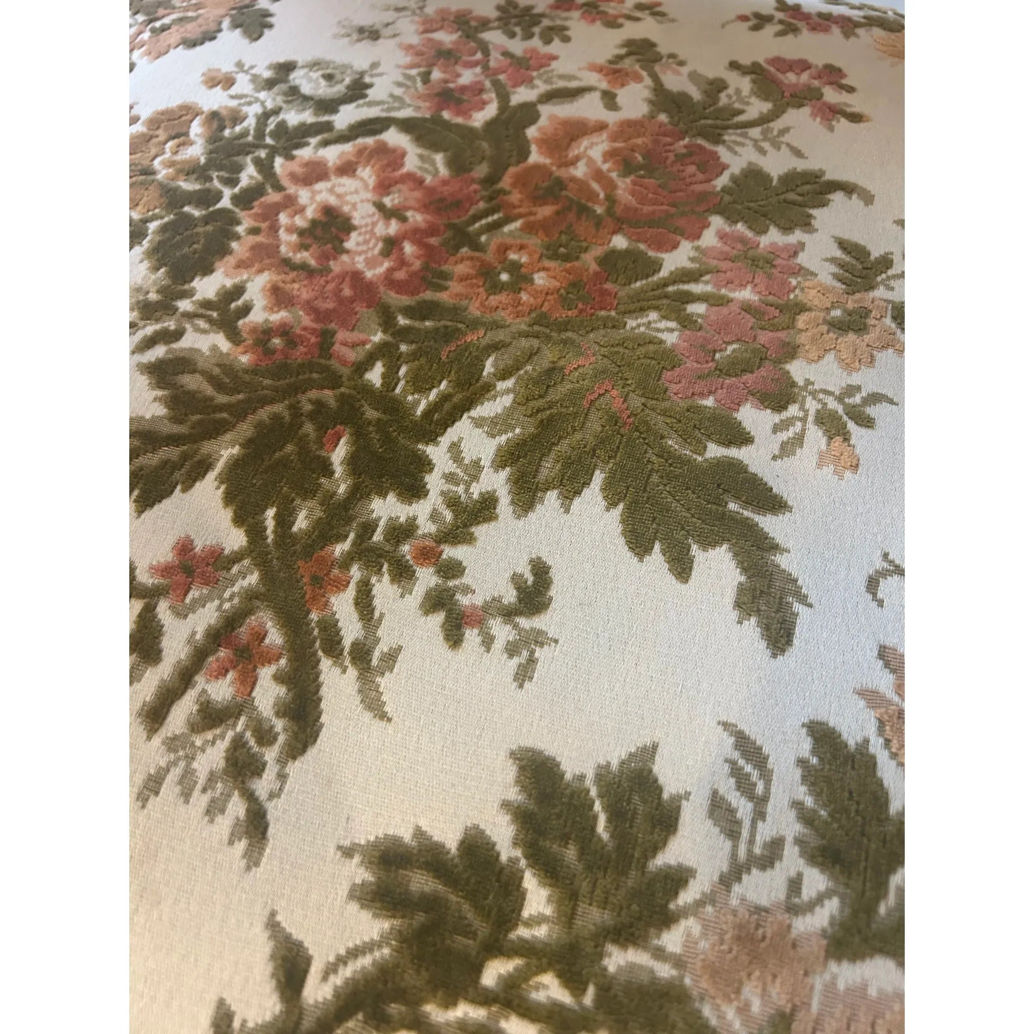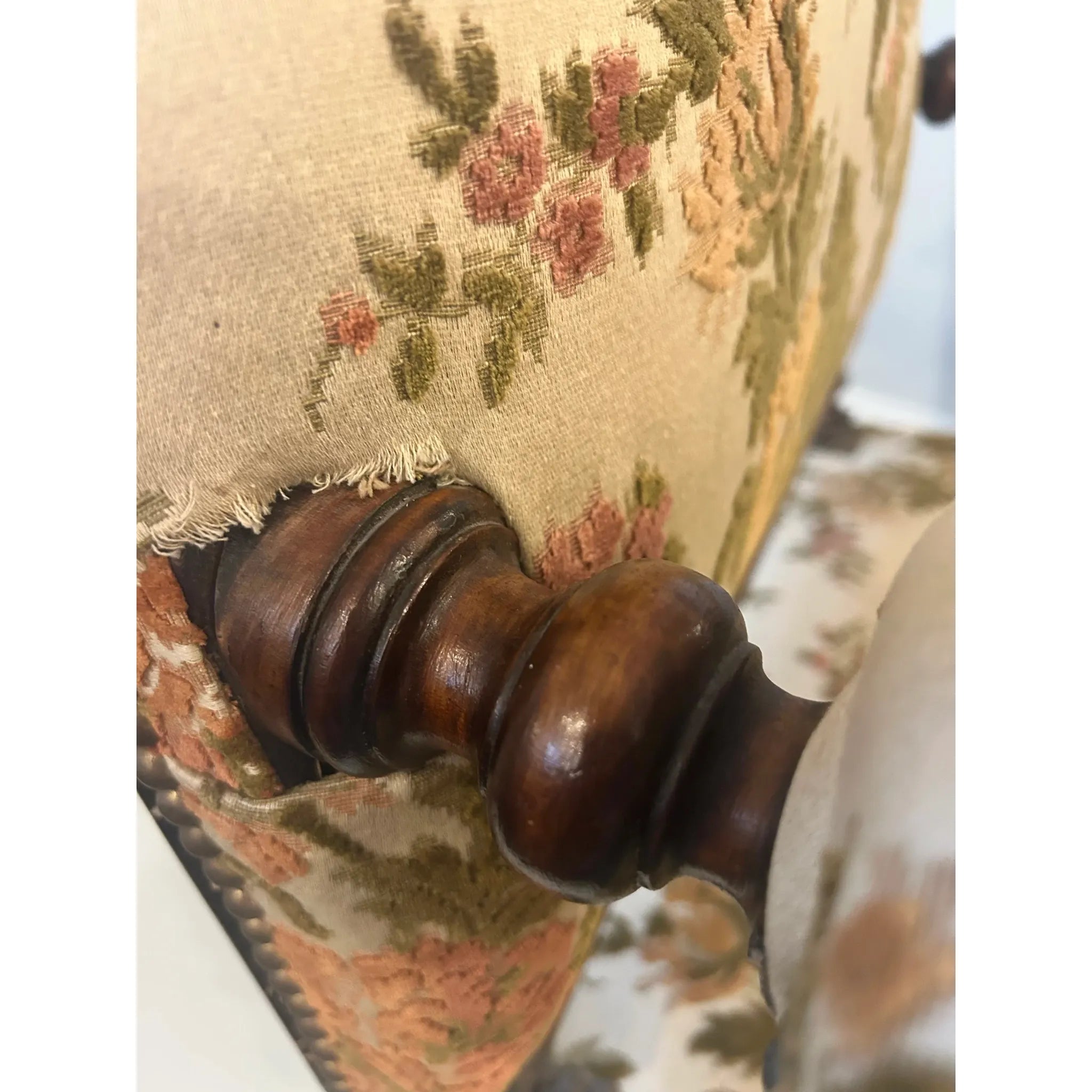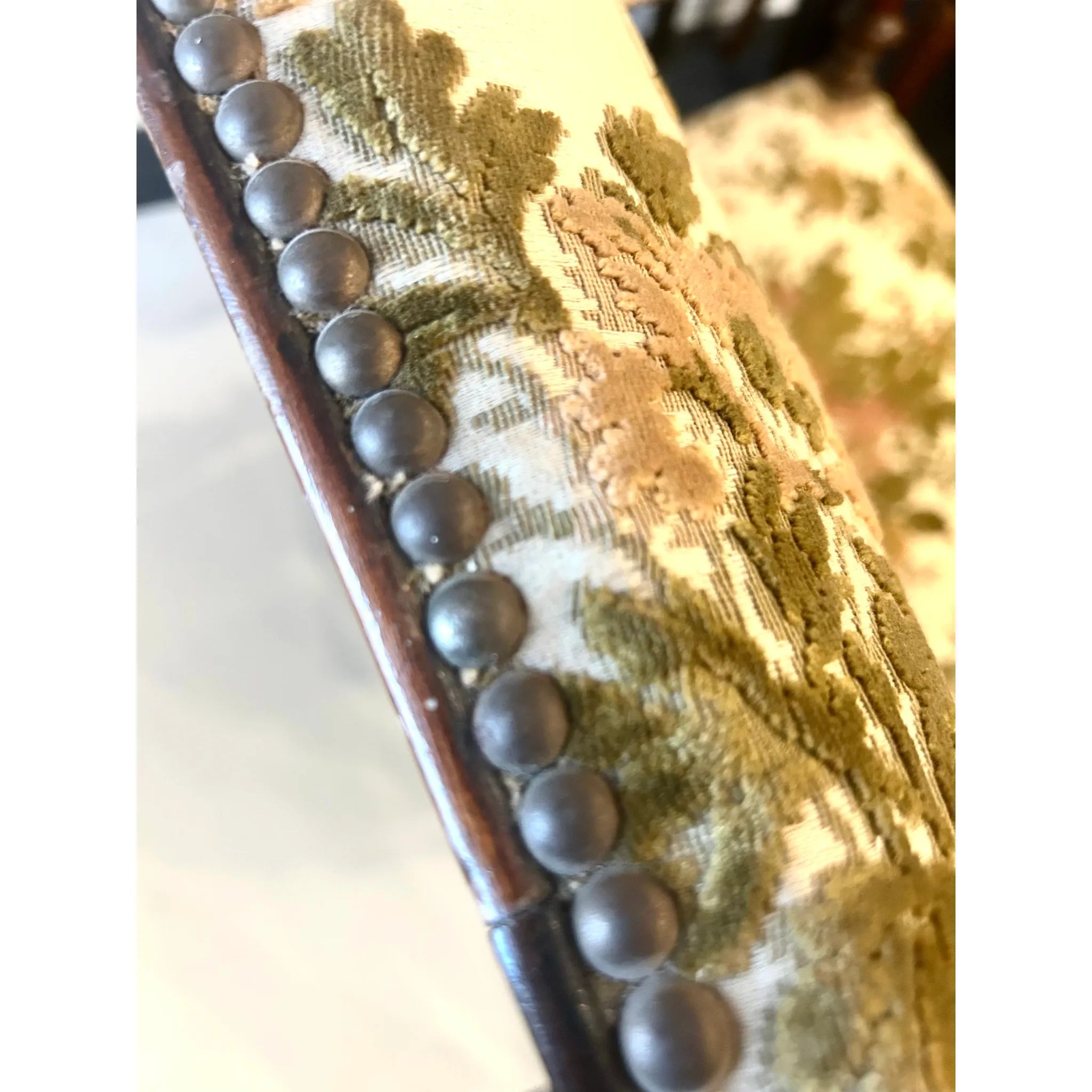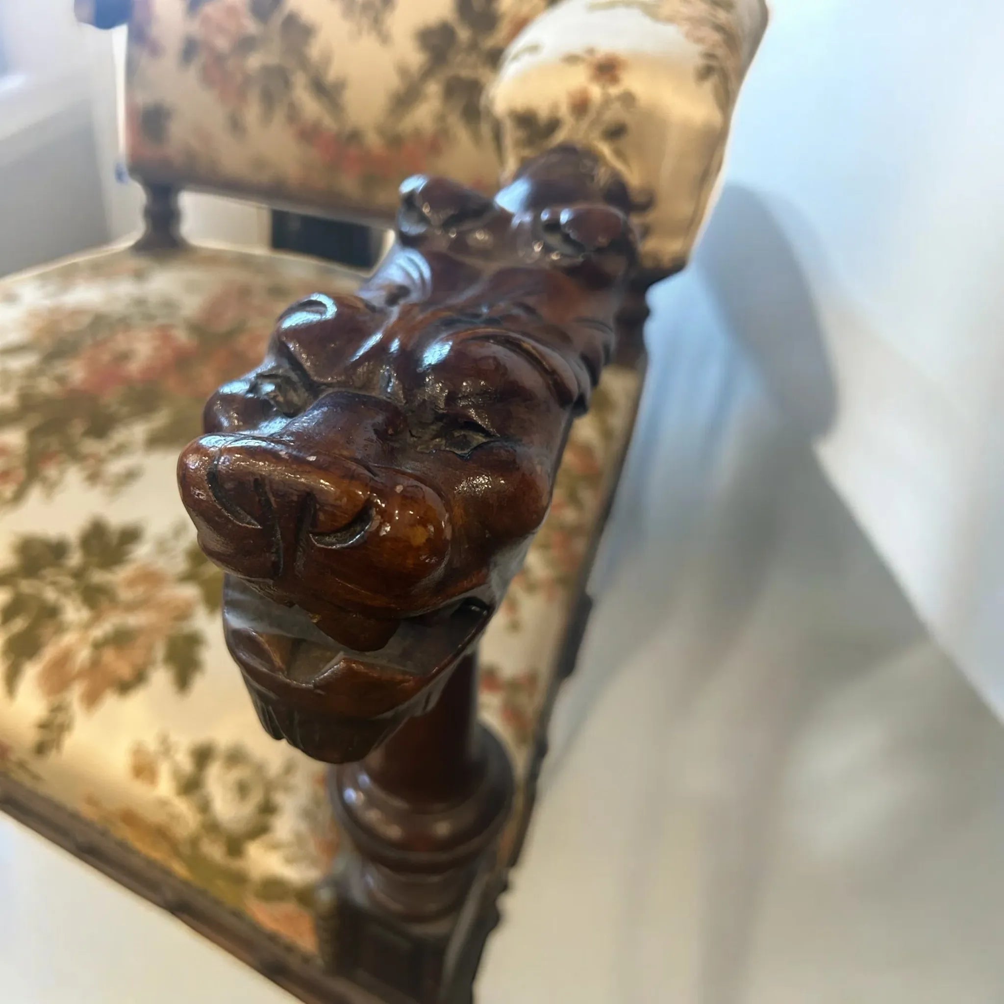 This striking French Renaissance style carved armchair features boldly turned legs and stretchers in solid wood, complemented by hand carved lion heads on each armrest- symbols of strength and grandeur. The richly patinated frame is upholstered in a classic floral tapestry- original and showing signs of wear, adding warmth and vintage charm. The timber frame has been left untreated meaning there are signs of wear and knocks to the frame as well as patina to the studded detail adding character and charm to the armchair. A commanding presence in any room, this piece is as sculptural as it is functional, perfect for heritage-inspired interiors or as a statement accent in more eclectic settings.