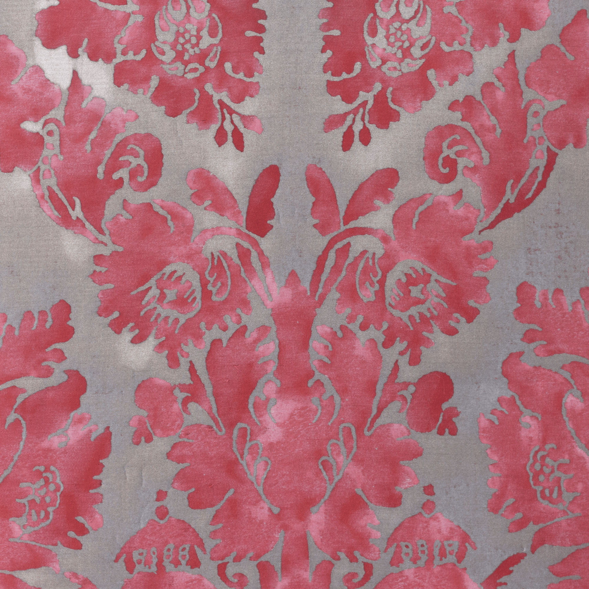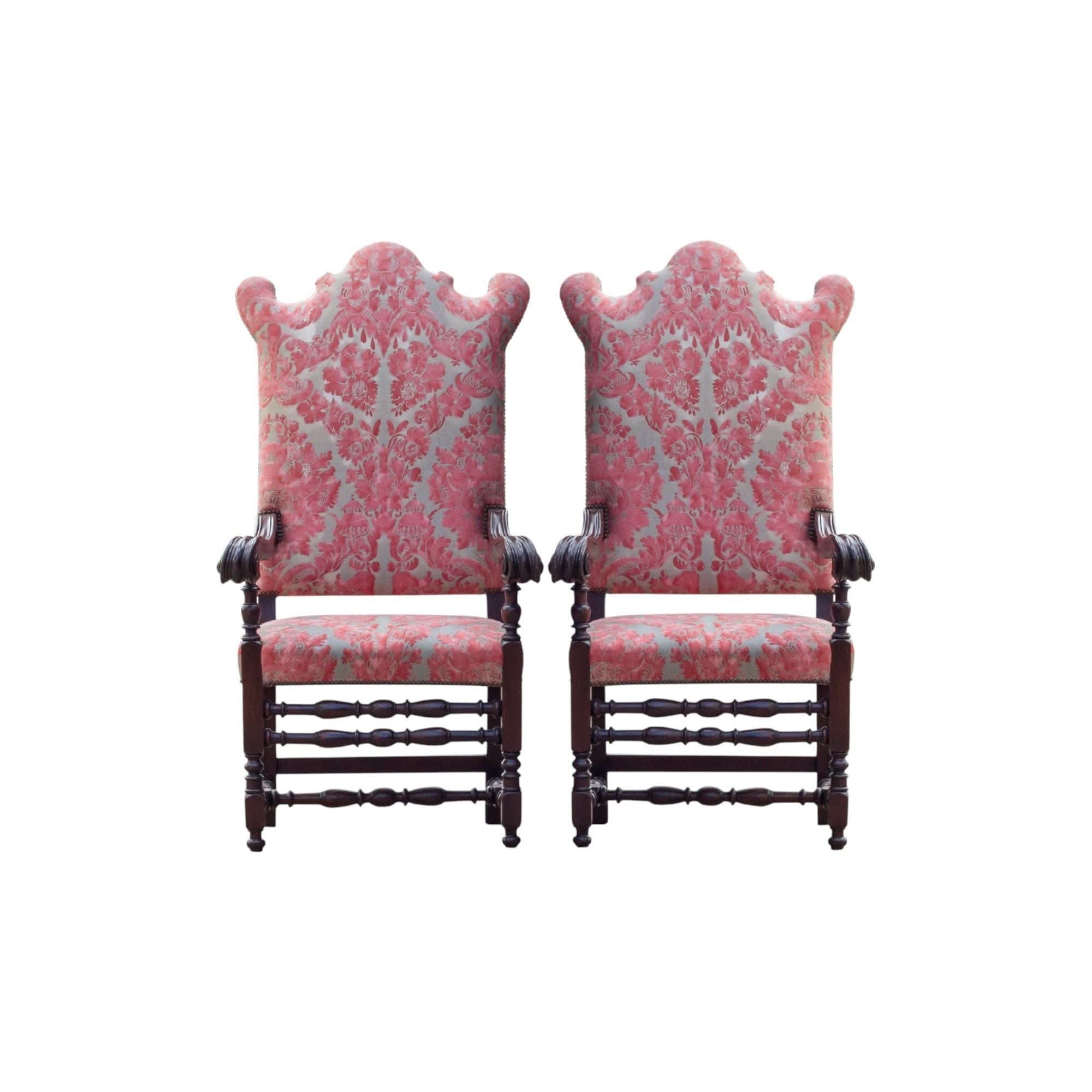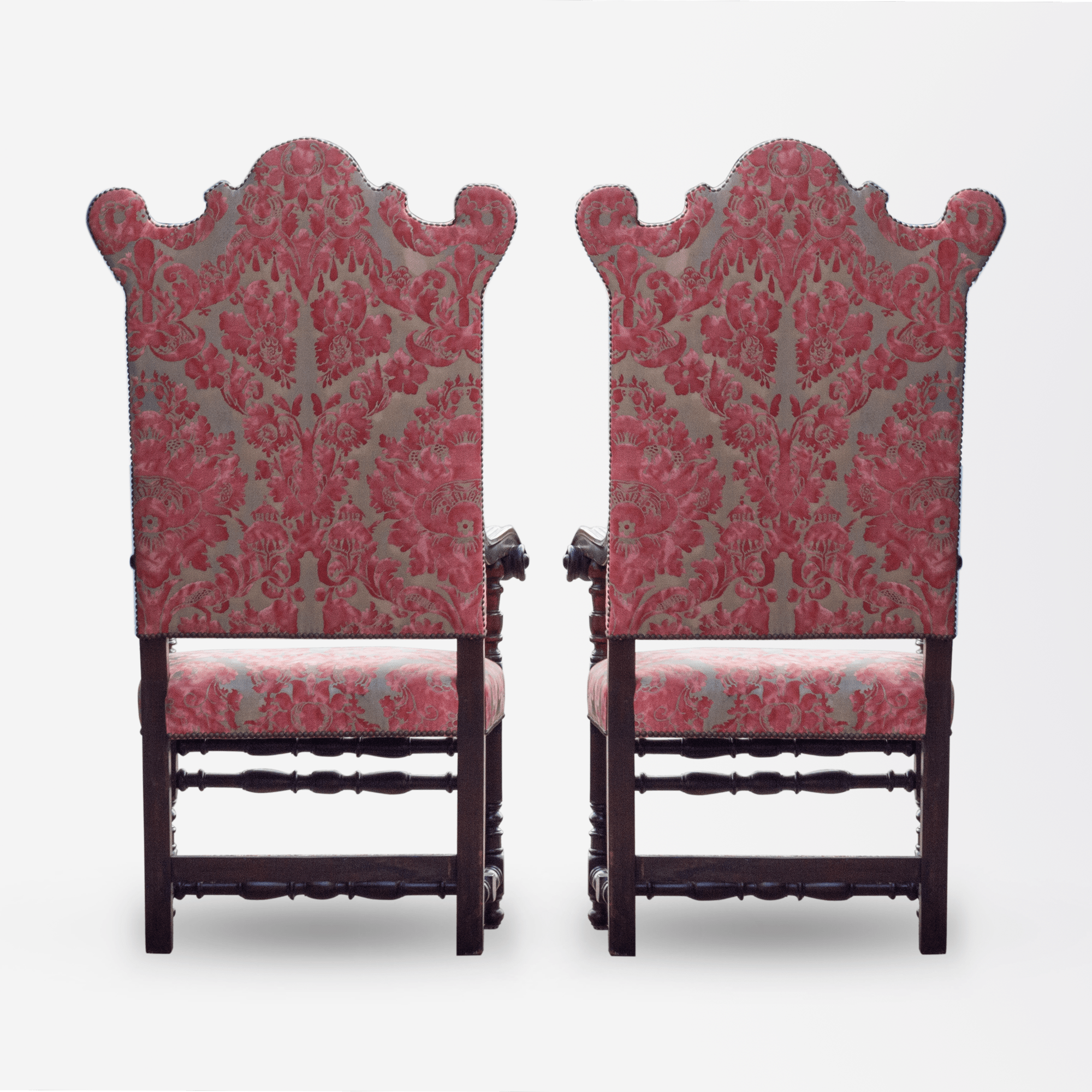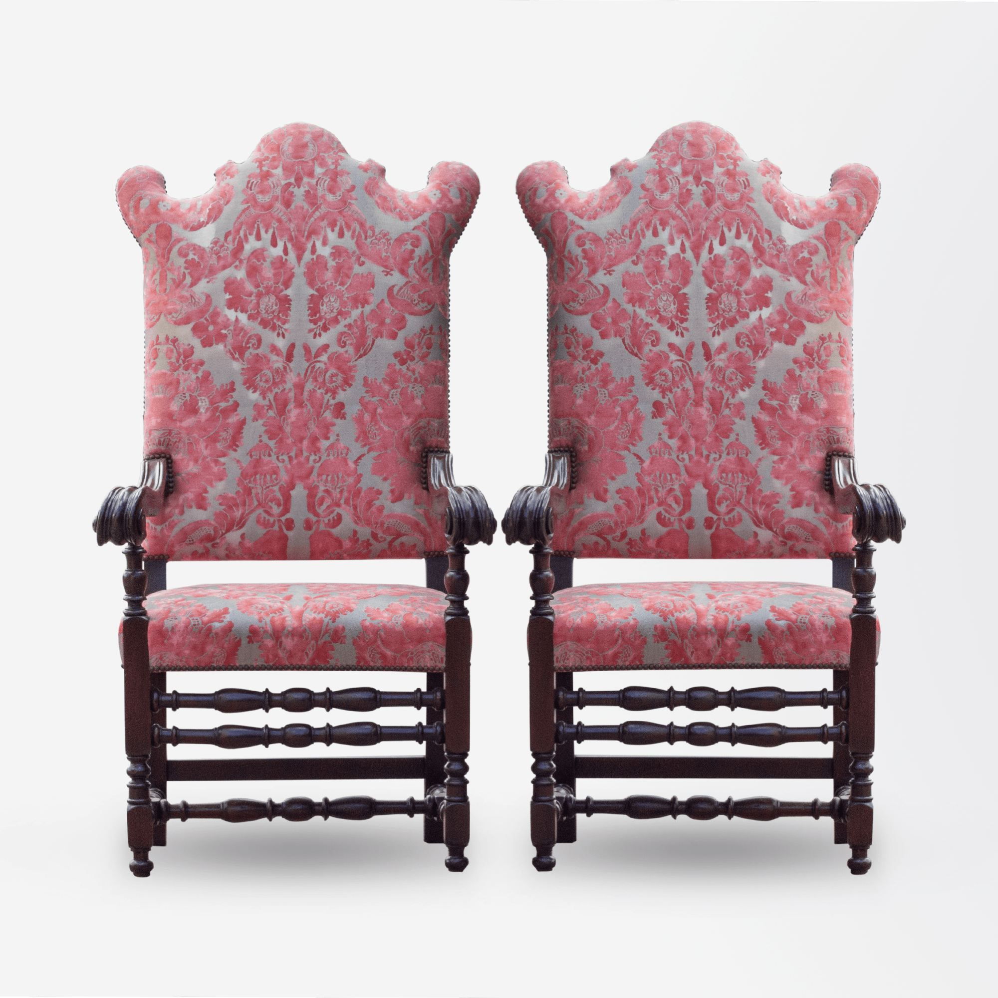 A pair of oversized walnut armchairs covered in a rich 'Fortuny' fabric. The pair are Dutch in origin and were made in the late 19th century, however have been reupholstered more recently. Their luxurious new covering is in the 'Vivaldi' pattern by famed Italian maker, Fortuny. The house of Fortuny dates back to the early 20th century when Mariano Fortuny started his iconic clothing and textile label. Handmade to date in Venice the textile company is regarded as one of the finest makers in the world, with their fabrics commanding an exceptionally high price per meter. This pair of chairs are monumental in size at over 1.5 meters in height.
