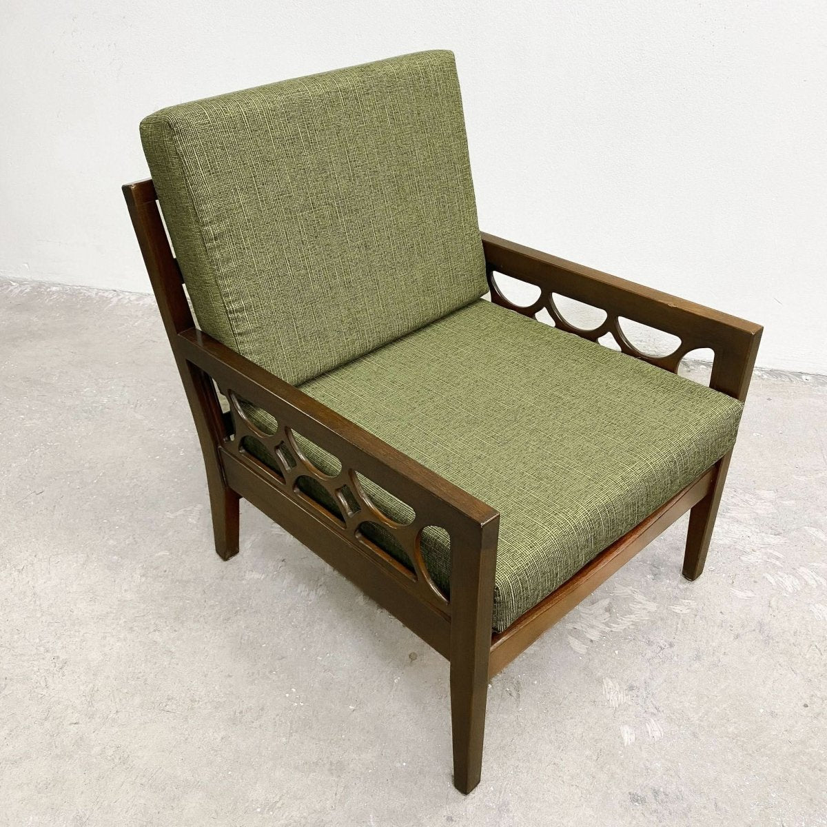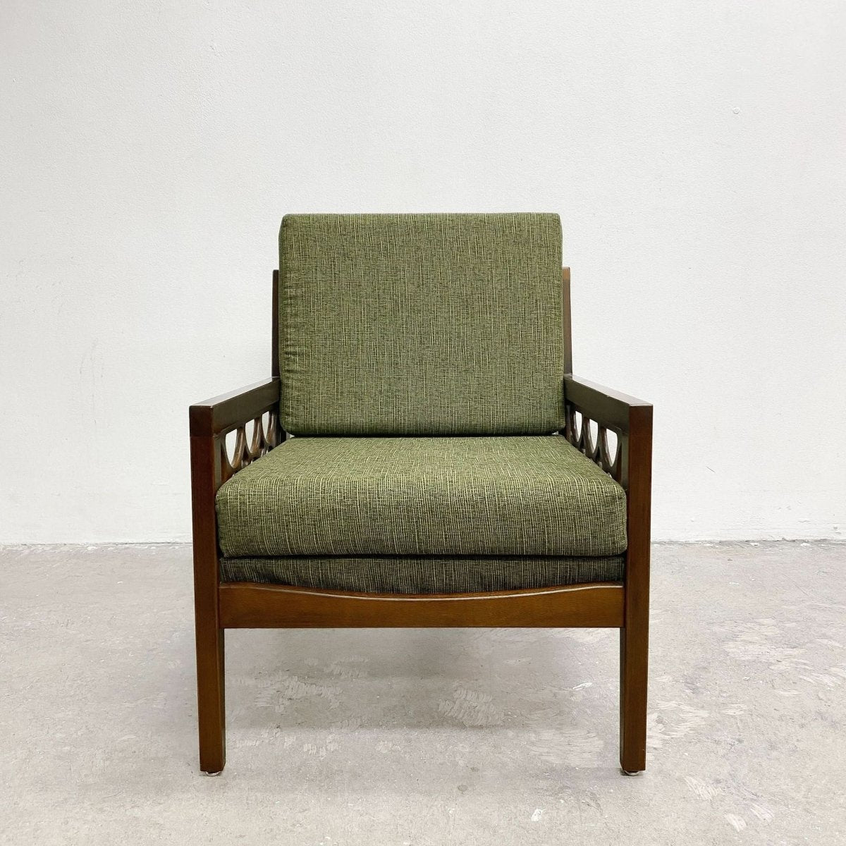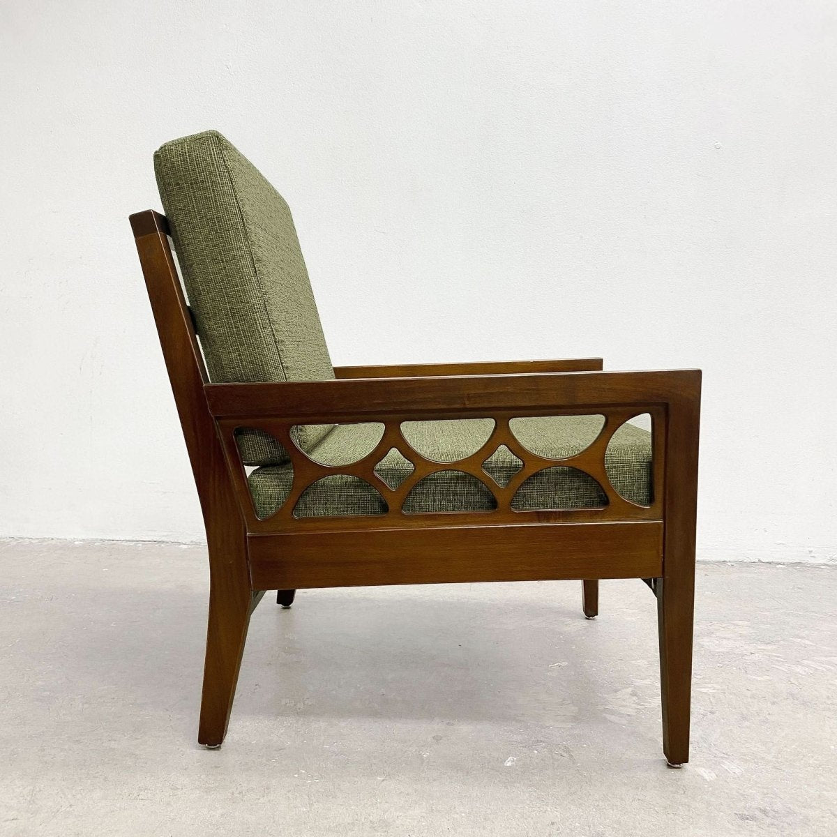 Classic mid century armchair by Melbourne based Avalon Furniture, circa 1960s. Manufactured from solid wood and featuring the geometric cut out side panels distinctive to Avalon Furniture. New cushion covers in Warwick fabric.