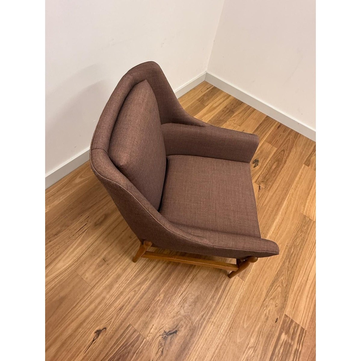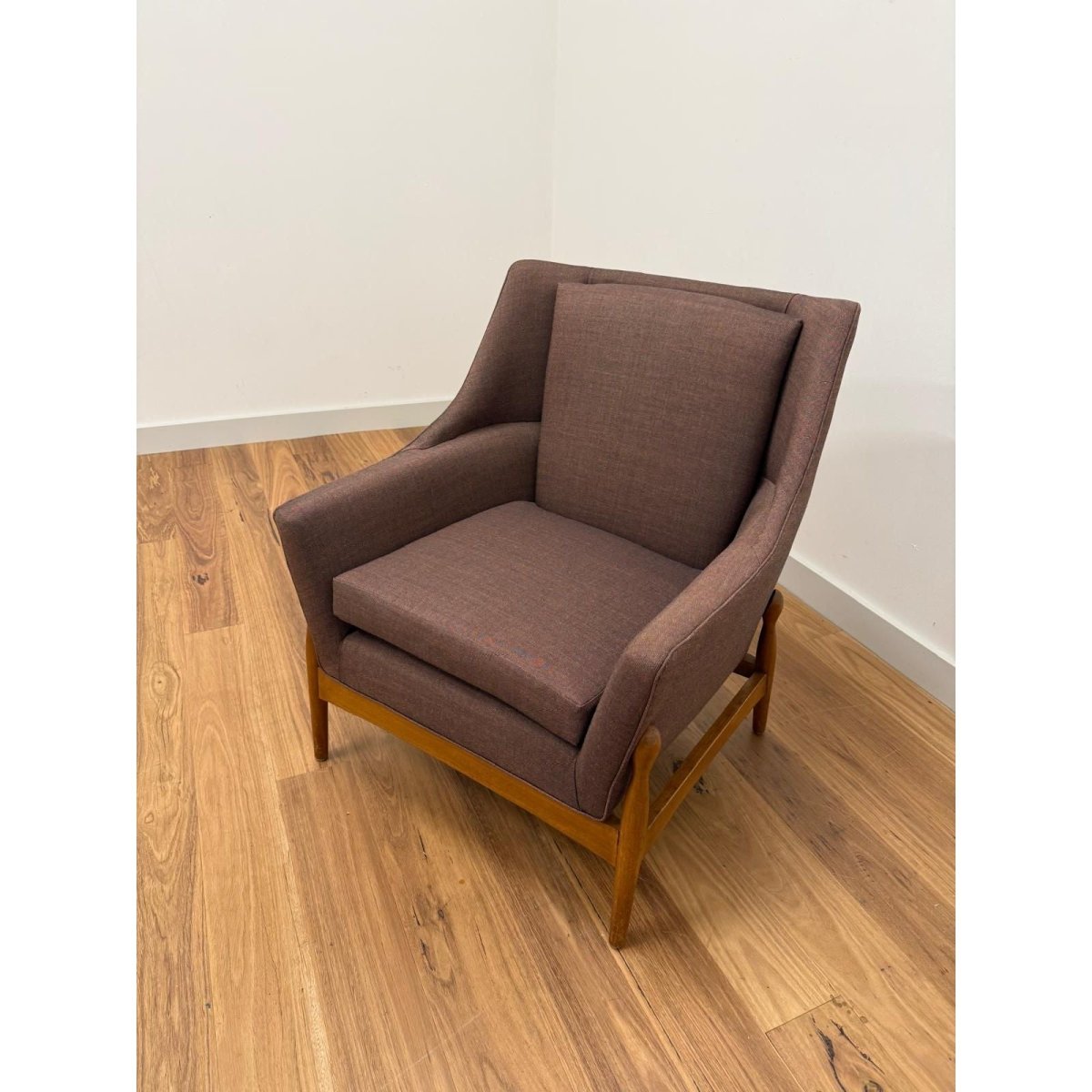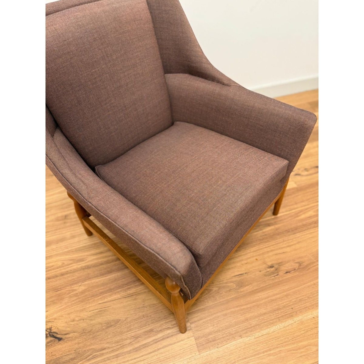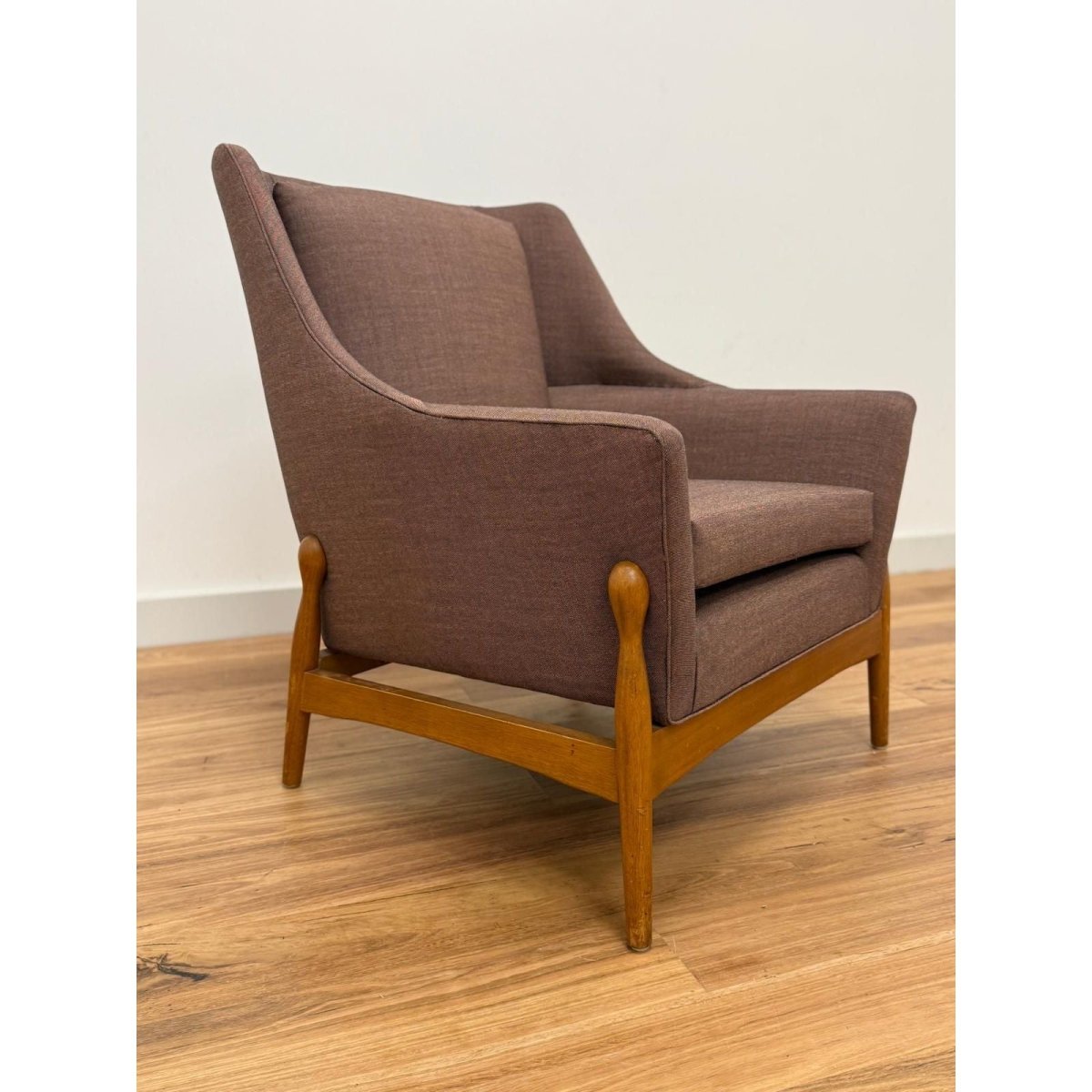 Recently reupholstered in Kvadrat Atlas fabric, the chair offers renewed comfort and durability while retaining its original mid-century character. The angled arms and supportive back create an inviting, relaxed seating position suited to both living rooms and reading corners.