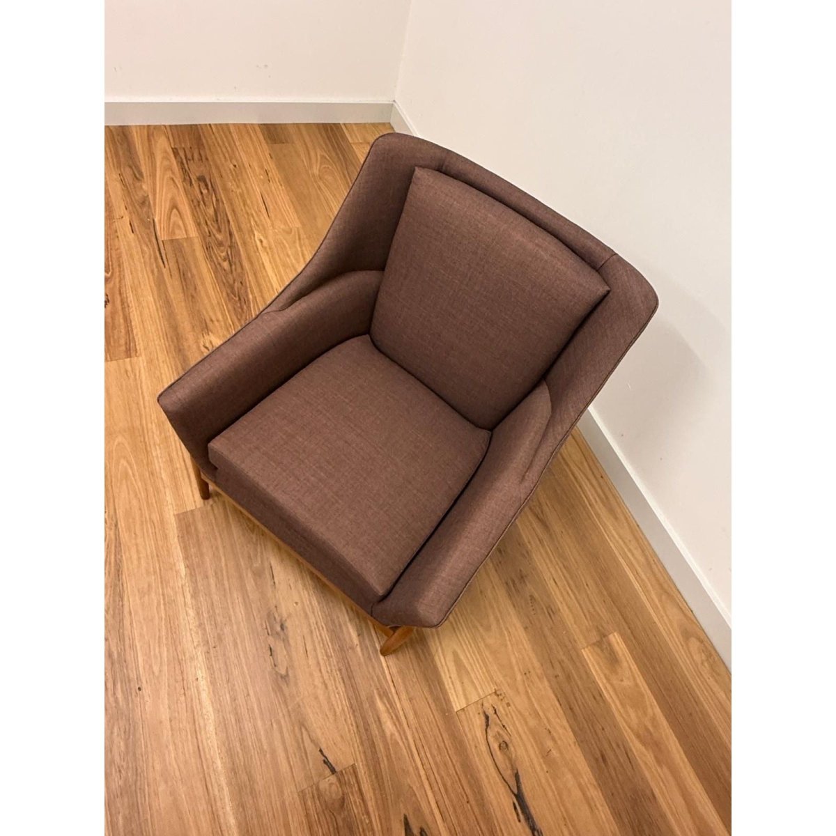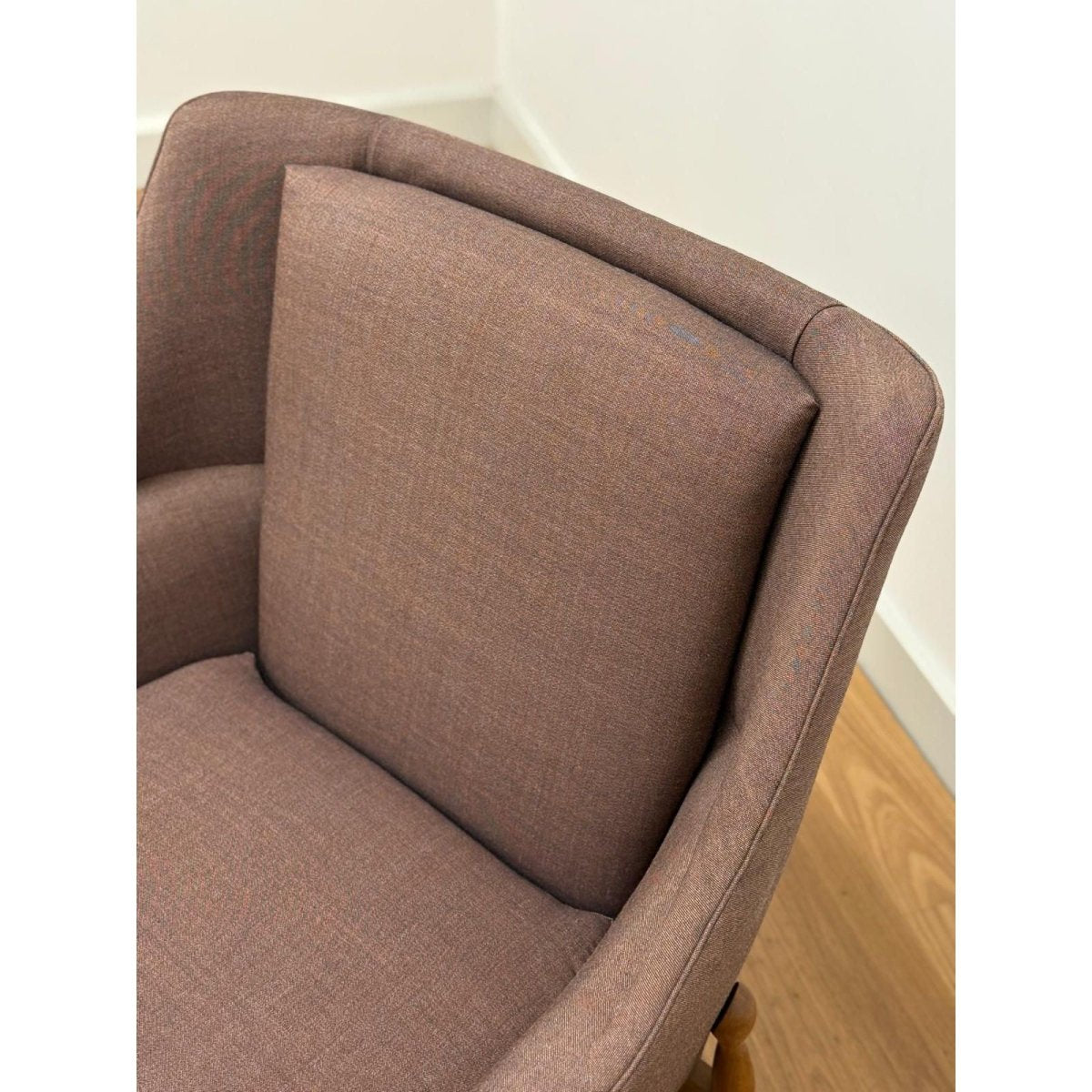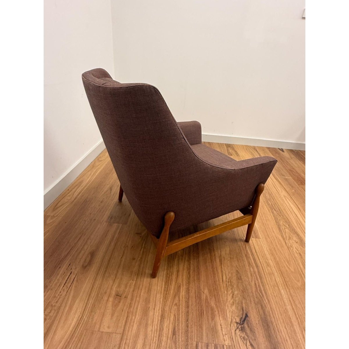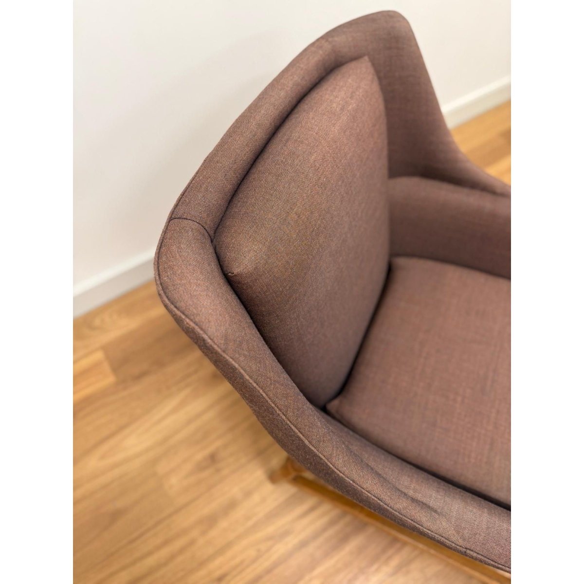Recently reupholstered in Kvadrat Atlas fabric, the chair offers renewed comfort and durability while retaining its original mid-century character. The angled arms and supportive back create an inviting, relaxed seating position suited to both living rooms and reading corners.