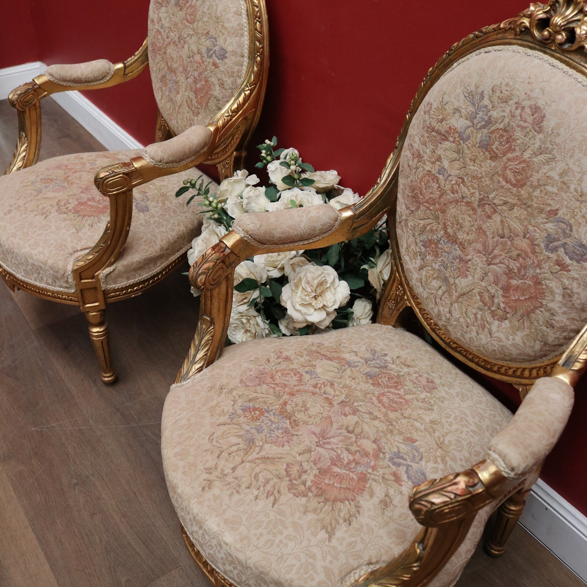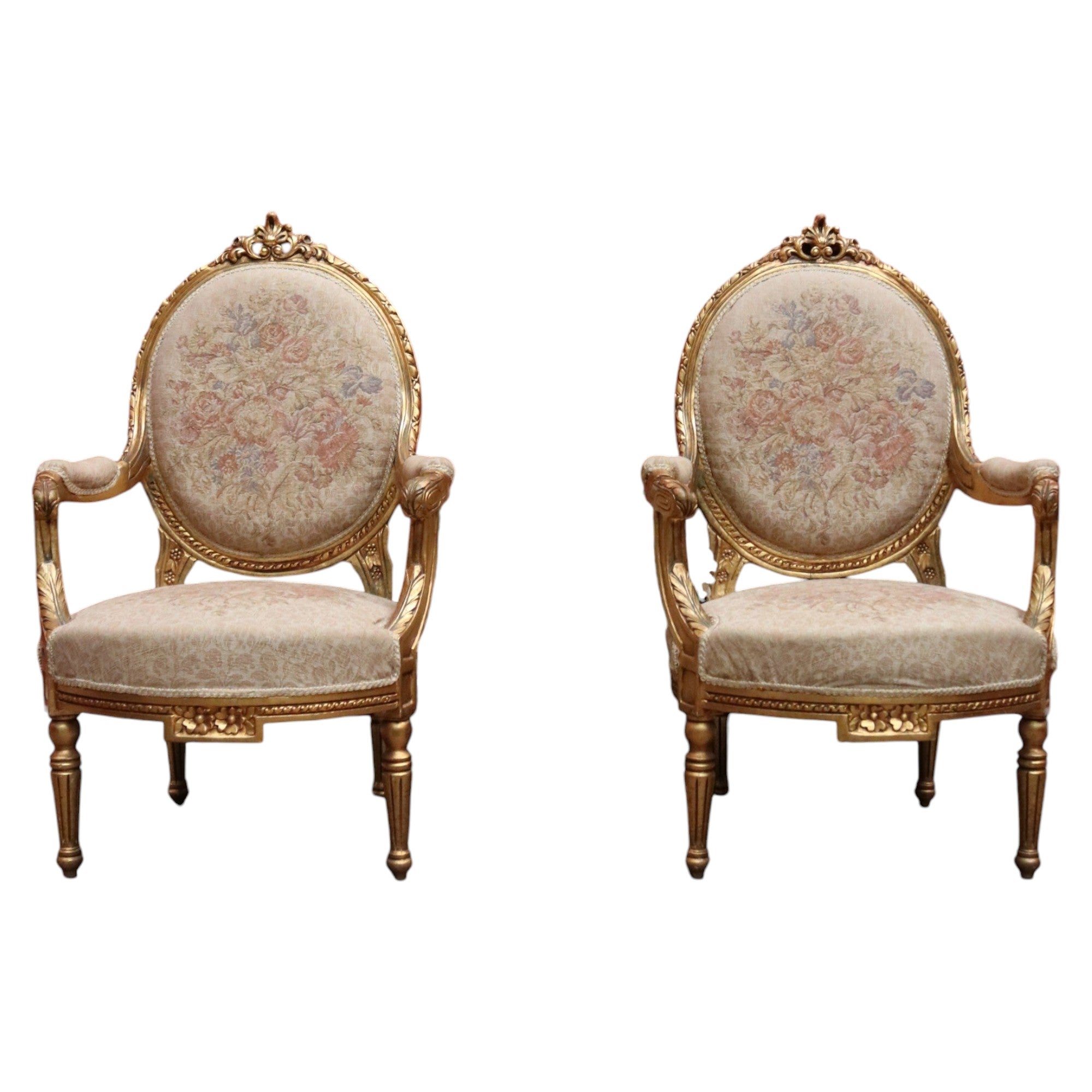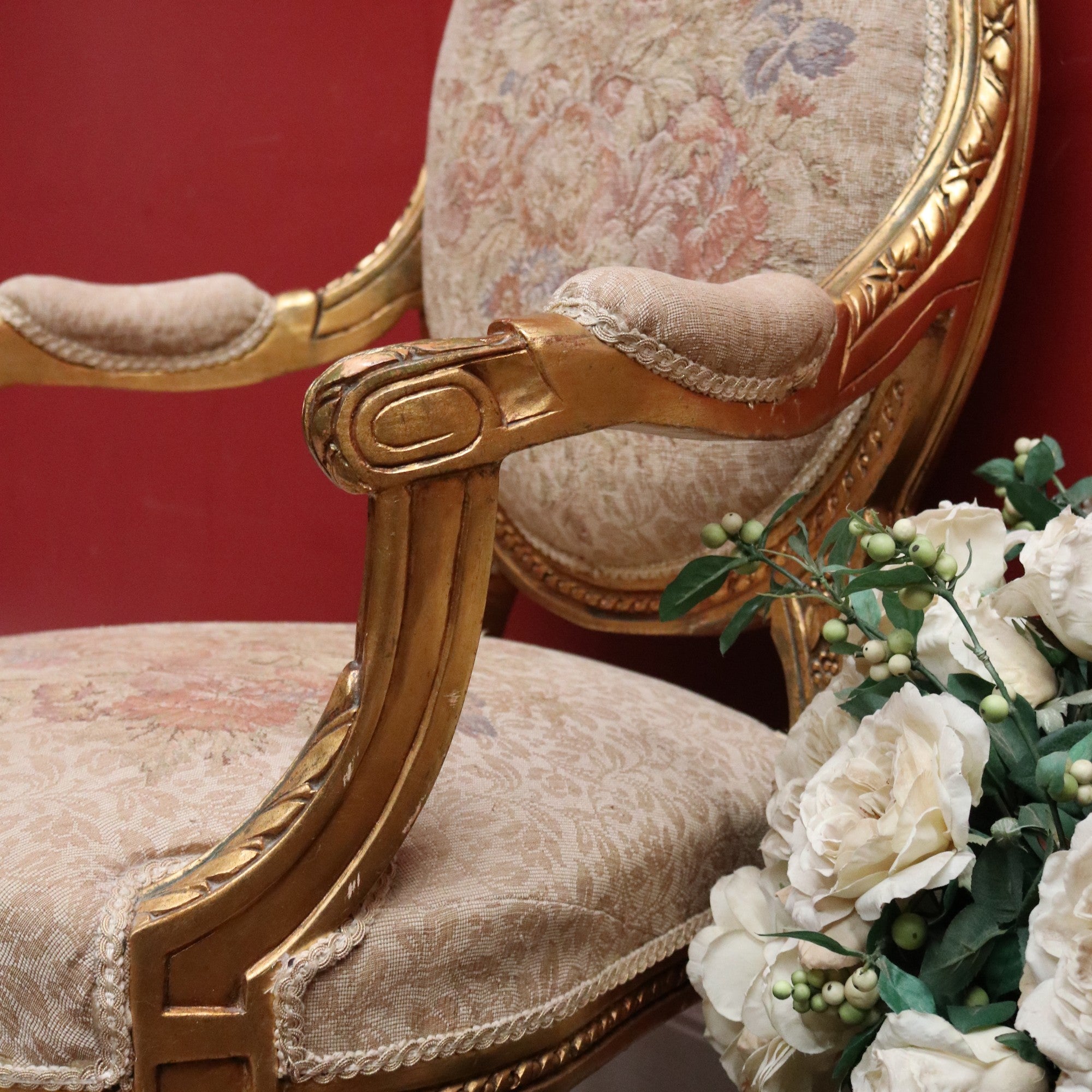 Description:A refined pair of French armchairs, each featuring a classic medallion-shaped back and elegant gilt wood frames. The design is enhanced by tapered reeded legs, bringing balance and sophistication to the form.