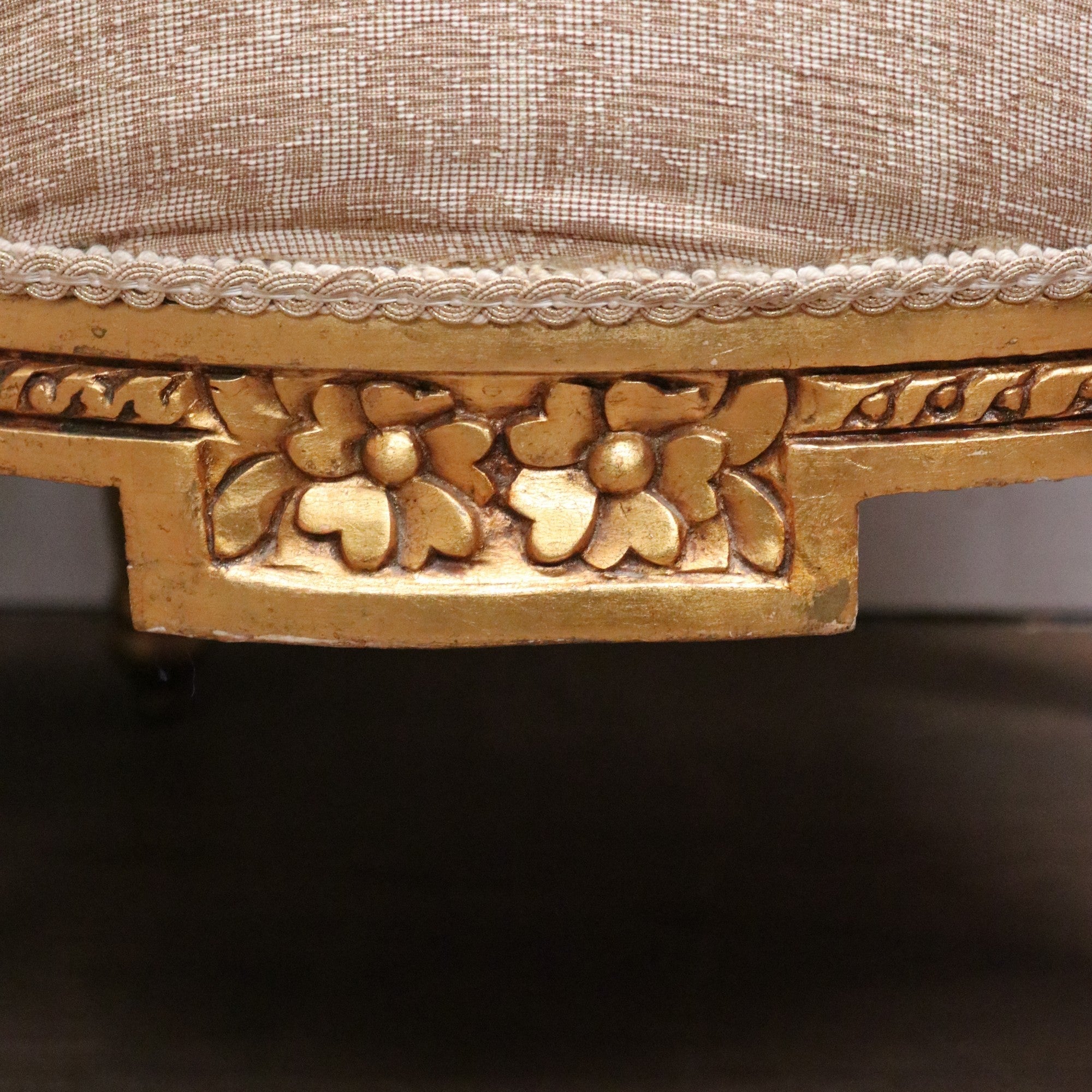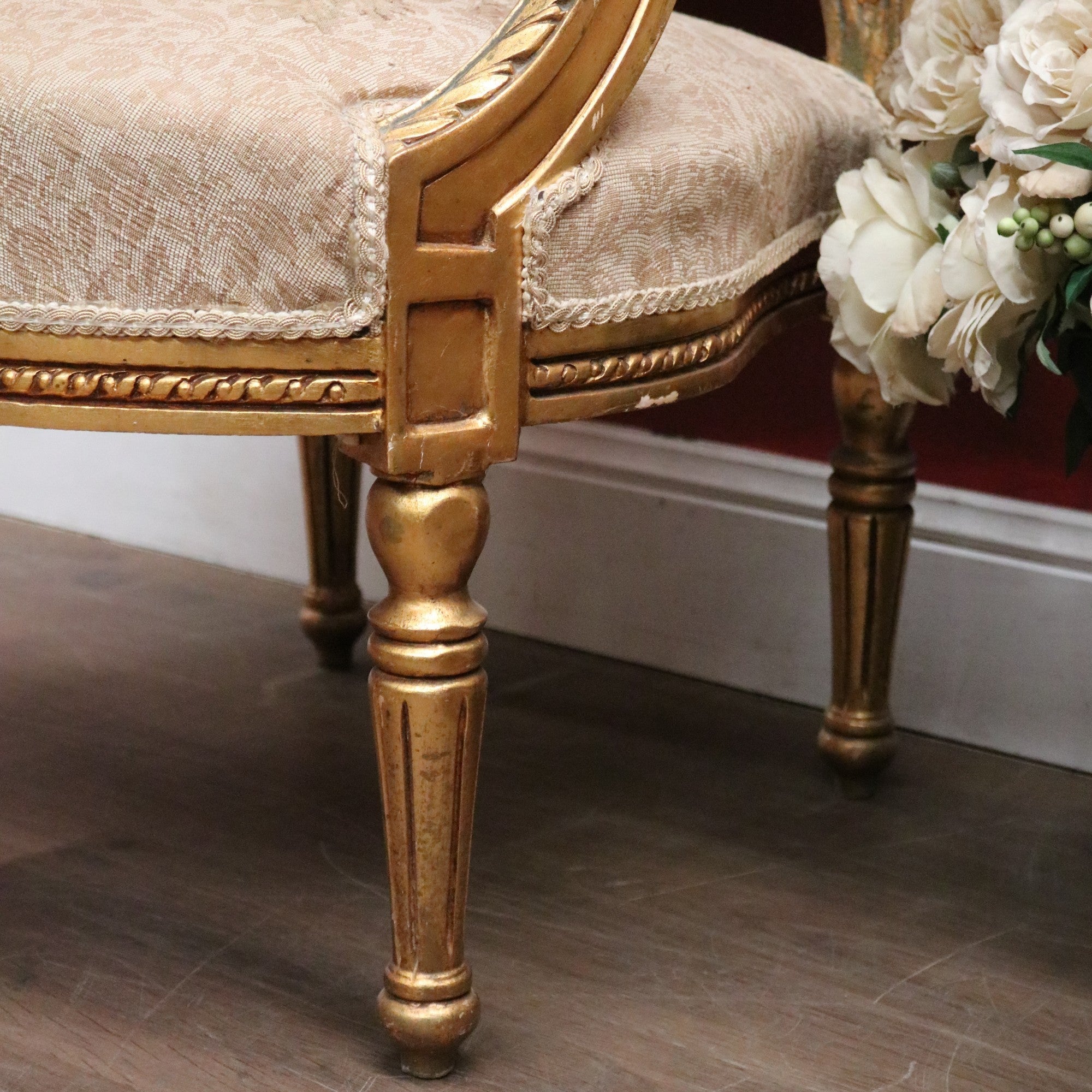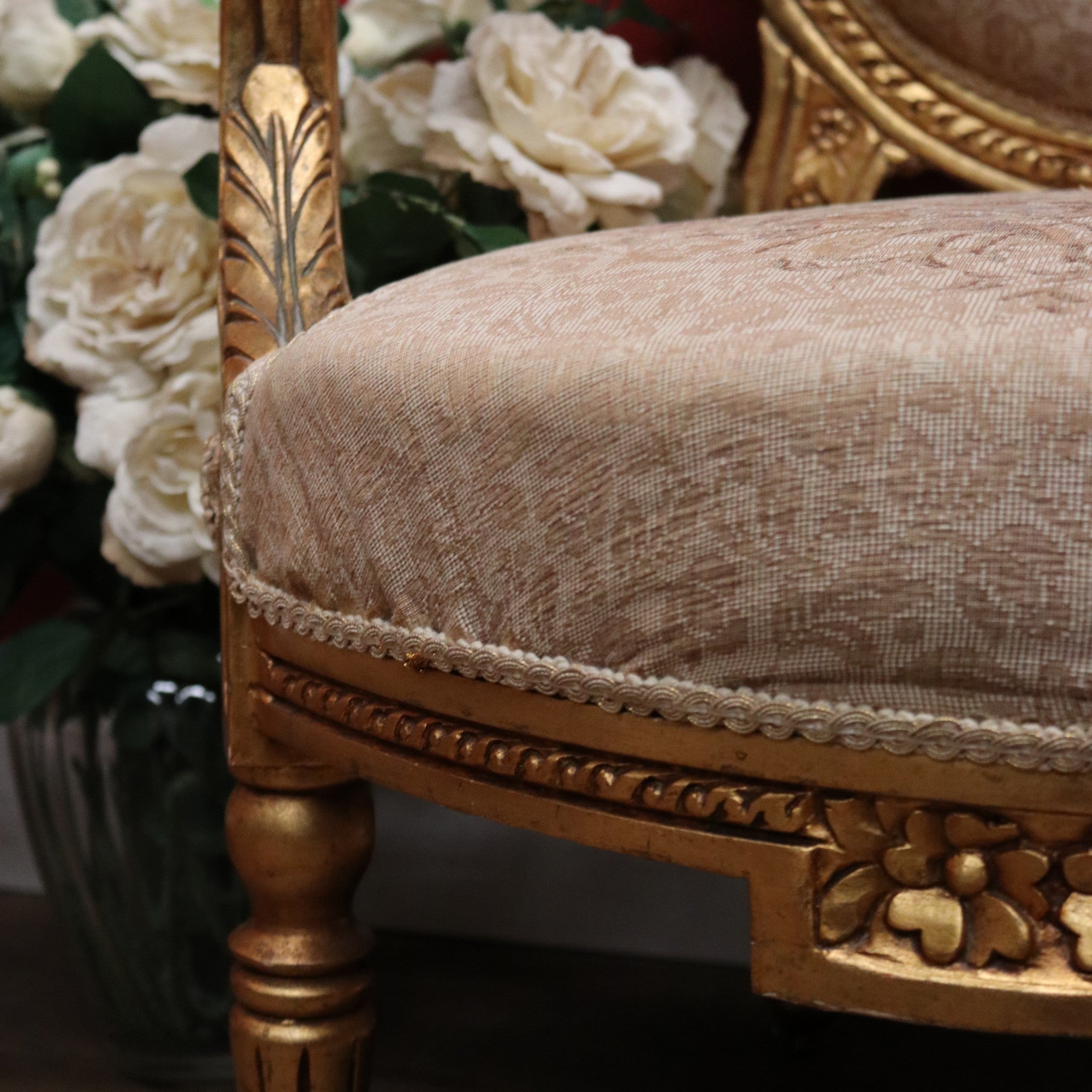 Description:A refined pair of French armchairs, each featuring a classic medallion-shaped back and elegant gilt wood frames. The design is enhanced by tapered reeded legs, bringing balance and sophistication to the form.
