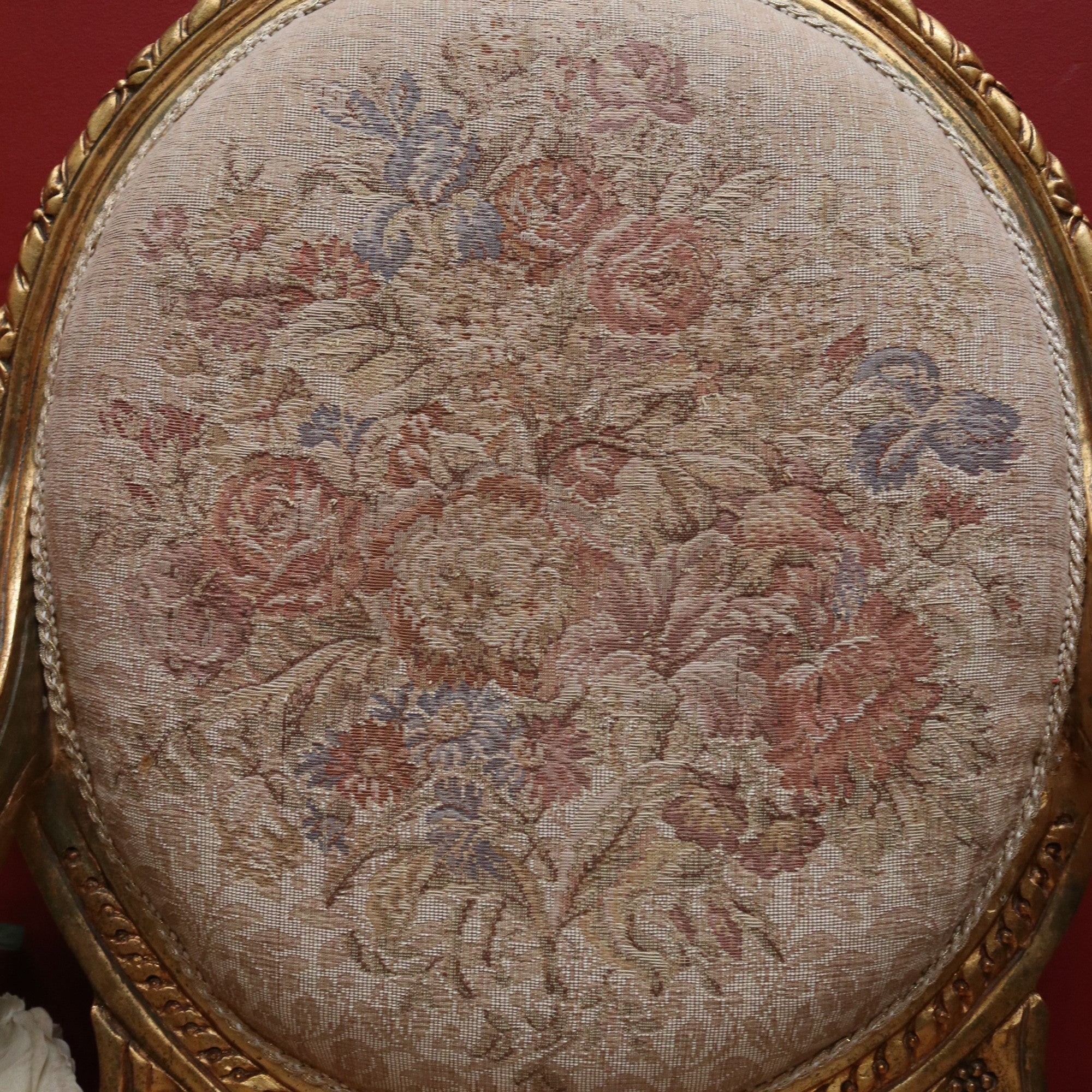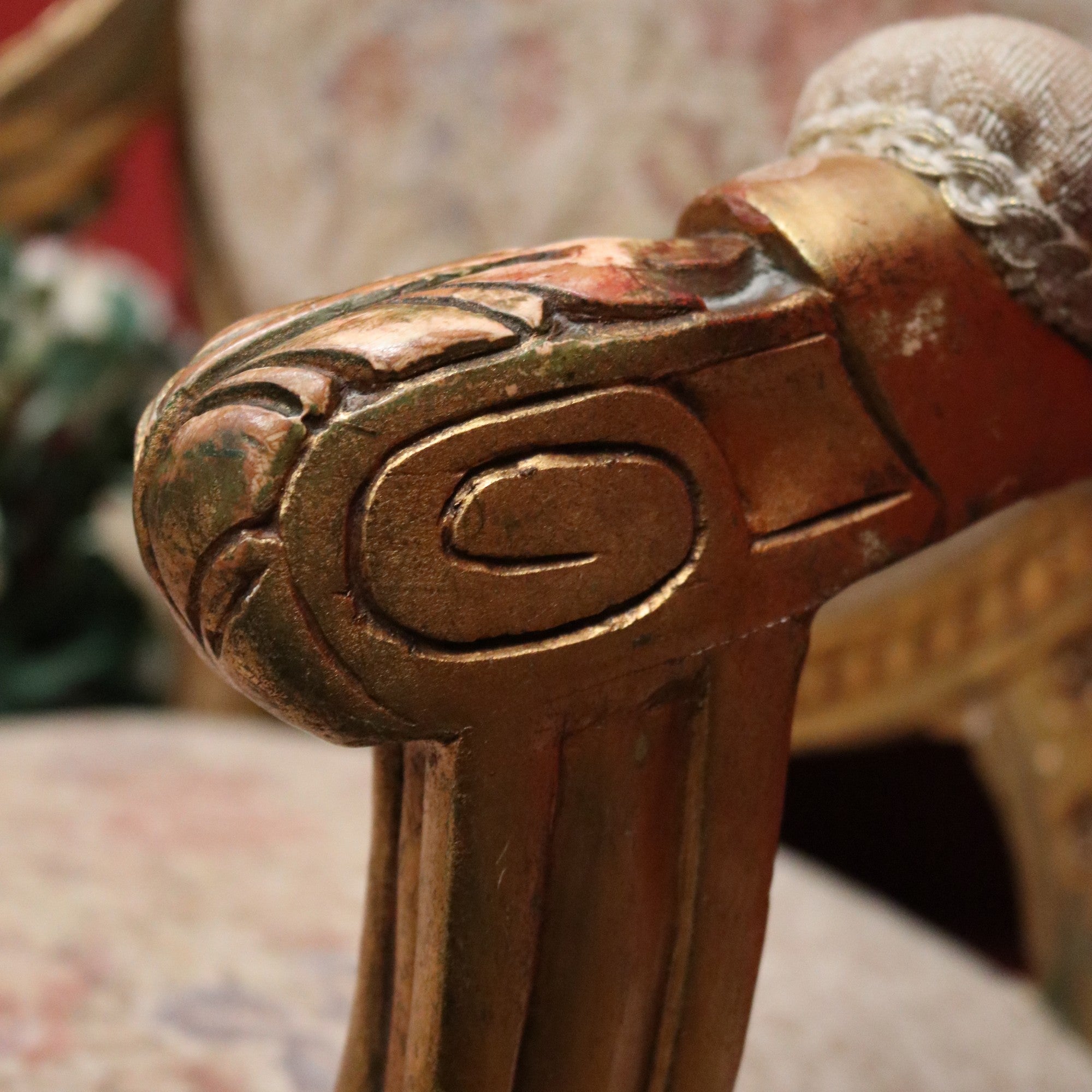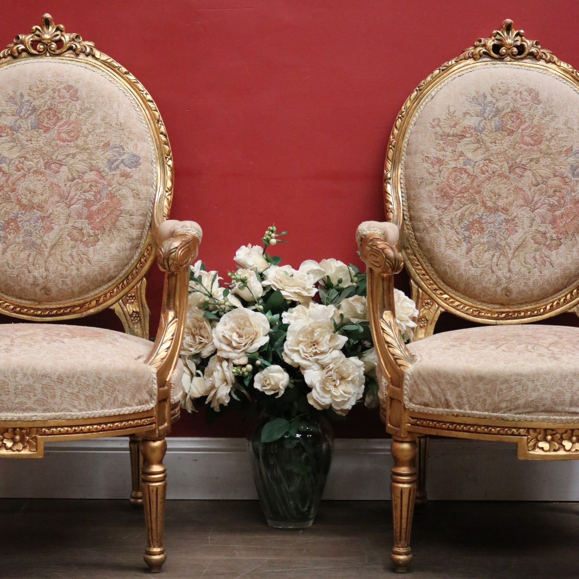 Upholstered in floral tapestry fabric, these chairs combine decorative charm with comfort. The gilt finish shows gentle ageing that highlights their character and authenticity. Perfect as statement pieces in a living room, salon or collector’s interior, they embody the grace and craftsmanship of French design.