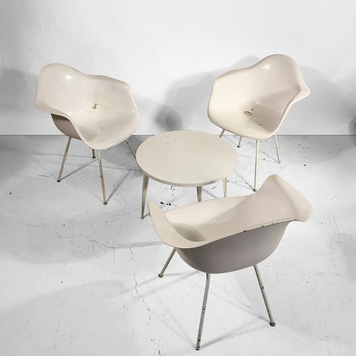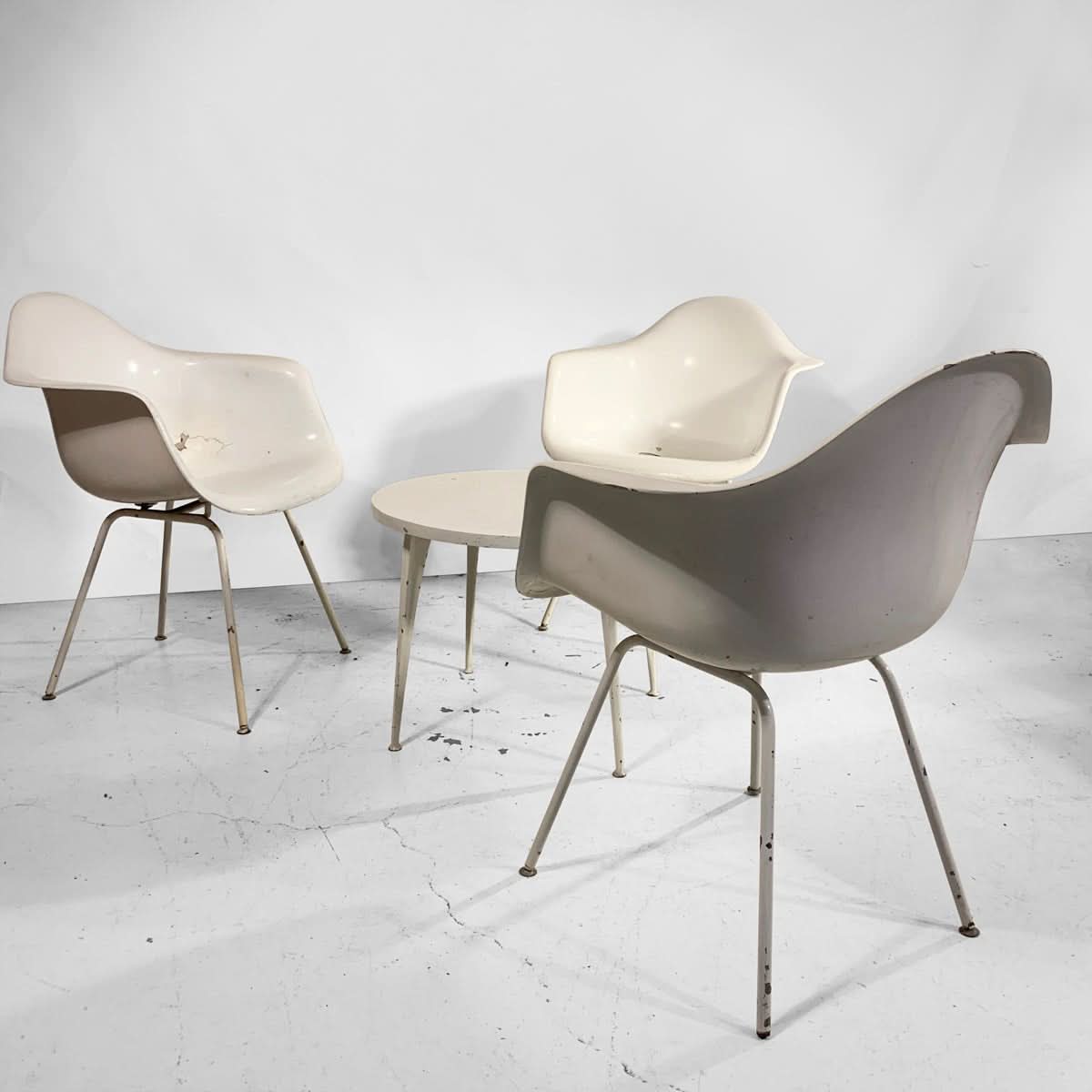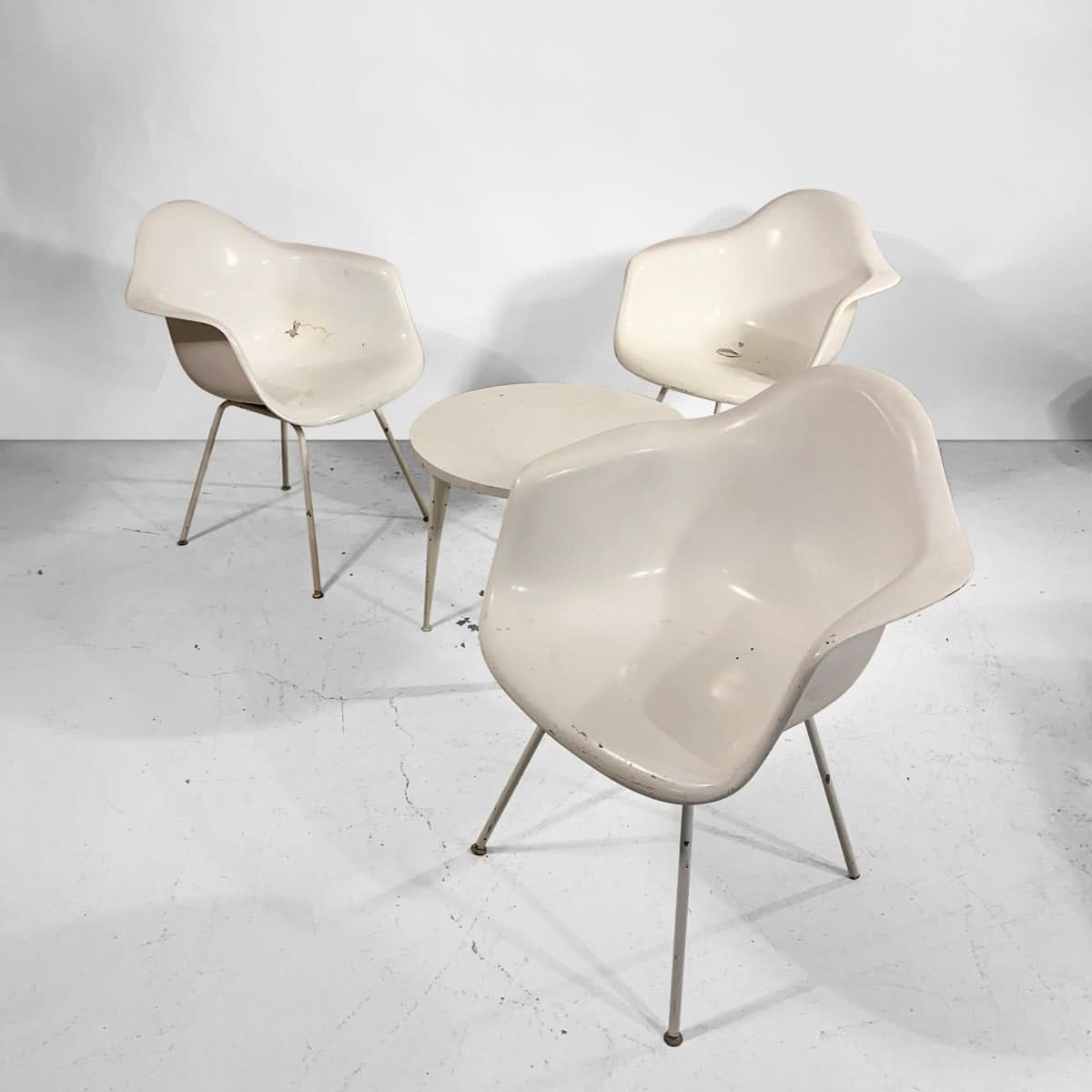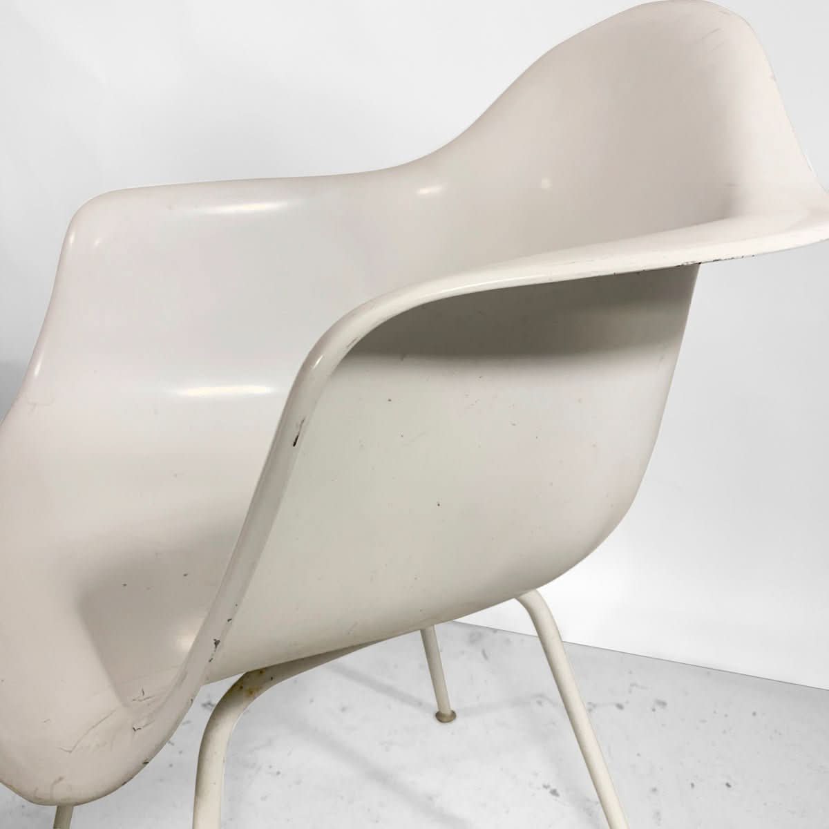 The original first generation of the Eames dining chairs were released in 1950 and were known as the Eames DAX Chair –Dining (D) Arm Chair (A) on X Base (X). “The DAG was added to the series in 1954 and was exact to the DAX only with longer rear legs to ‘guard’ the shell against wall impact and thus the Dining (D) Height, Arm (A) Chair on Guard (G) base was born. It is also worth noting that Herman Miller replaced the X base in 1954 with what was later to be termed the ‘H’ base, which was more versatile and aesthetically more appealing and thinner. The later DAG therefore only appeared in the H base but the abbreviated name for the chairs was kept the same to avoid confusions.”