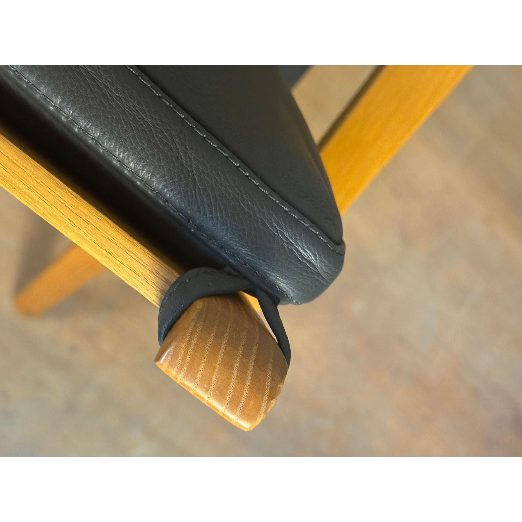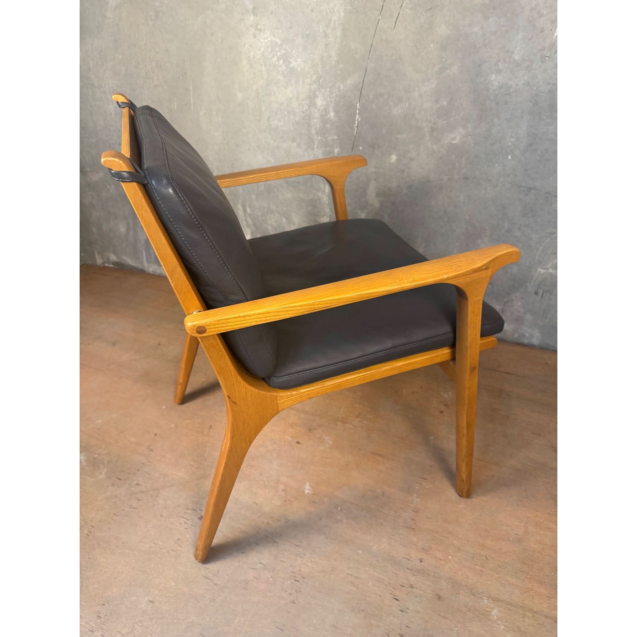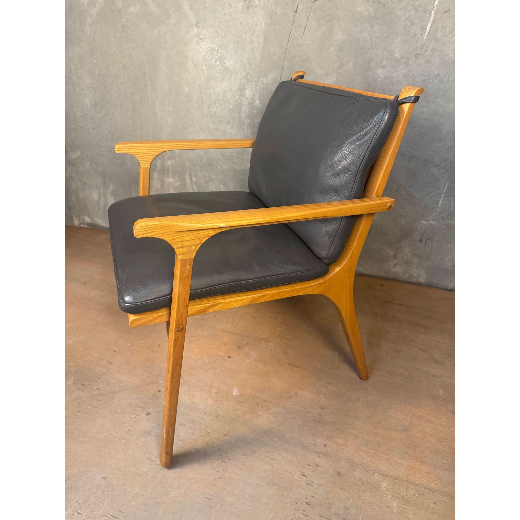 These exquisite and highly sought-after designer chairs embody elegance and meticulous craftsmanship. Rooted in the Danish Modern style, they seamlessly blend form and function, showcasing Nordic minimalism influenced by Japanese and Chinese design heritage. Crafted from oak and charcoal leather, the Ren lounge chairs offer a timeless appeal suitable for both residential and commercial spaces. While pre-loved, they remain in good condition with minor scuff marks on the legs and arms, which are likely to diminish with care. Four chairs are currently available.