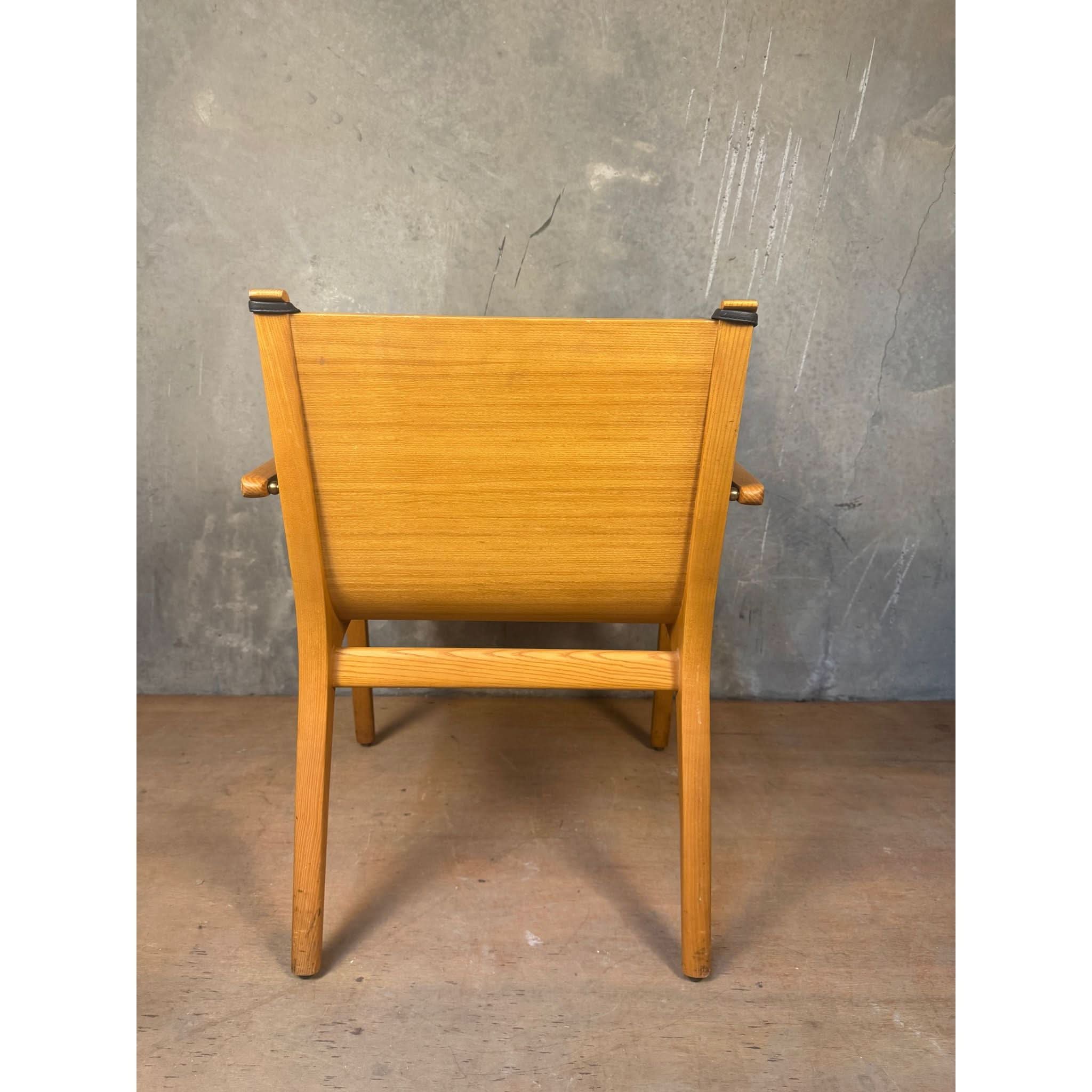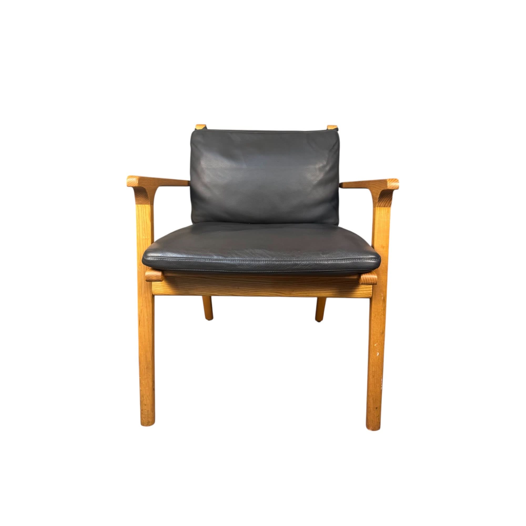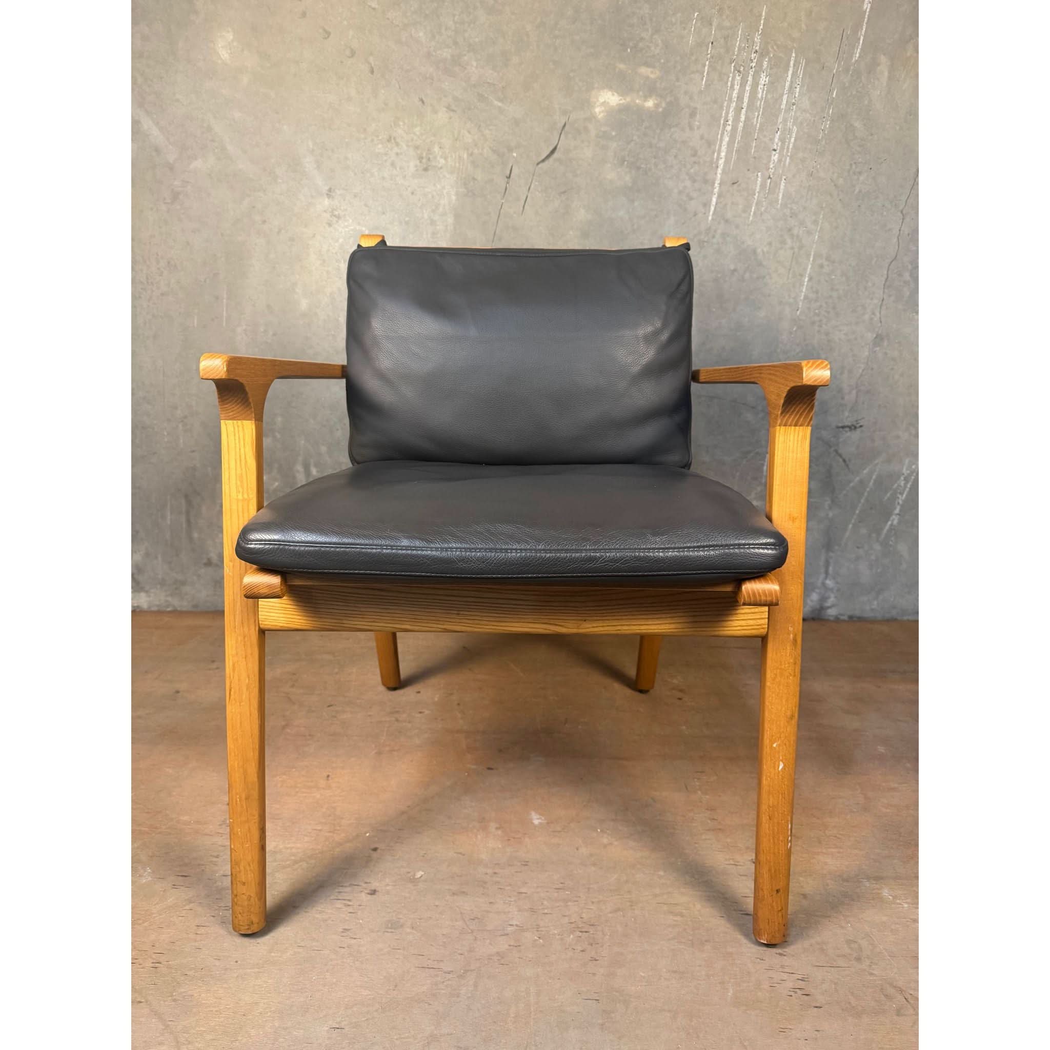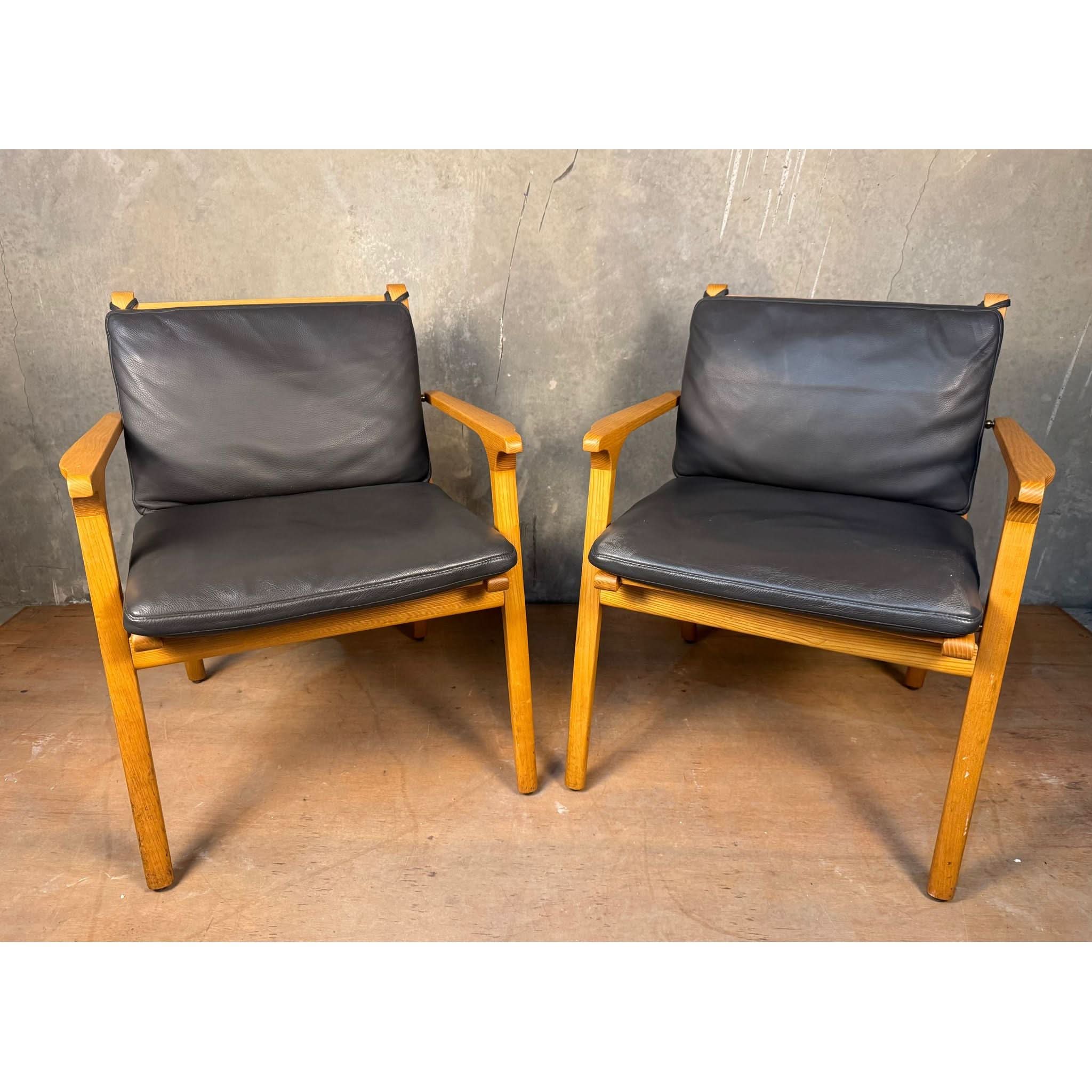 These exquisite and highly sought-after designer chairs embody elegance and meticulous craftsmanship. Rooted in the Danish Modern style, they seamlessly blend form and function, showcasing Nordic minimalism influenced by Japanese and Chinese design heritage. Crafted from oak and charcoal leather, the Ren lounge chairs offer a timeless appeal suitable for both residential and commercial spaces. While pre-loved, they remain in good condition with minor scuff marks on the legs and arms, which are likely to diminish with care. Four chairs are currently available.